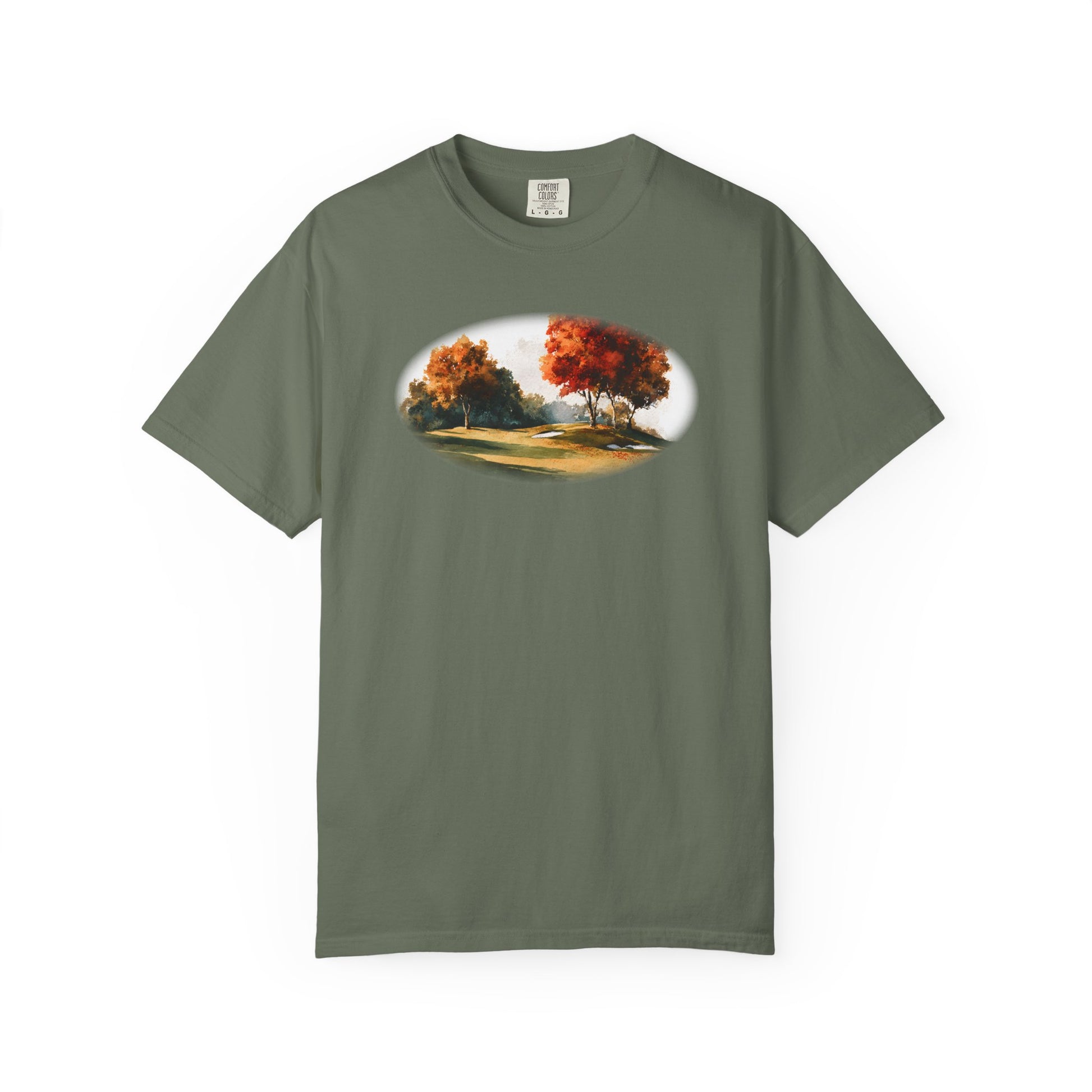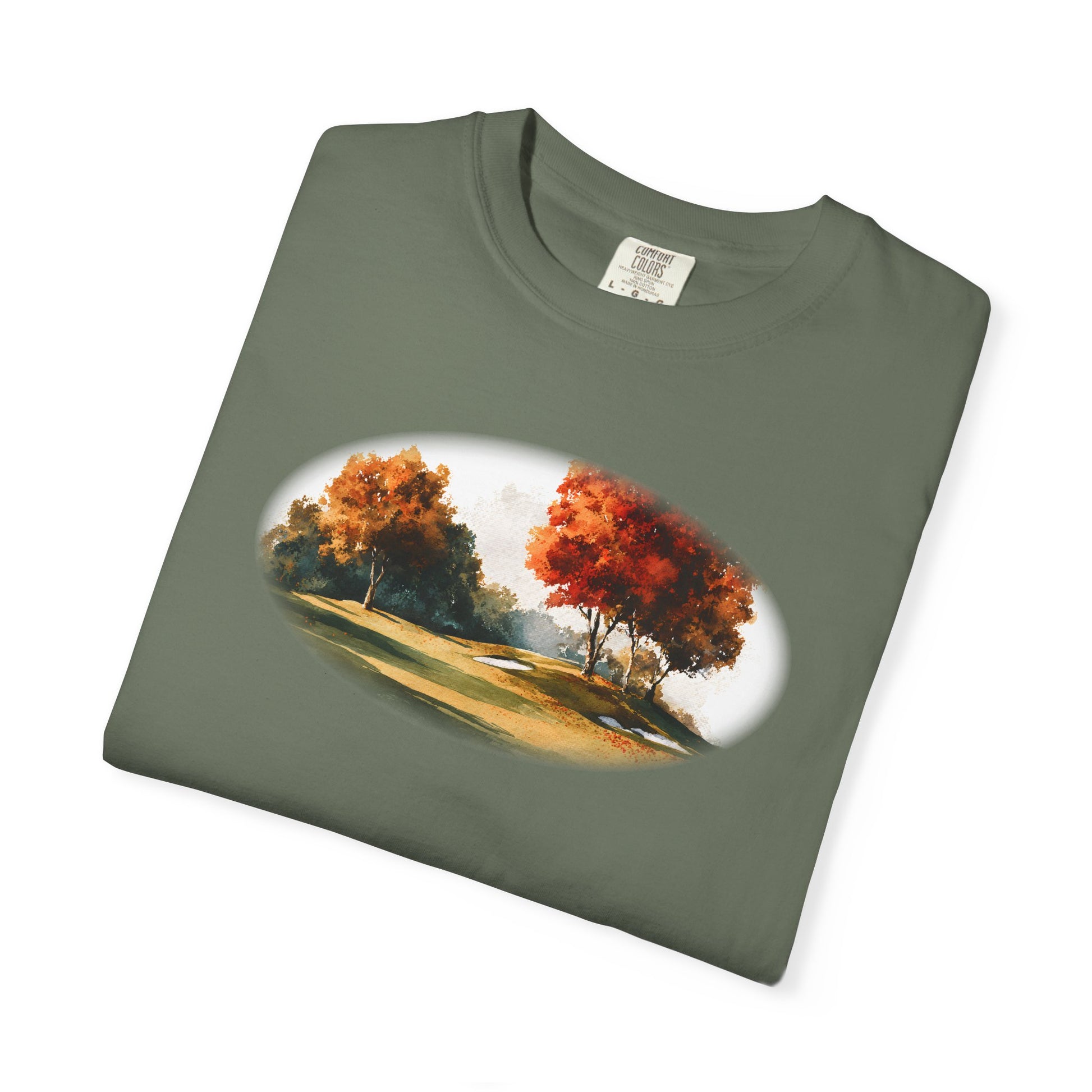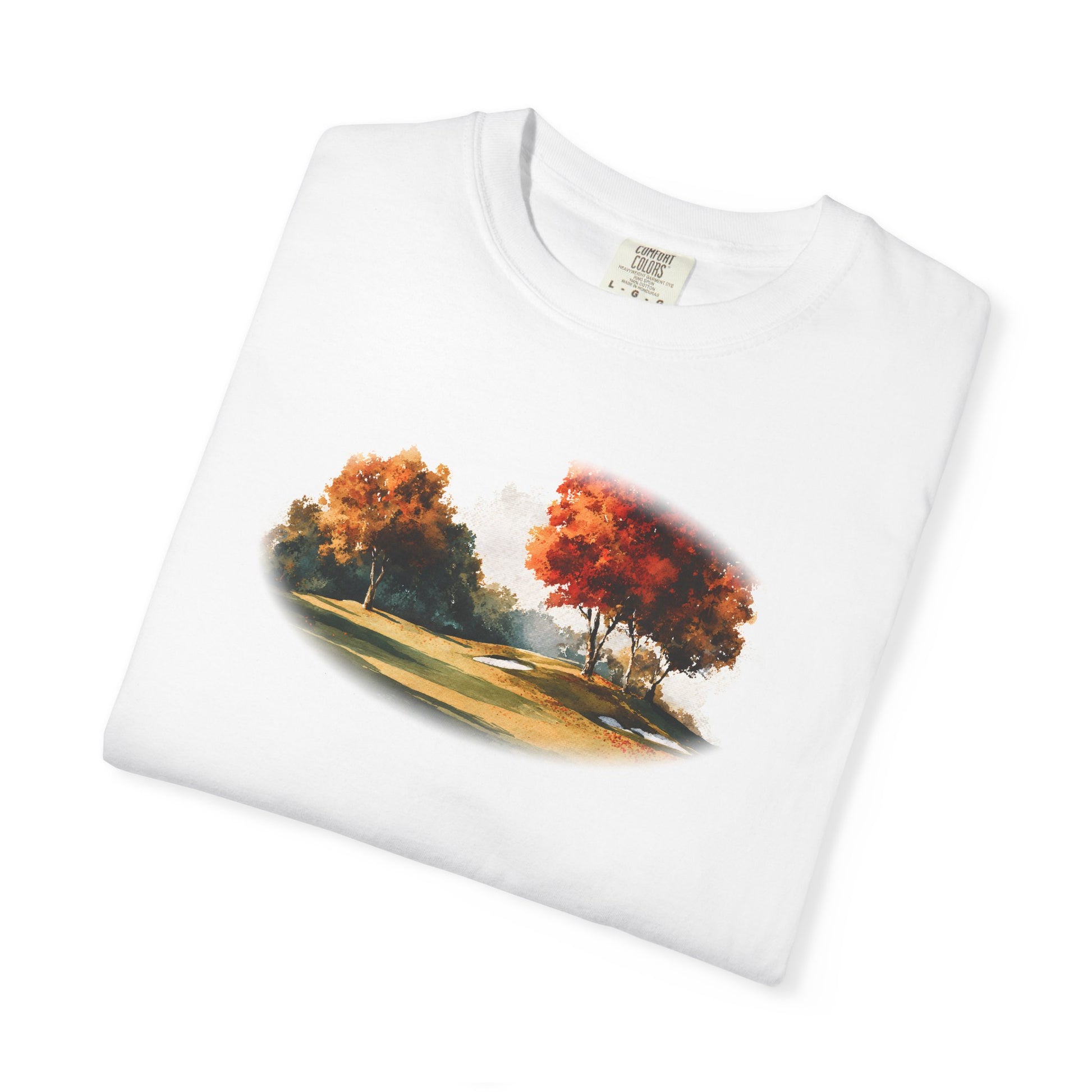 Golden leaves, crisp air, and the perfect round. The Autumn Fairway tee features a watercolor-style illustration of fall trees framing the course, capturing the cozy beauty of golf in the changing season. A timeless design for golfers who love teeing it up when the colors turn.
