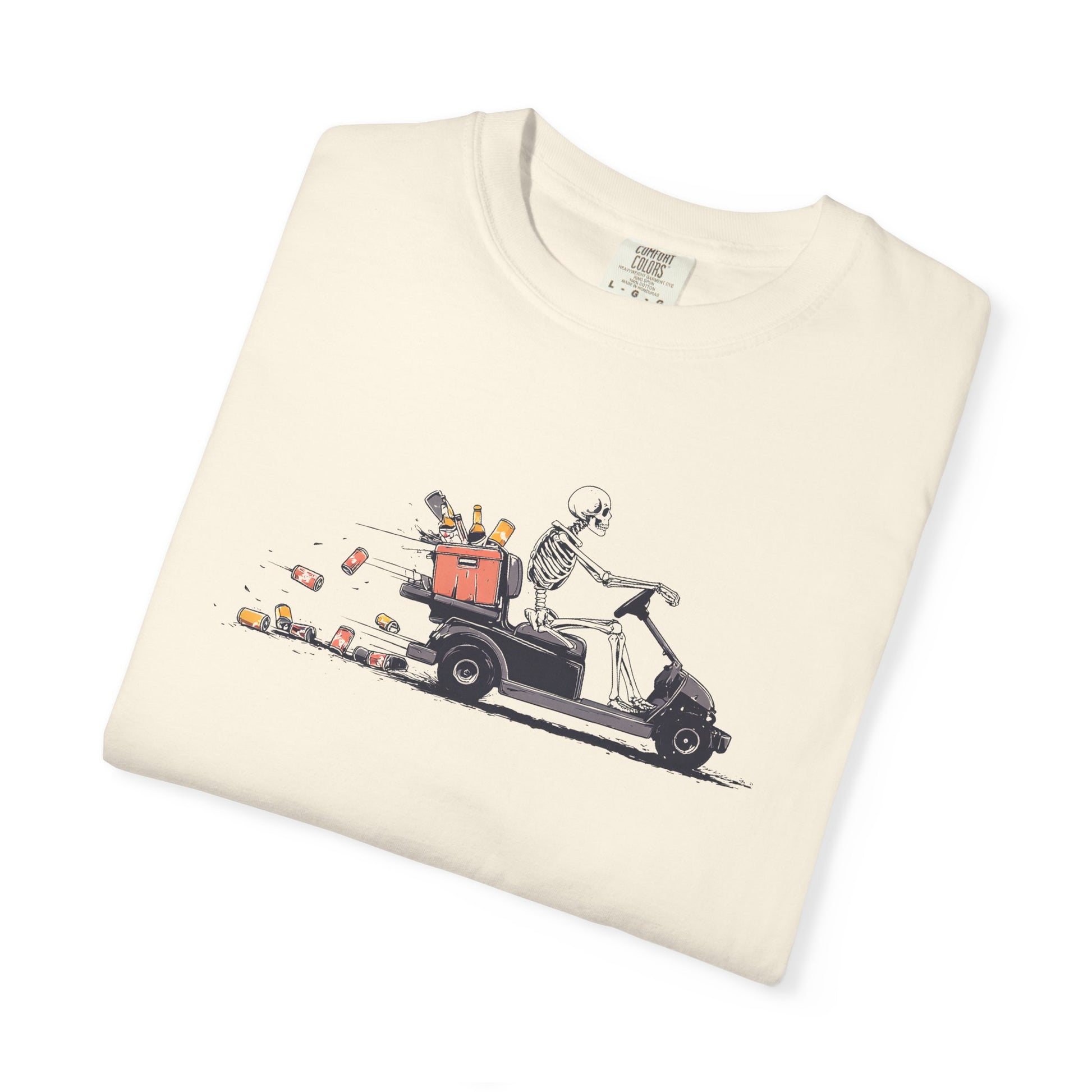 Keep the good times rolling with the Booze Cruise skeleton tee. Featuring a skeleton speeding down the fairway with a cooler full of beer cans flying, this design brings humor and energy for golfers who know the best rounds come with a cold drink in hand.
