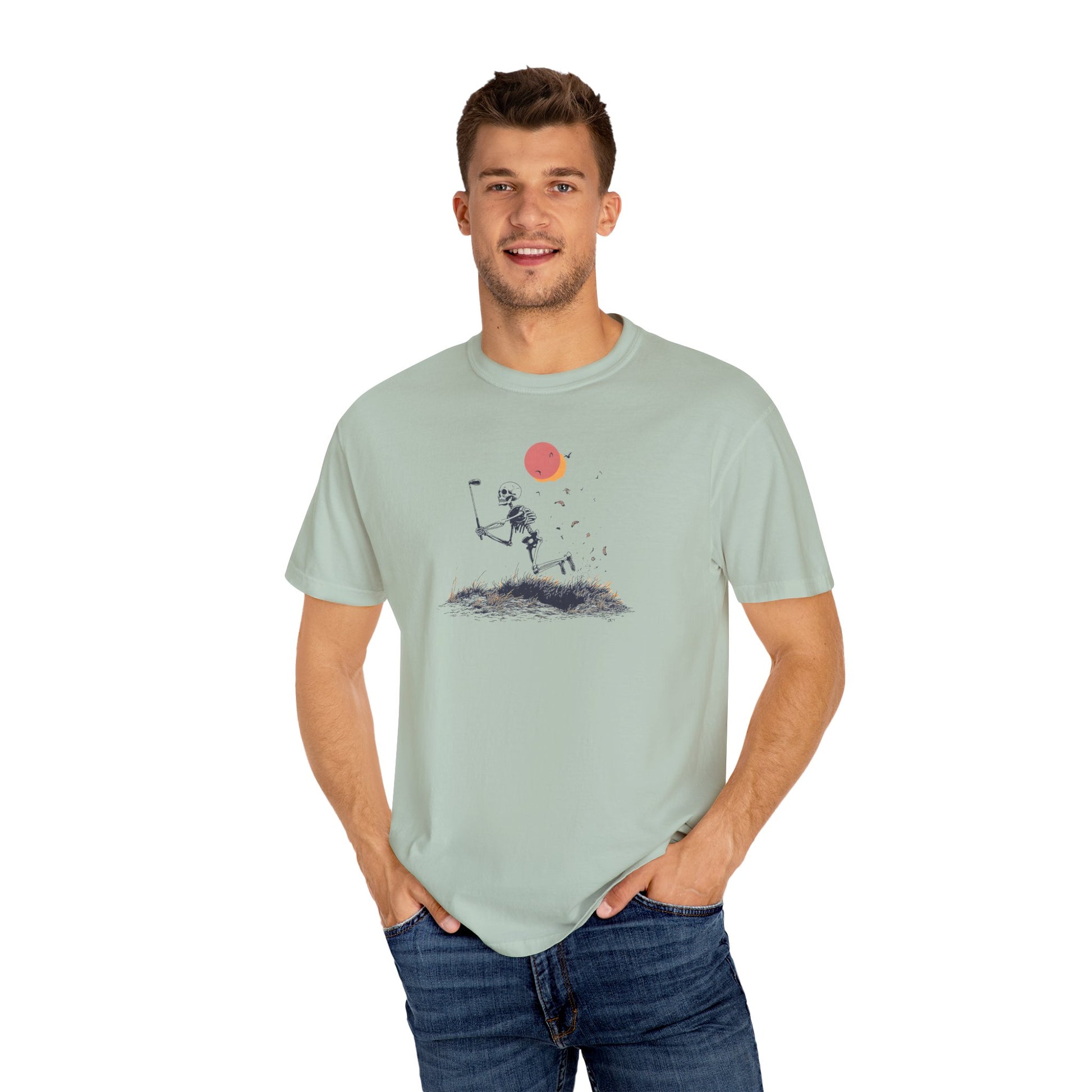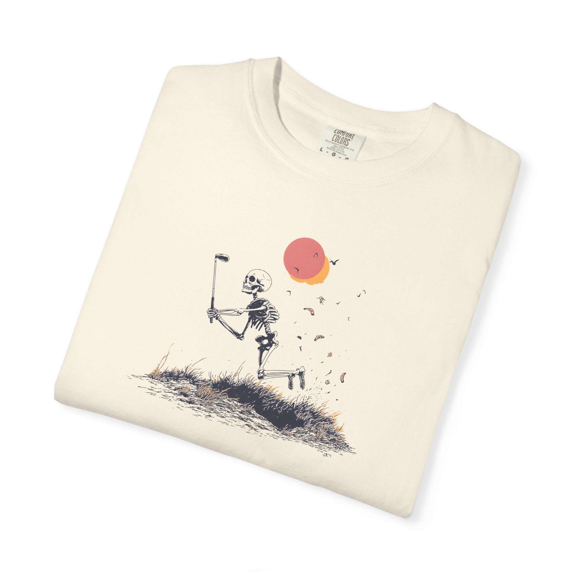 Dig yourself out in style with the Bunker Bones skeleton tee. Featuring a skeleton blasting a shot from the sand against a glowing sunset, this design blends humor and grit for golfers who know the struggle of the sand trap all too well.