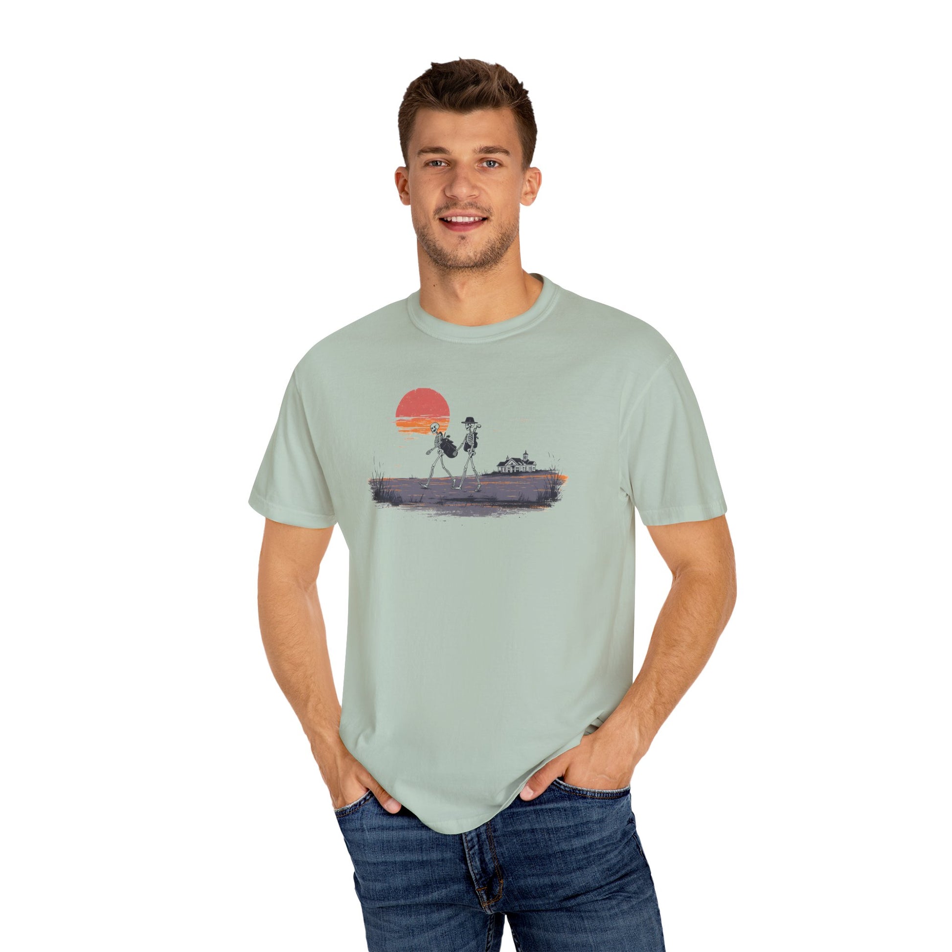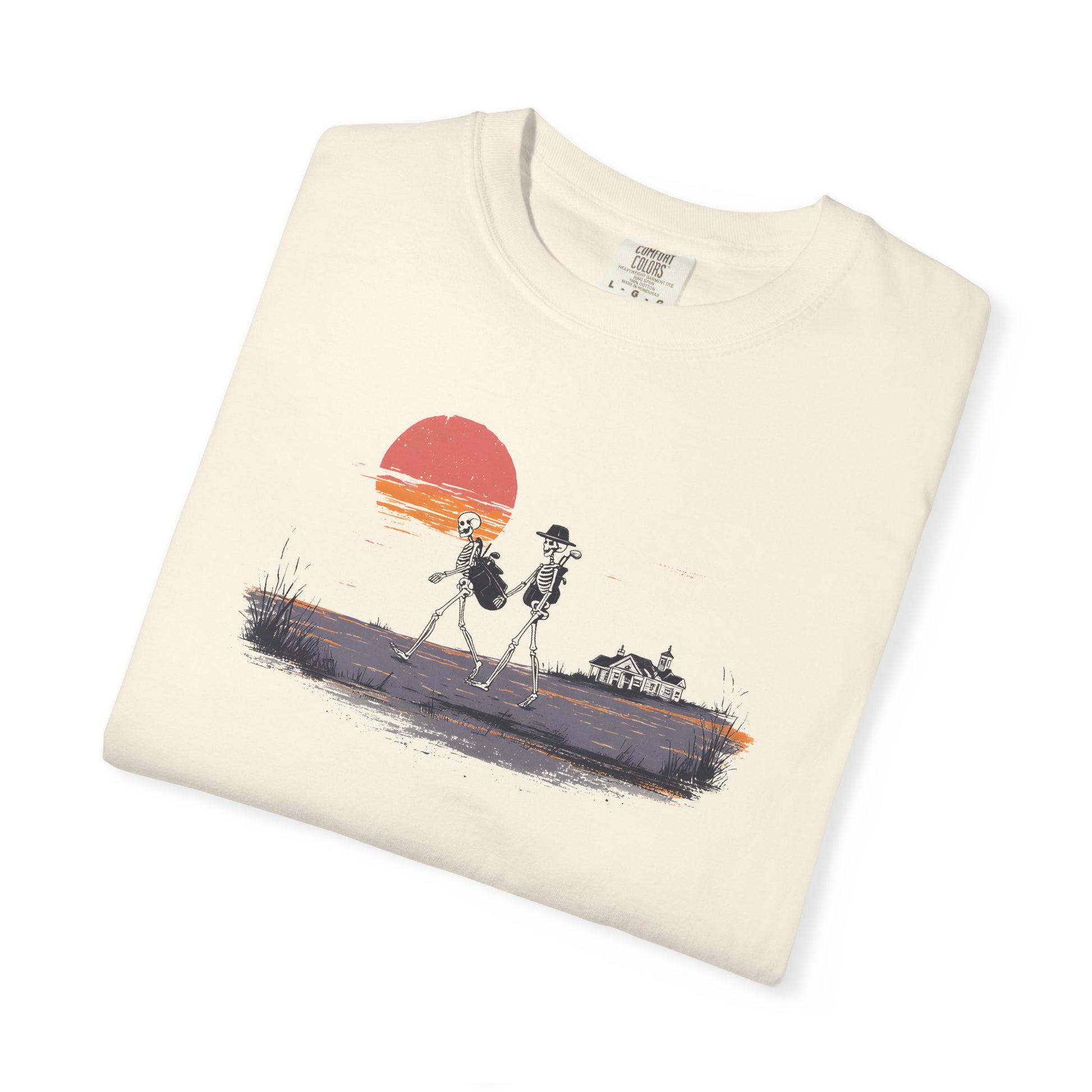 Carry the game a little further with the Caddie Corpse tee. Featuring two skeletons strolling the fairway at sunset, this design pairs humor with old-school golf tradition for players who know the walk is half the story.