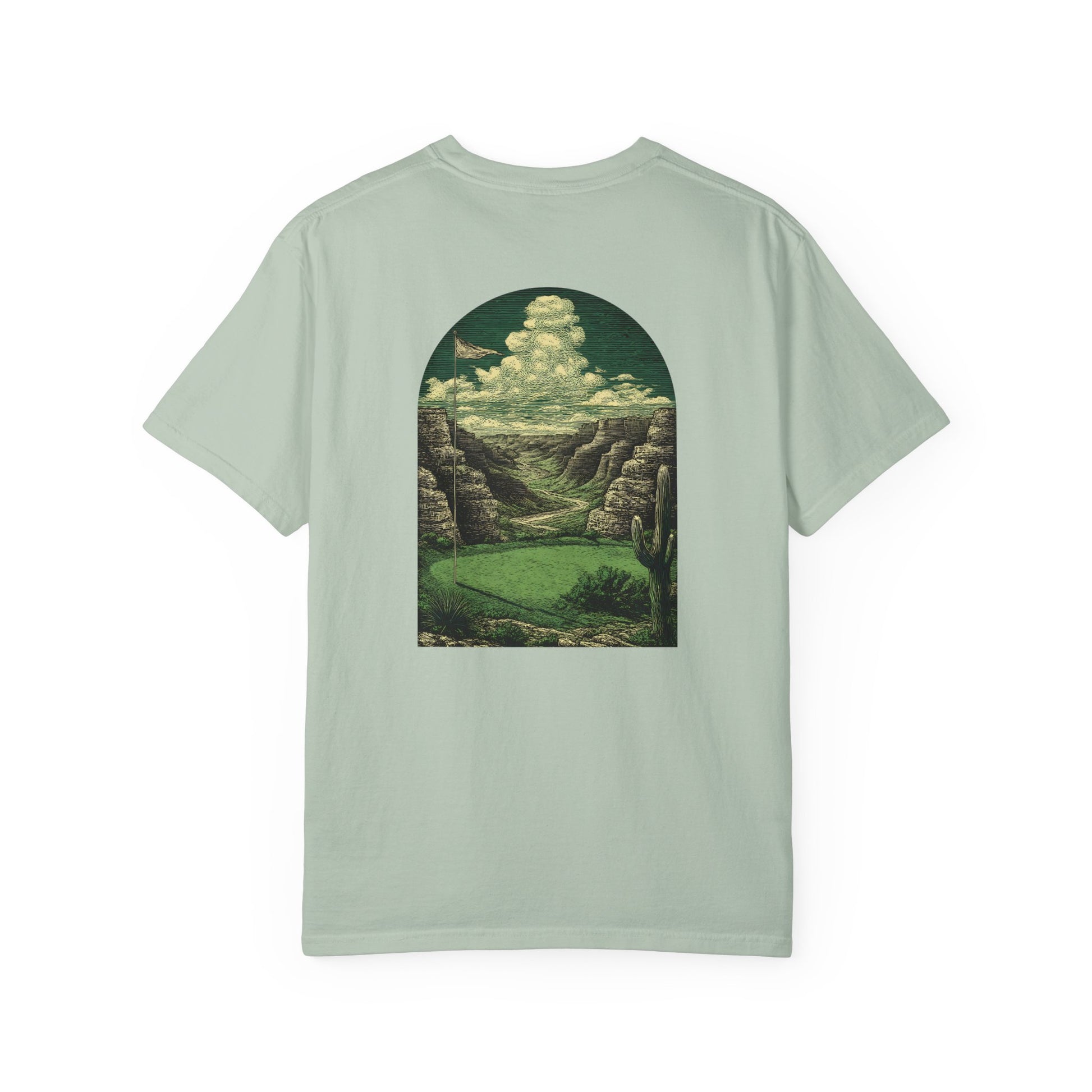 The Canyon Swing tee captures the drama of desert golf with sheer cliffs rising around a sunlit green. Rugged, bold, and timeless, this design embodies the challenge of playing in nature’s harshest terrain.