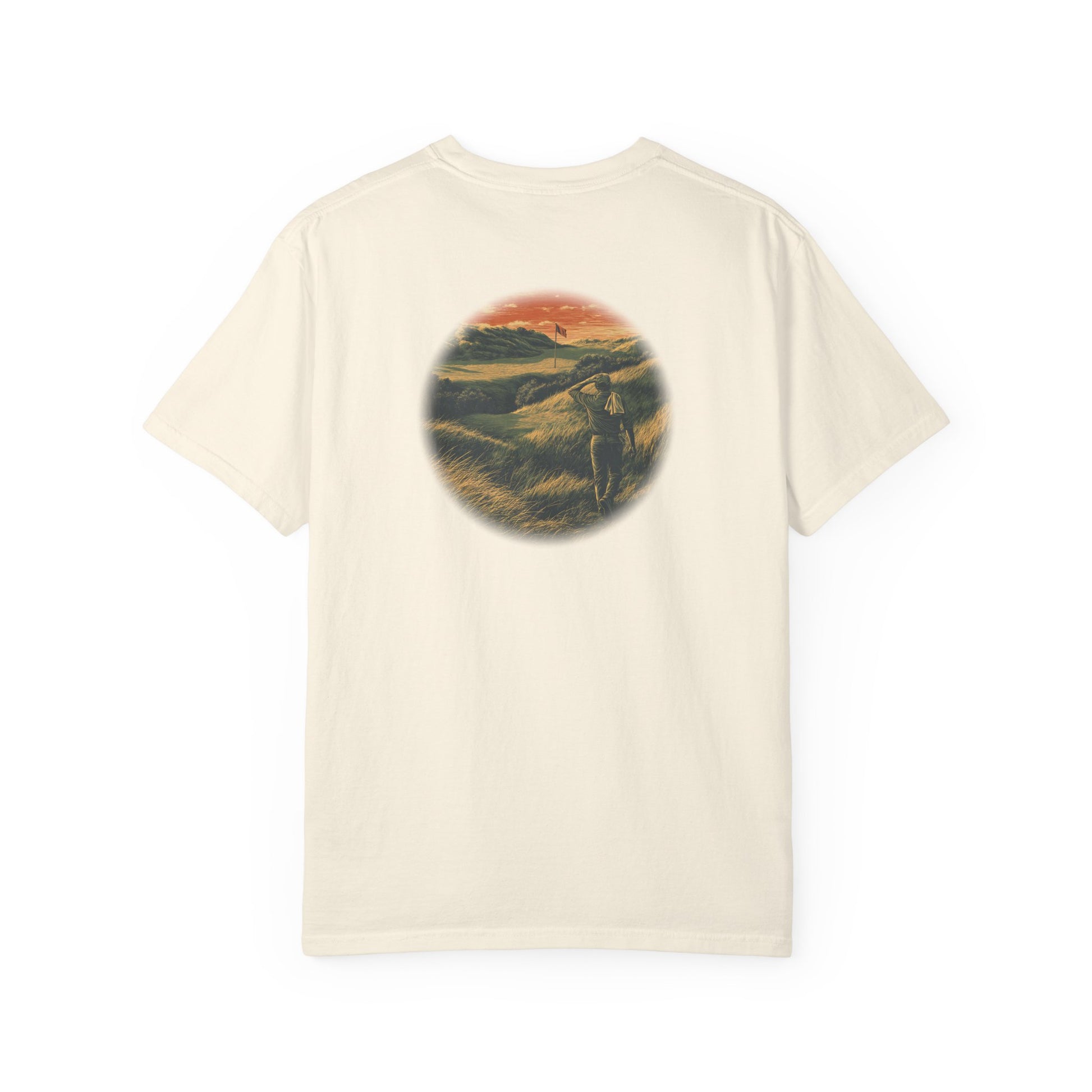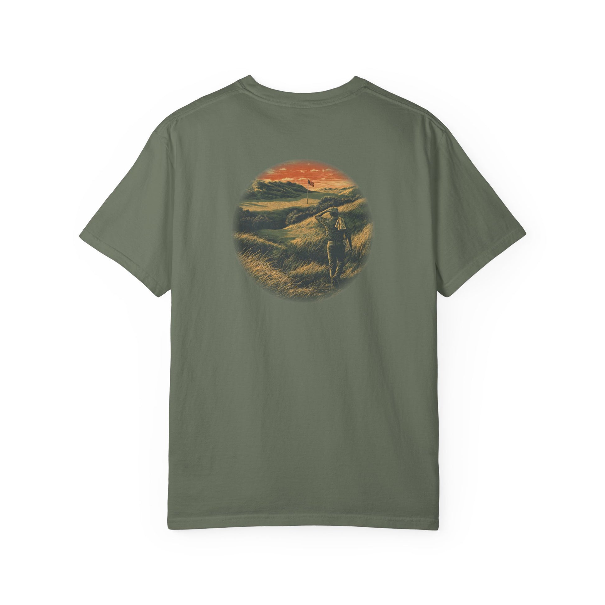 A golfer strides through tall windswept grass, eyes locked on the distant flag against a fiery sunset. This vintage-inspired piece captures the determination and grit of the game’s toughest rounds.