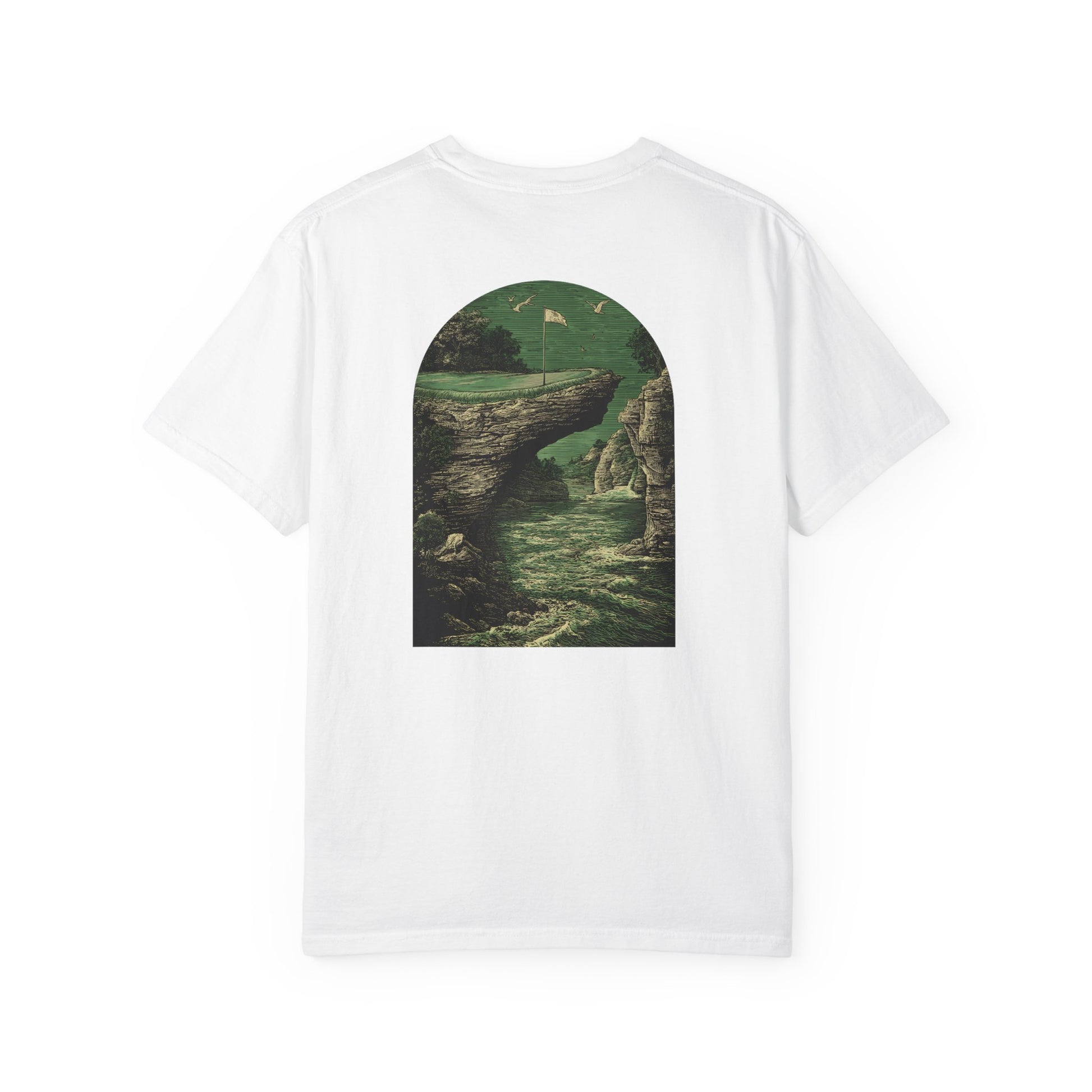 Follow the winding path down to the shore with the Coastal Descent tee. Illustrated in vintage tones, this design highlights the rugged journey toward a seaside green, perfect for golfers who thrive on adventure.