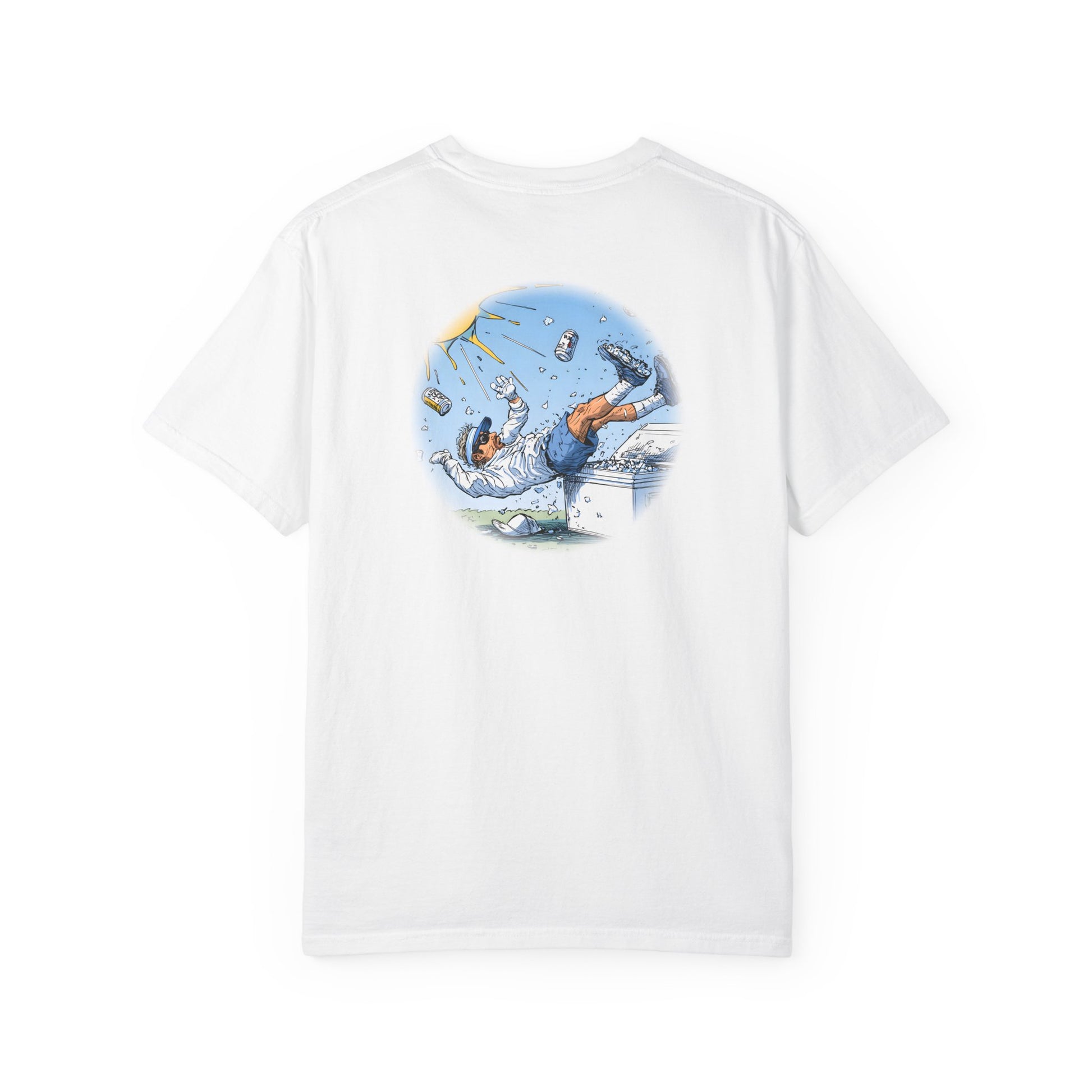 Sun’s out, cans out—this unlucky golfer takes a spill straight into the ice chest, sending drinks flying in every direction. A lighthearted cartoon tee that captures the wild side of post-round refreshments on the course.