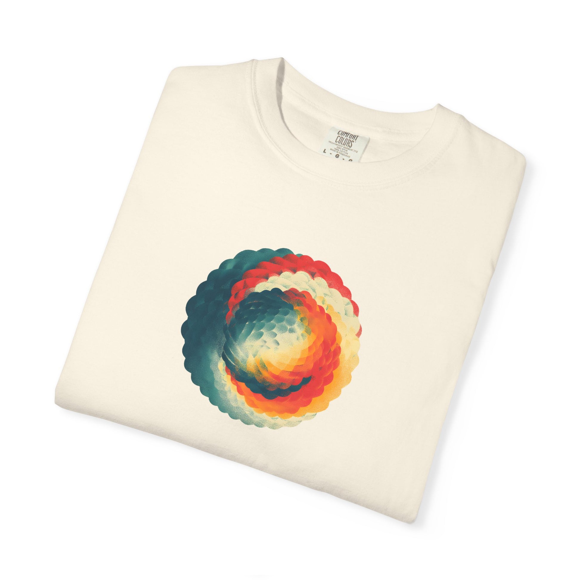 A hypnotic swirl of bold vintage colors spirals into a golf-ball form, blending retro textures with a trippy, dreamlike vibe. Ideal for golfers who like their style as bold as their game.