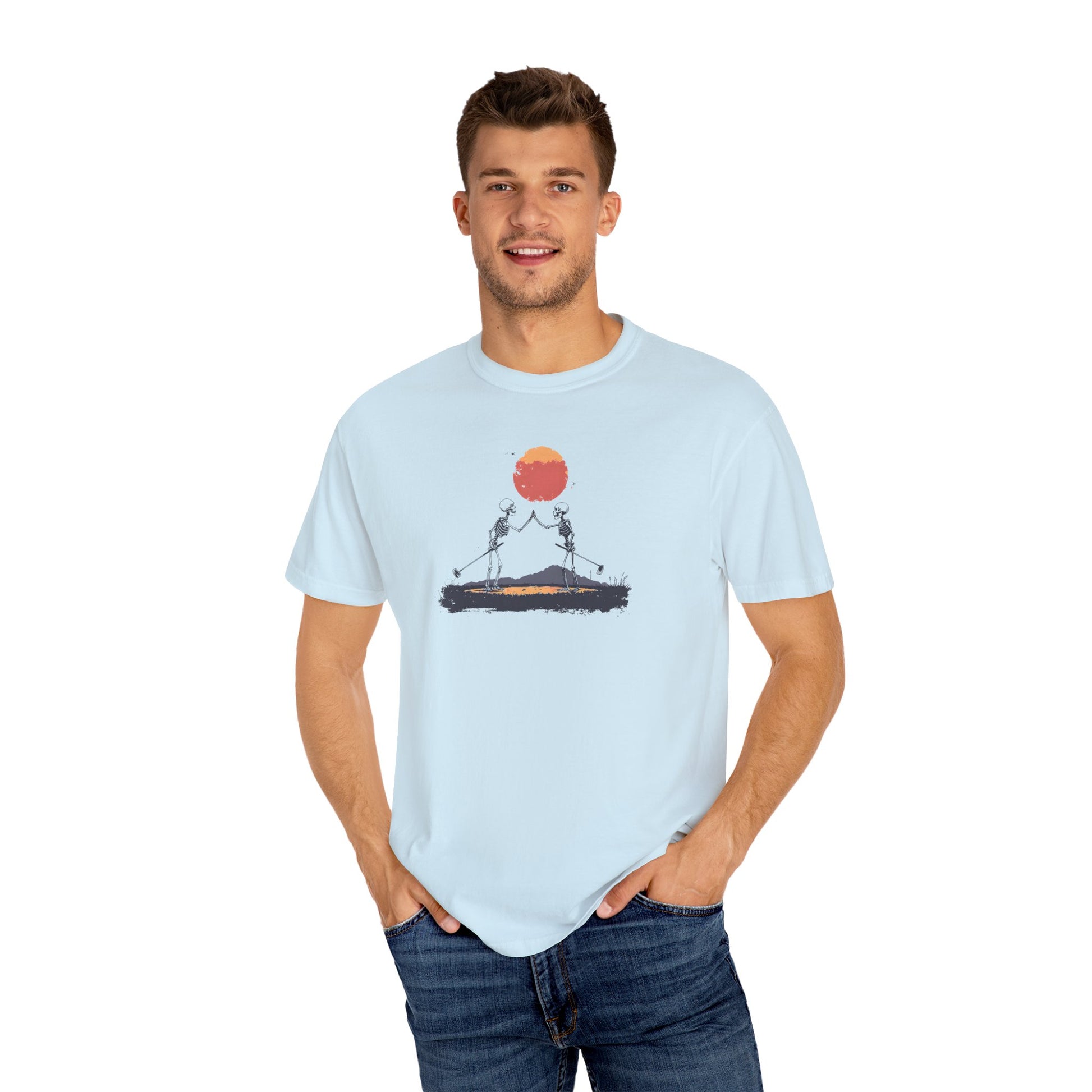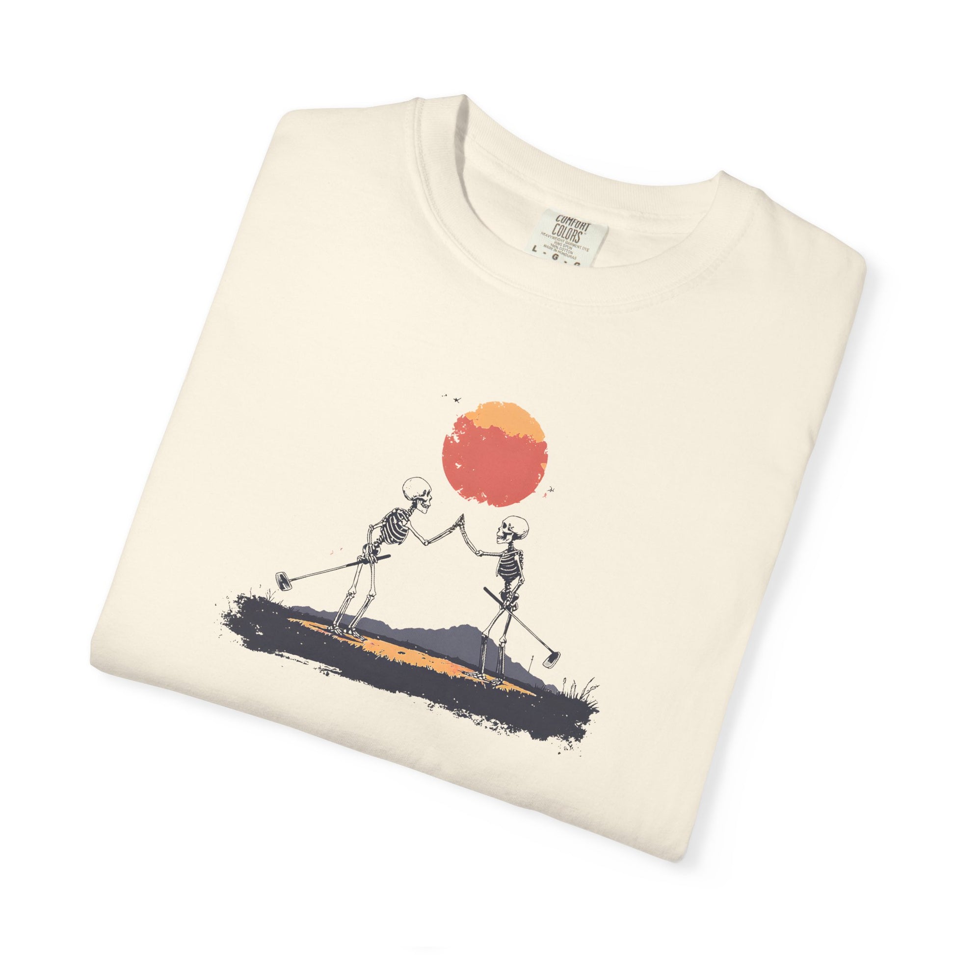 Share the spirit of the game with the Dying for a Good Game tee. Featuring two skeletons high-fiving under a glowing sunset, this design mixes humor and camaraderie for golfers who know every round is worth celebrating.