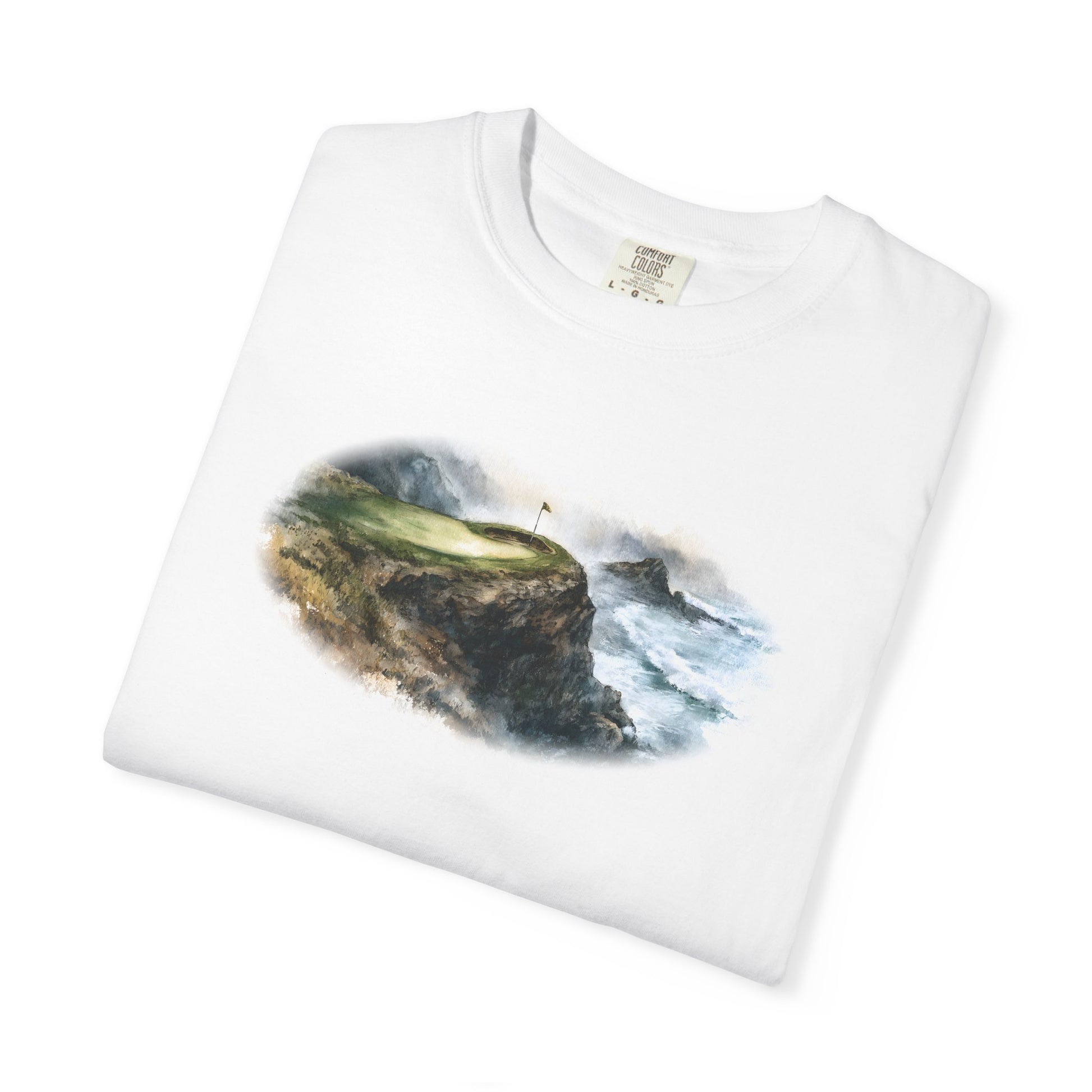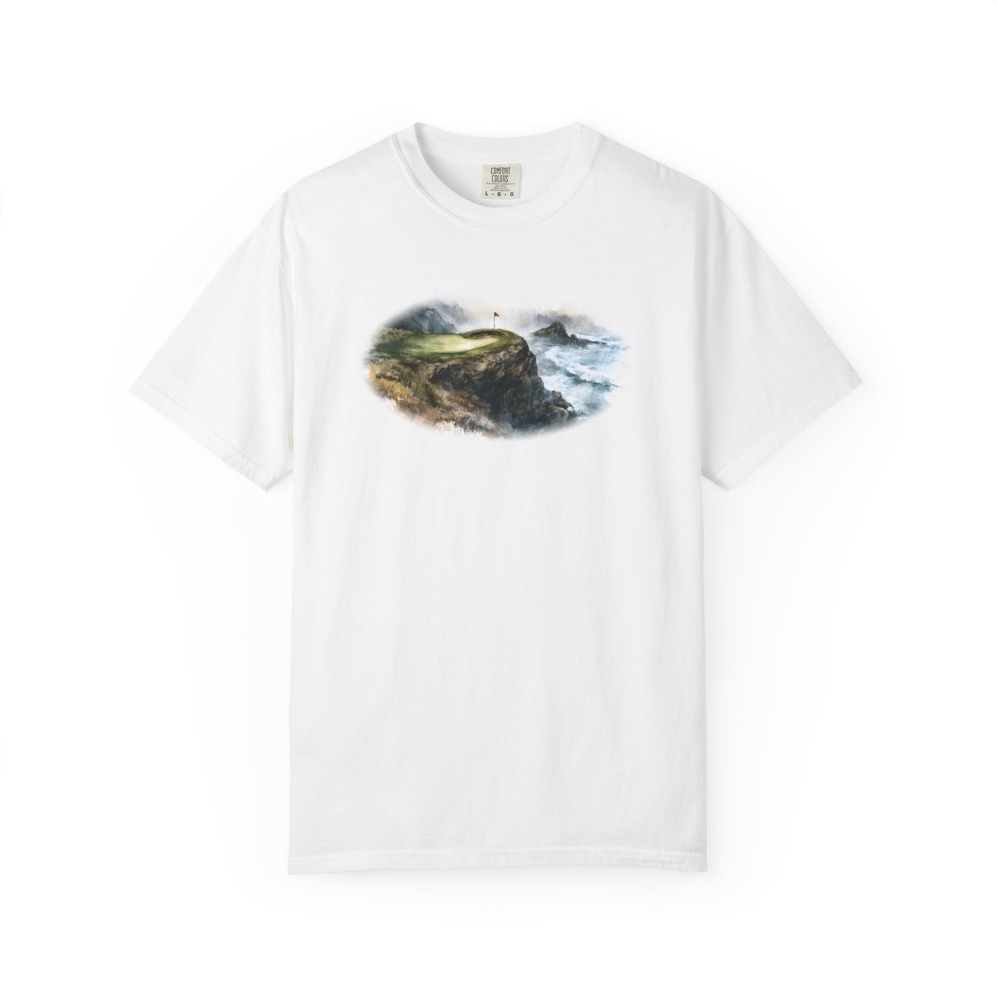 Perched above crashing waves, the Edge of Glory tee captures the thrill of golf played on nature’s edge. With a misty cliffside green and storm-kissed seas, this oil-painted design blends beauty with danger — a tribute to the holes that take your breath away.