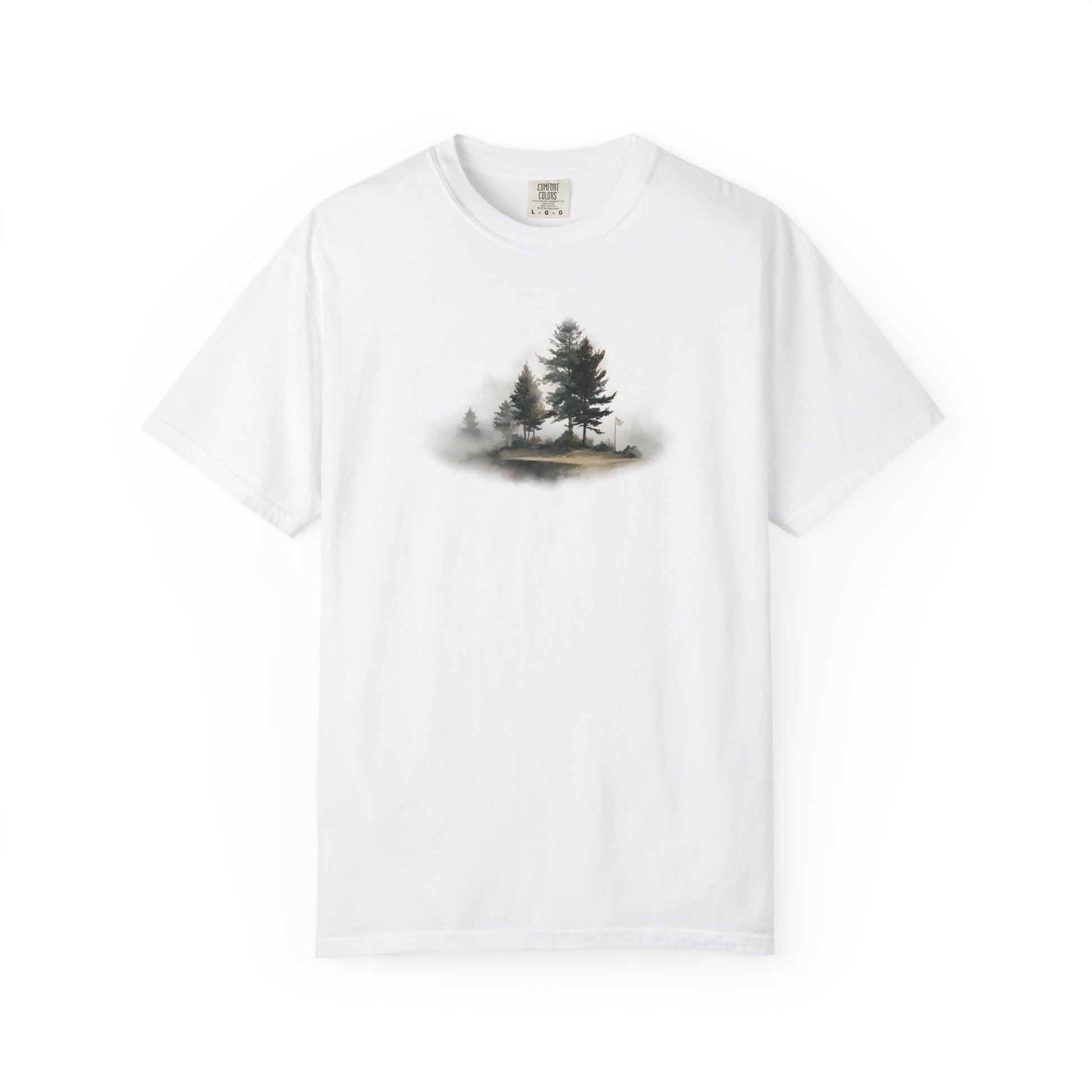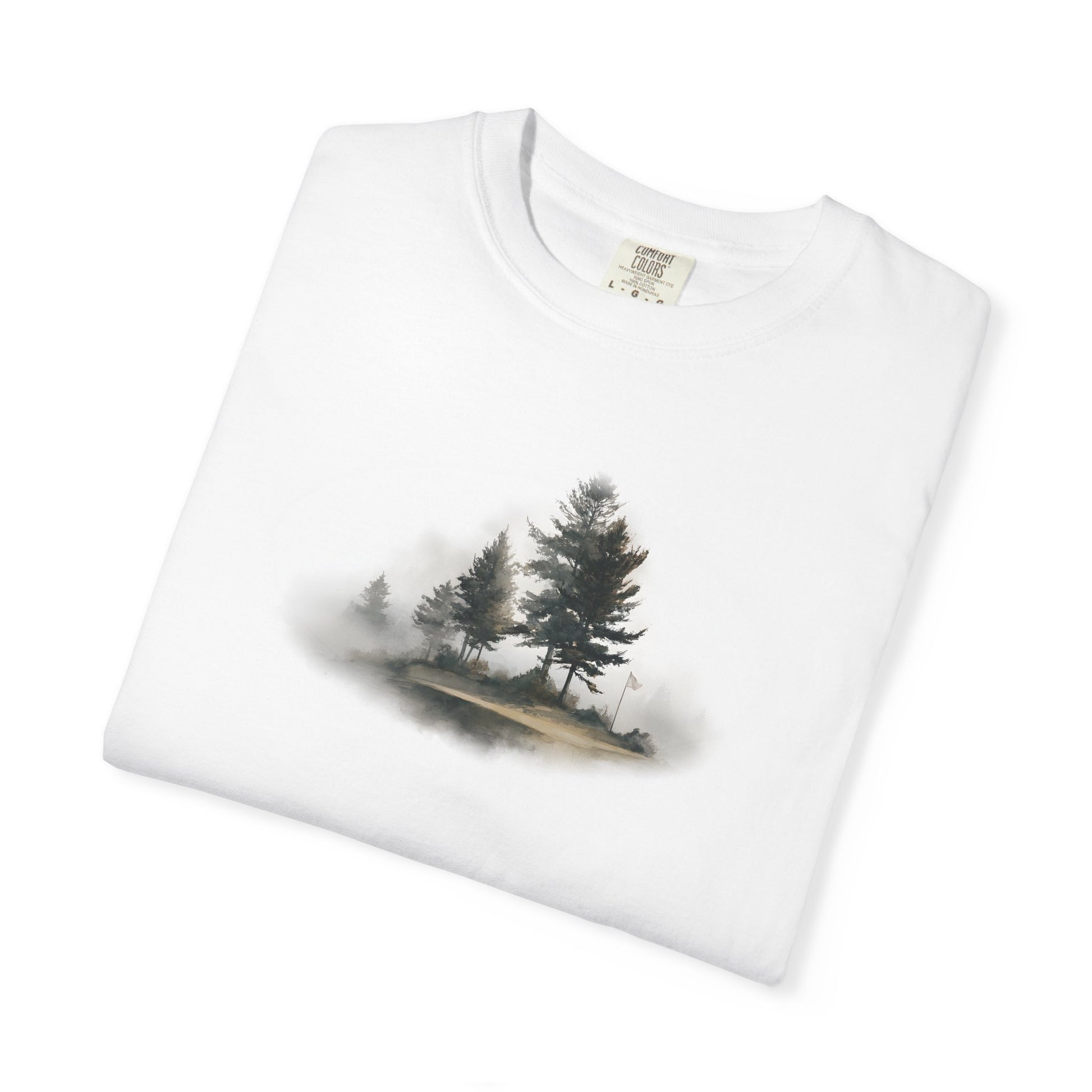 Wrapped in mist and silence, the Evergreen Veil tee captures the haunting beauty of golf among the pines. With an oil-painted style of towering evergreens and a green hidden in the fog, this design evokes the mystery and calm of early rounds in the forest.