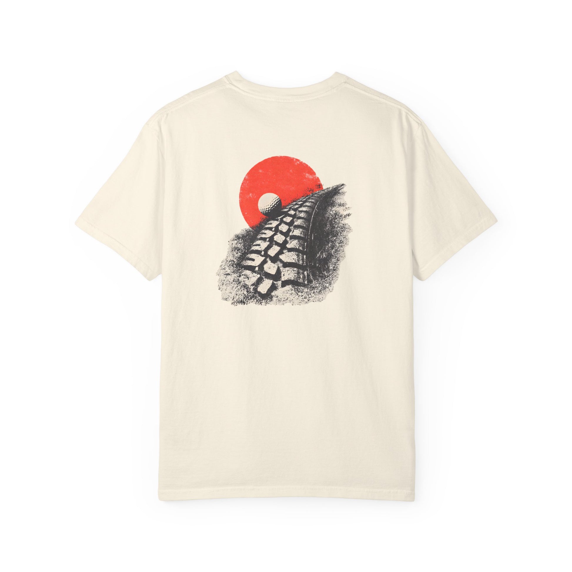 A bold retro graphic of a golf ball rolling down rugged tire tracks under a blazing red sun. Perfect for golfers who love the game as much as the journey off the beaten path.
