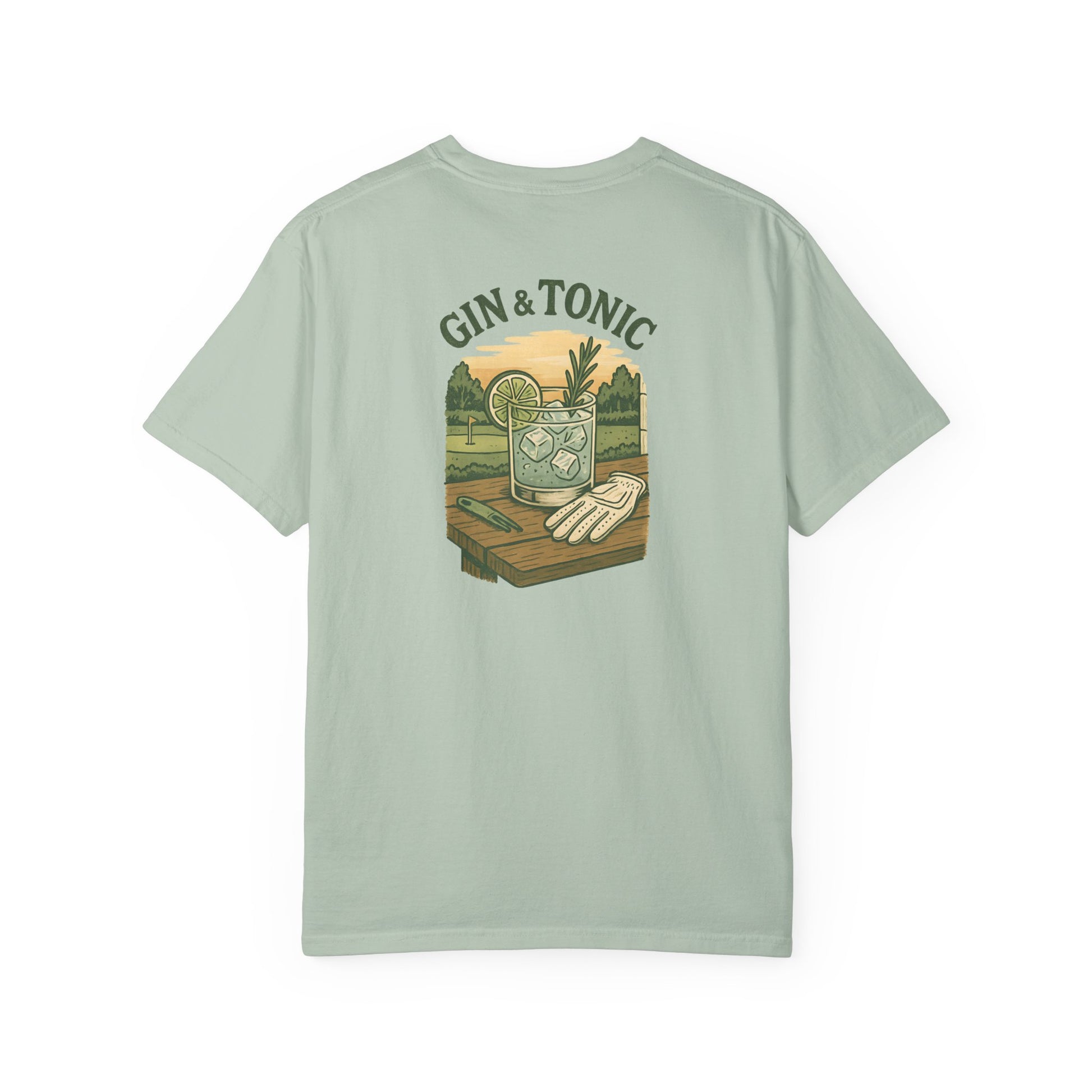 Tee off in style with this vintage-inspired Gin & Tonic golf shirt. Featuring a hand-drawn cocktail illustration resting on the tee box with a golf glove and scenic fairway backdrop, this design blends clubhouse charm with classic course vibes. Perfect for golfers who know the 19th hole is just as important as the first tee.