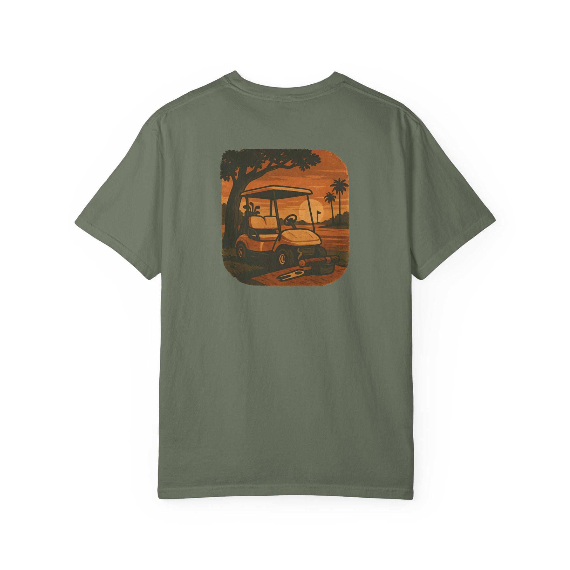Golden hour on the course never looked so good. This retro-styled tee captures the laid-back vibe of golf at sunset — complete with a cart, a cigar, and the promise of a smooth round. Designed with warm, vintage tones and textured details, it’s perfect for golfers who play as hard as they relax.