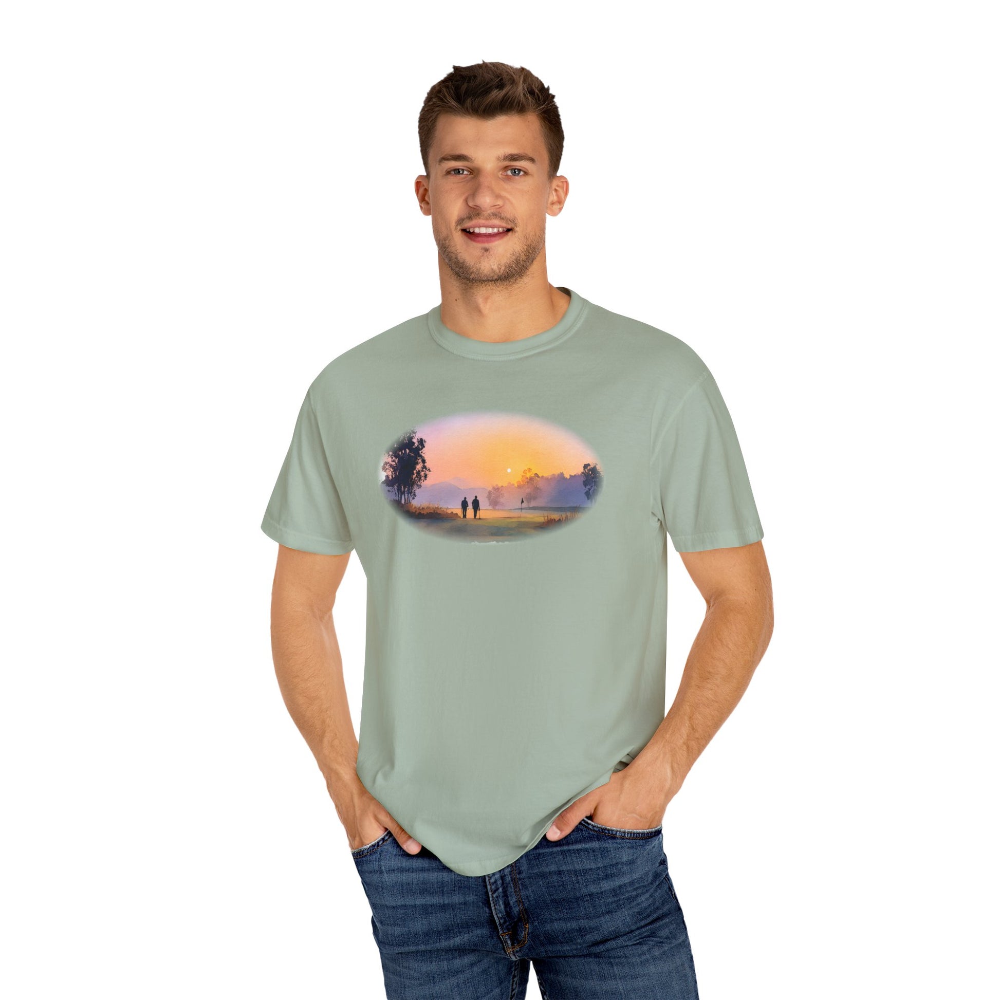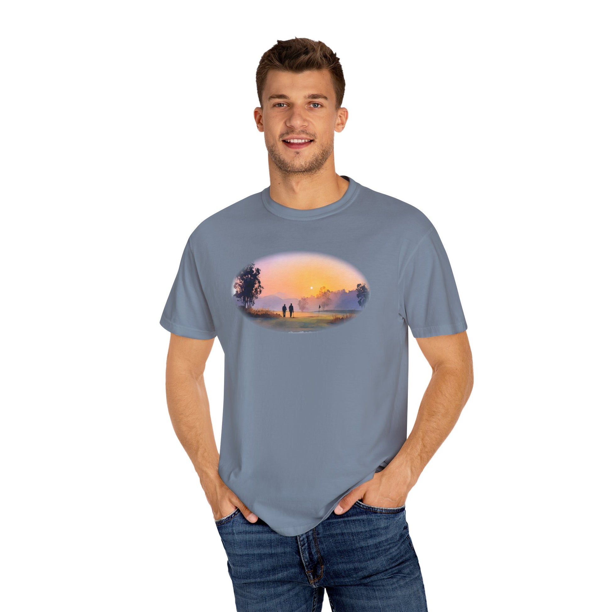 Beneath a setting sun, the Golden Round tee captures the beauty of the game shared with good company. With soft oil-painted tones of orange and violet, this design celebrates twilight golf — when the day winds down, but the memories last.