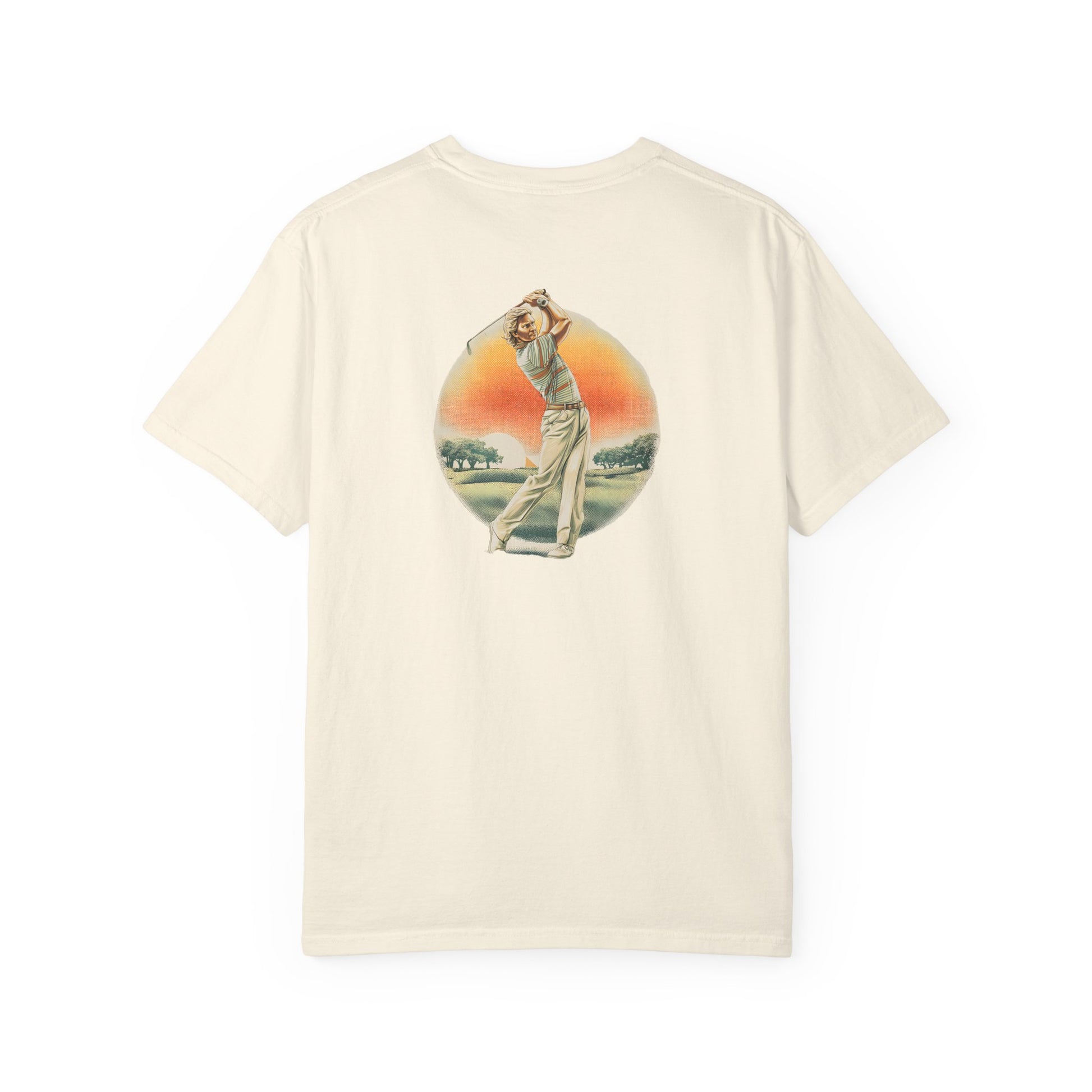 A retro-styled golfer finishes his drive against a warm sunset sky, radiating vintage confidence. The bold colors and classic look make it a standout for fans of timeless golf culture.