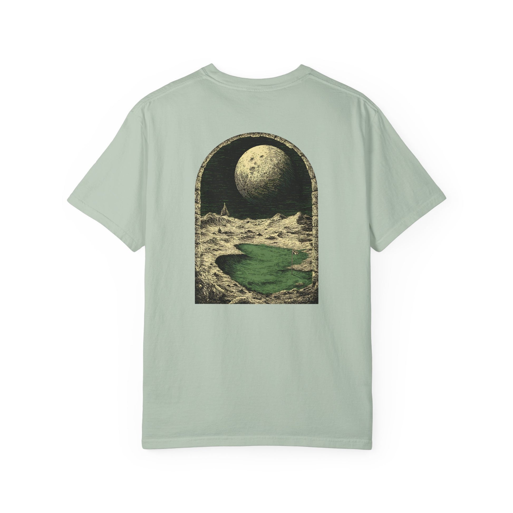 The Harvest Moon Fairway tee captures a glowing moon rising over a quiet fairway. Illustrated in vintage tones, it’s a design that celebrates the magic of twilight golf.