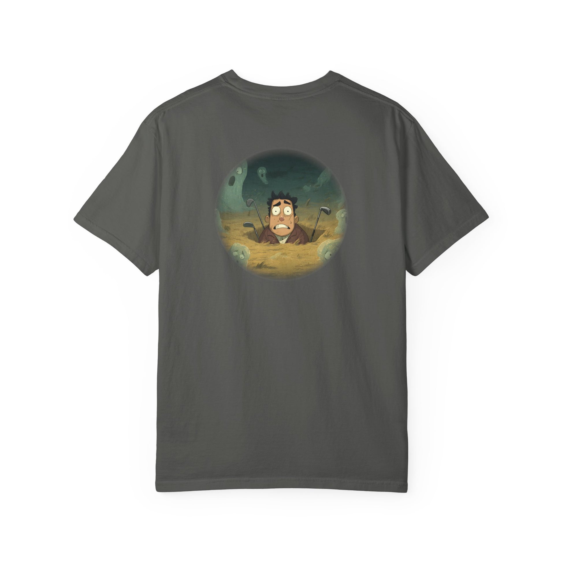 Stuck in the rough takes on a whole new meaning when ghostly figures rise from the fairway to watch your every swing. A playful yet eerie cartoon tee that’s perfect for golfers who know the game can get a little scary sometimes.