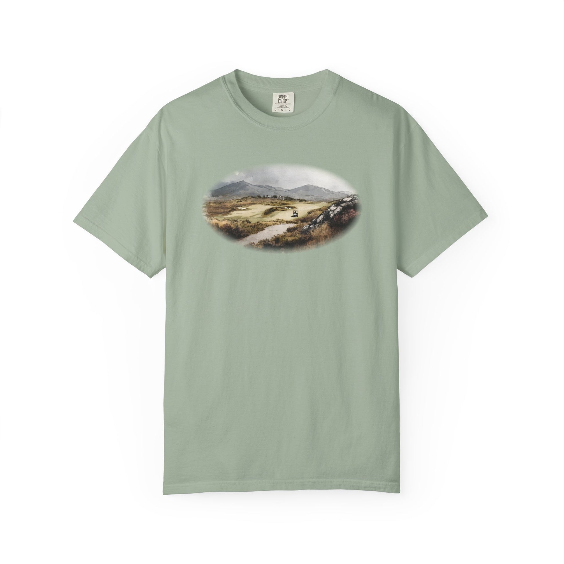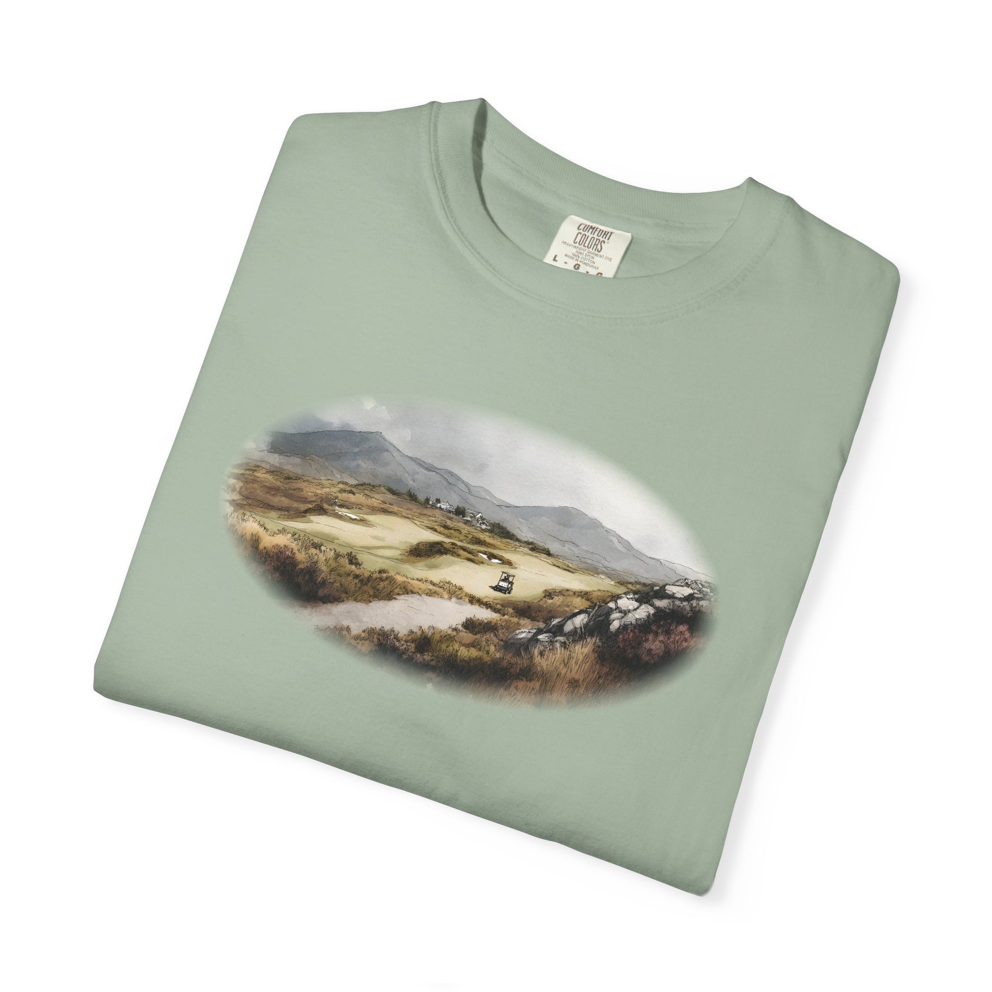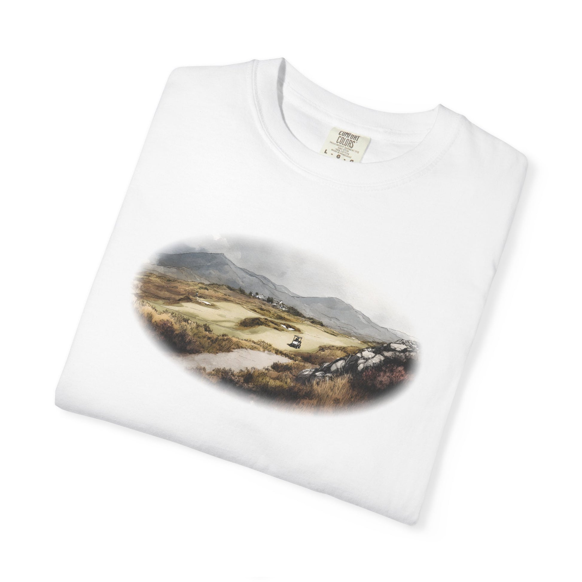 Rolling hills, rugged earth, and a green carved into the landscape — the Highland Approach tee celebrates the wild beauty of golf’s most untamed courses. Painted in earthy oil tones, it’s a design for players who love the game in its raw, natural setting.