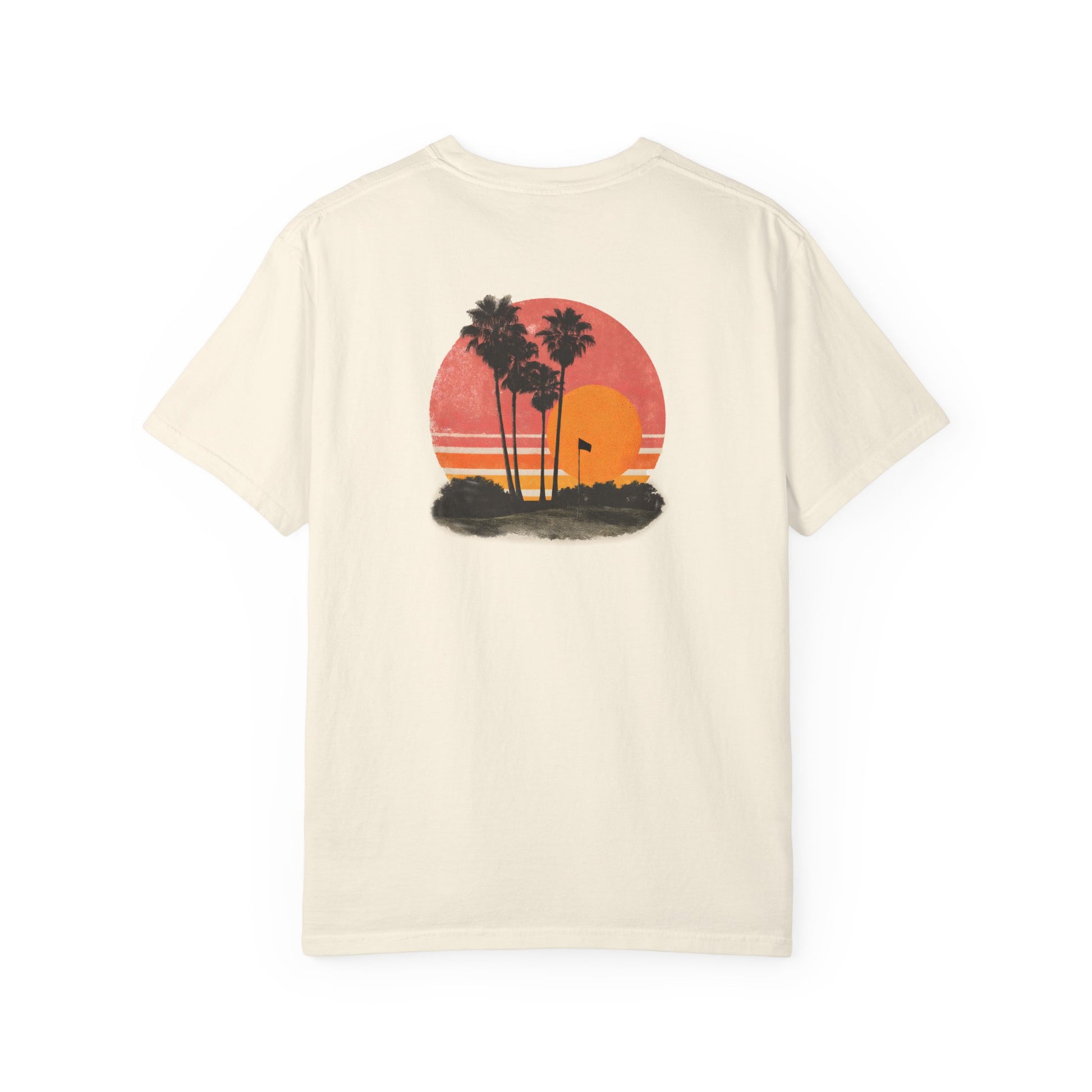 Towering palms stretch into a warm retro sunset, framing a lone flag on the green. A laid-back design that blends beach vibes with the spirit of golf.