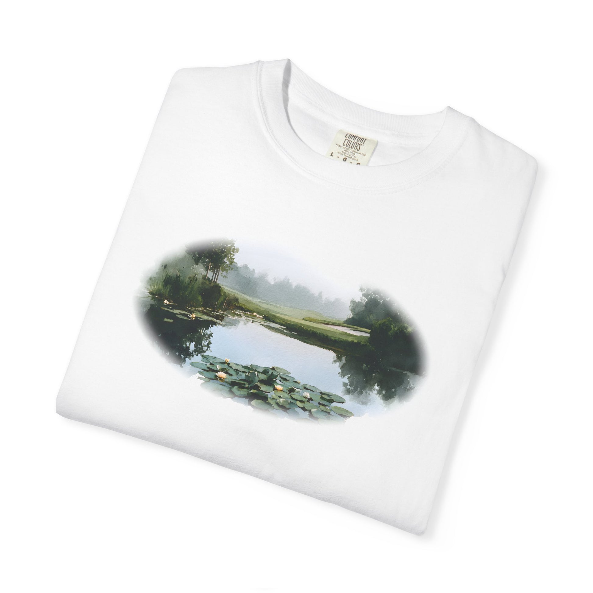 Calm waters, floating lilies, and a green waiting beyond. The Lily Pad Landing tee captures the serene beauty of golf’s water hazards in an oil-painted style. A design for those who appreciate the quiet pause before the next shot.