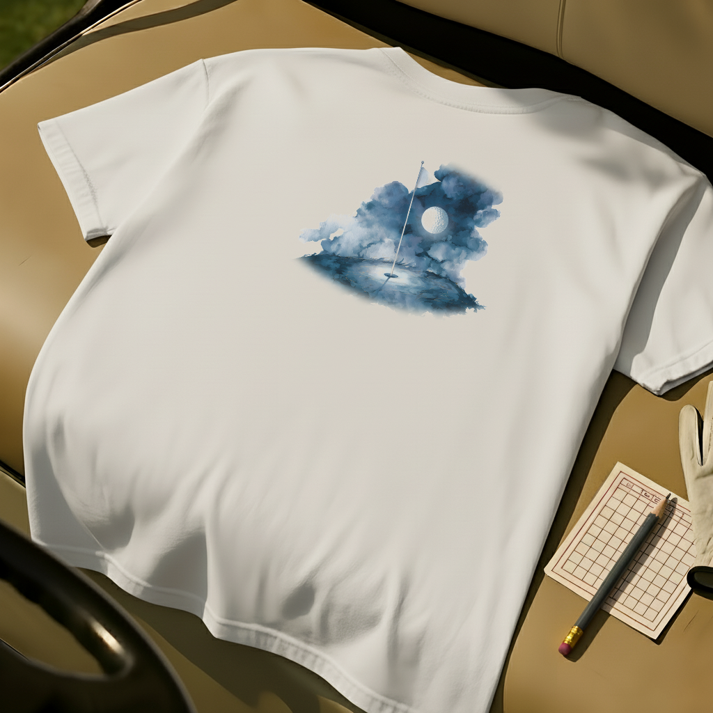 Under moonlit clouds, the Lunar Links tee blends dreamscape and fairway into one surreal design. With a glowing golf ball as the moon and an illuminated green below, this oil-painted piece celebrates the mystery of night golf and the imagination of the game.