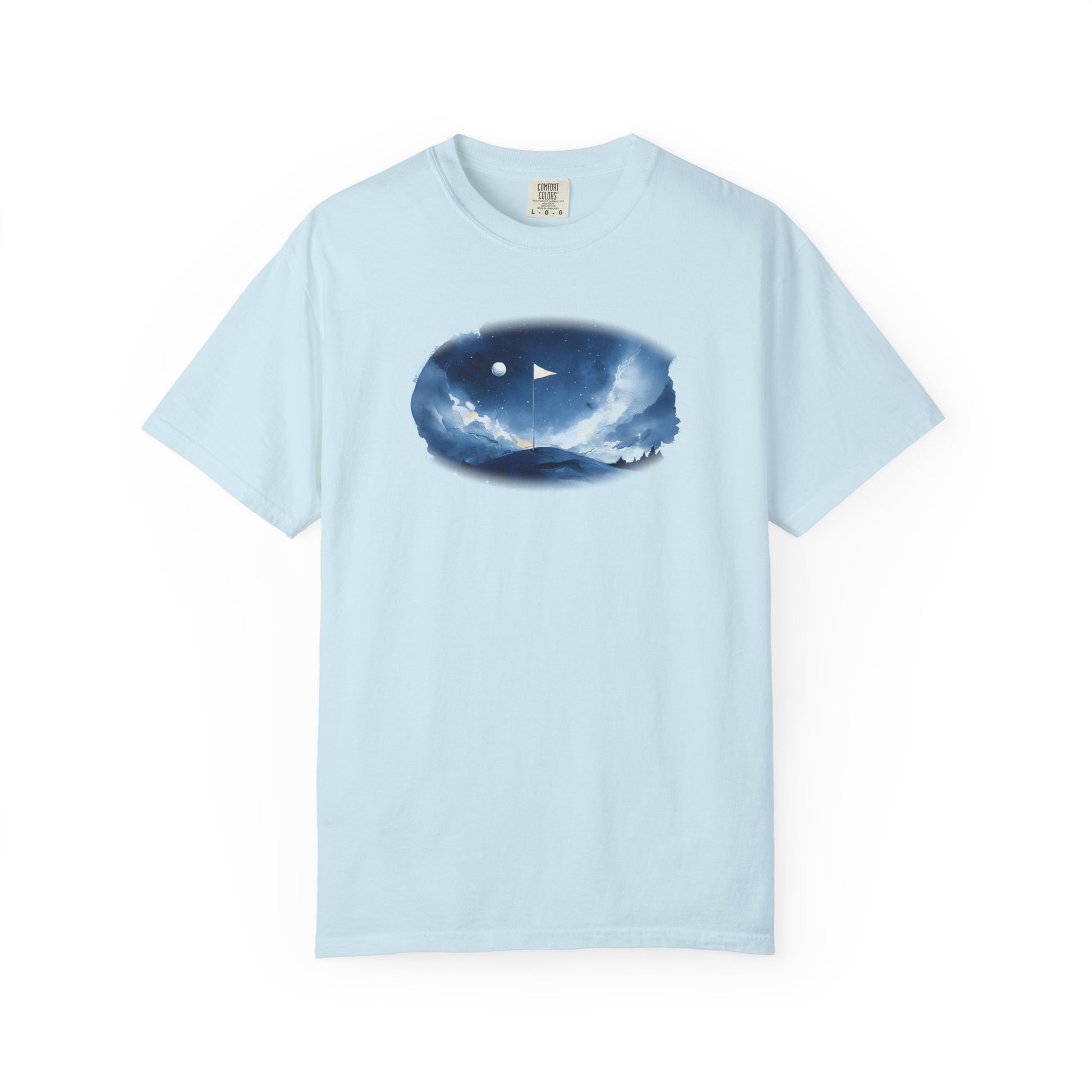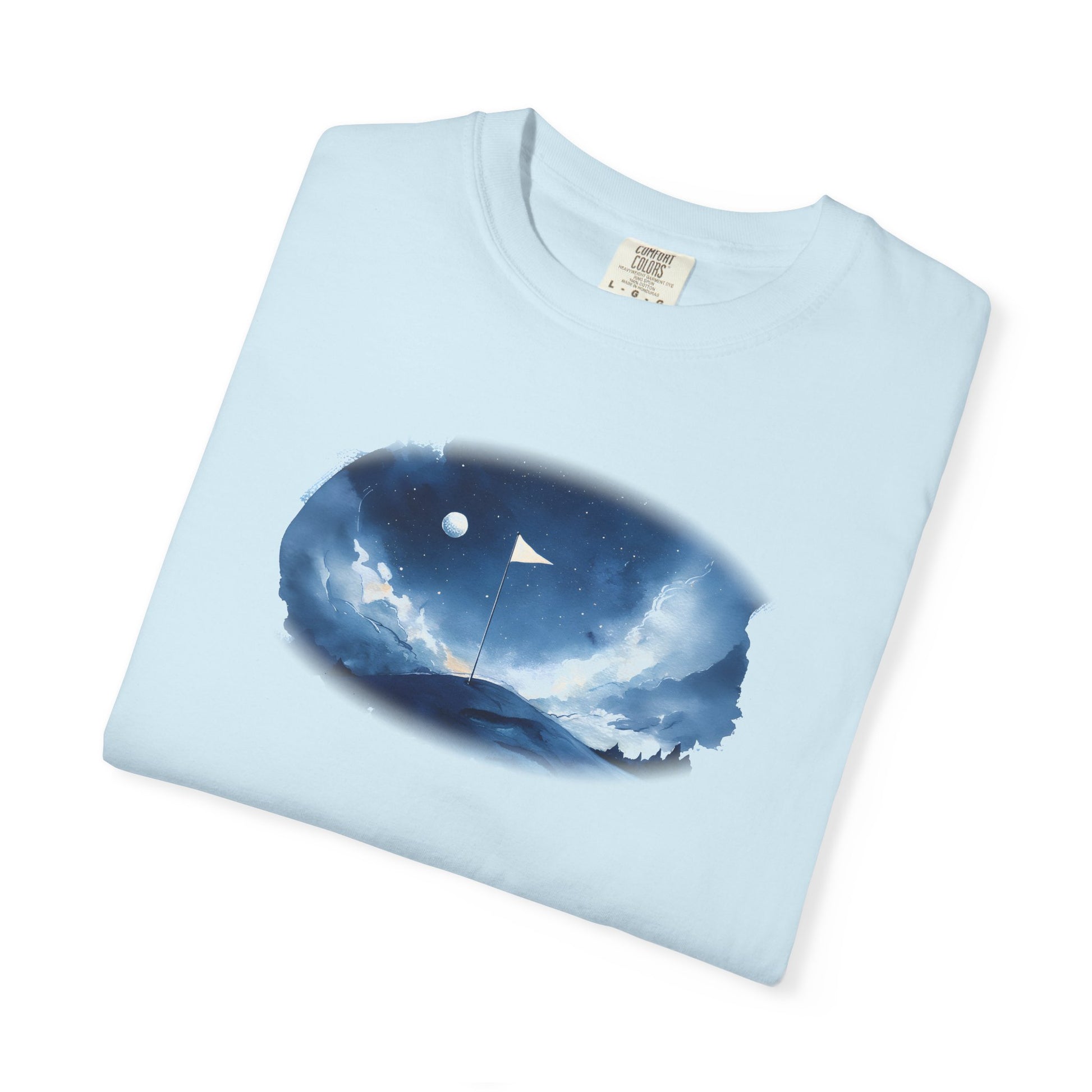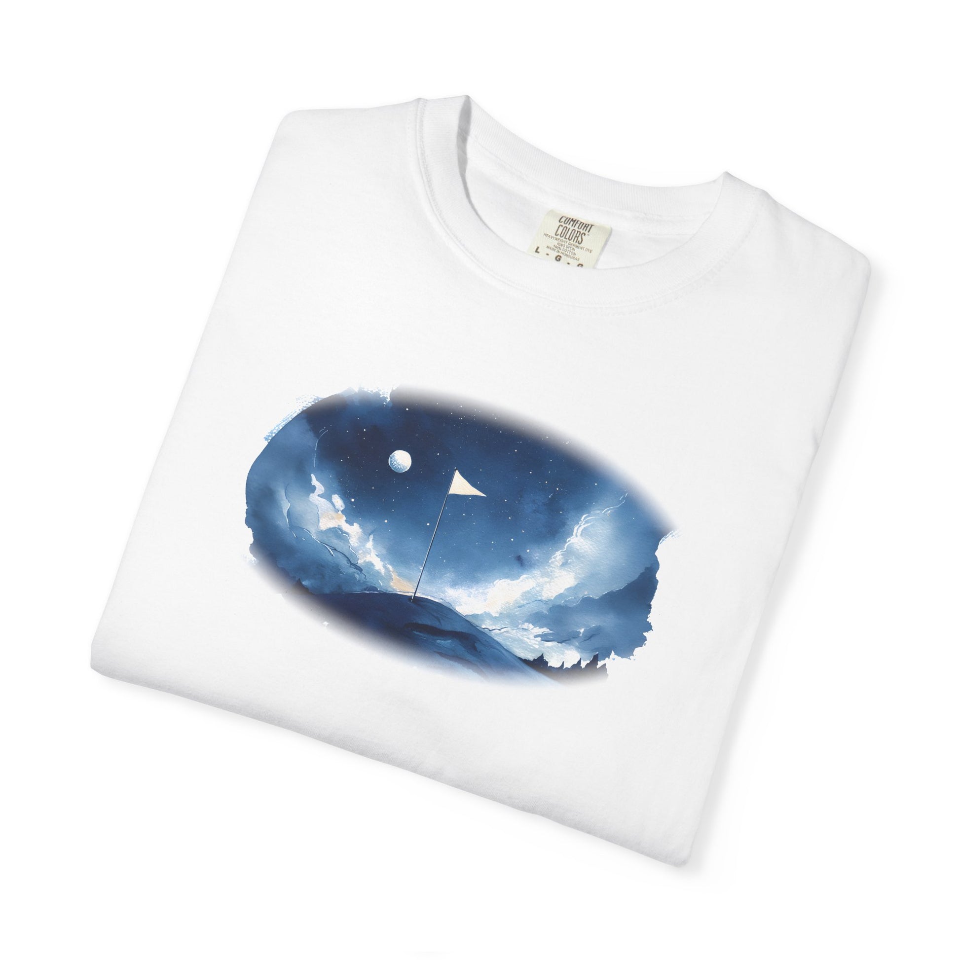 Starlit Round blends the magic of the night sky with the quiet focus of the course. A glowing moon and drifting clouds frame the silhouette of a golf flag, turning the green into a cosmic stage. Perfect for golfers who dream of playing under the stars, this shirt captures the calm beauty of twilight rounds.