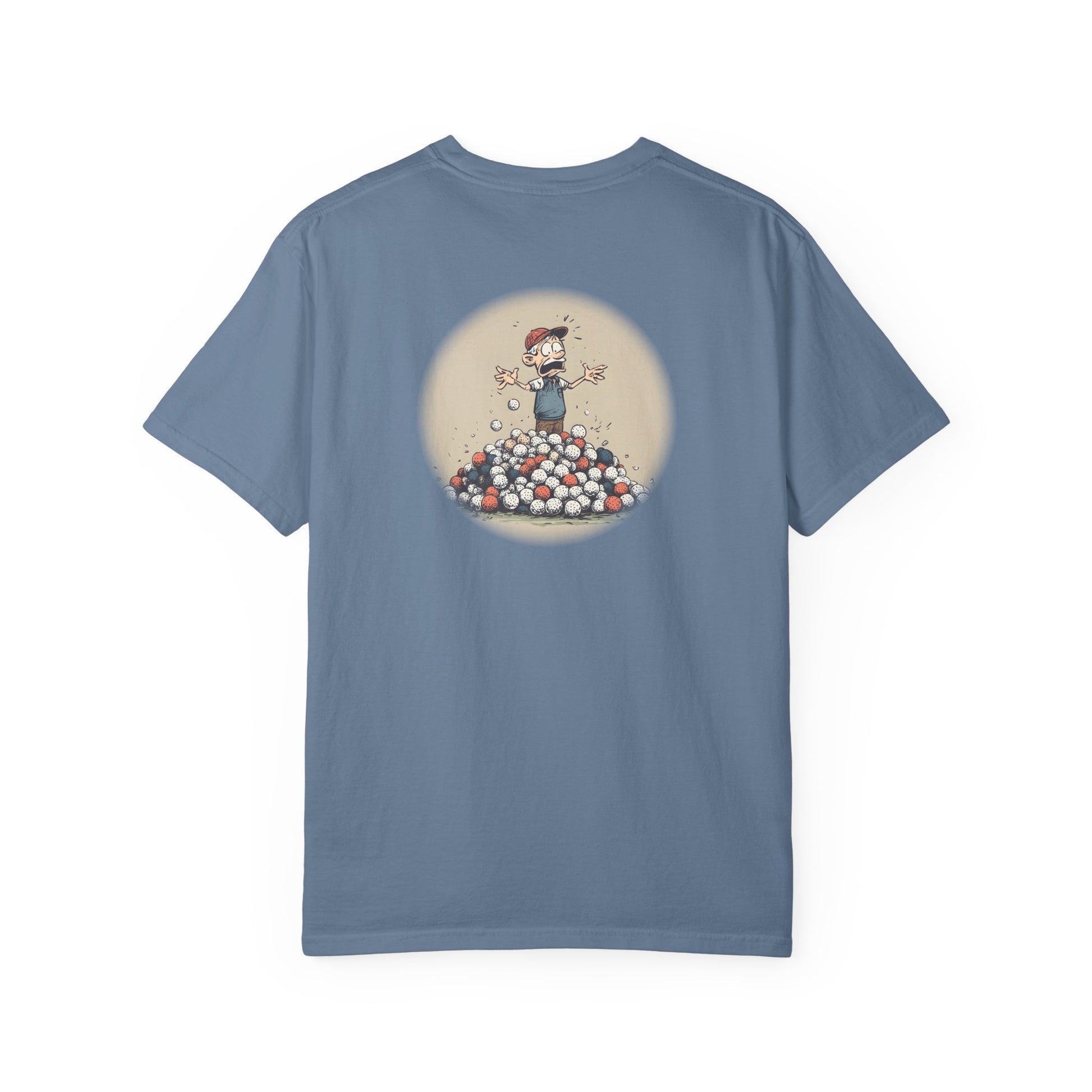 Buried under a colorful avalanche of golf balls, this panicked player knows too well the chaos of do-overs. A playful design for anyone who’s ever leaned a little too hard on the mulligan rule.