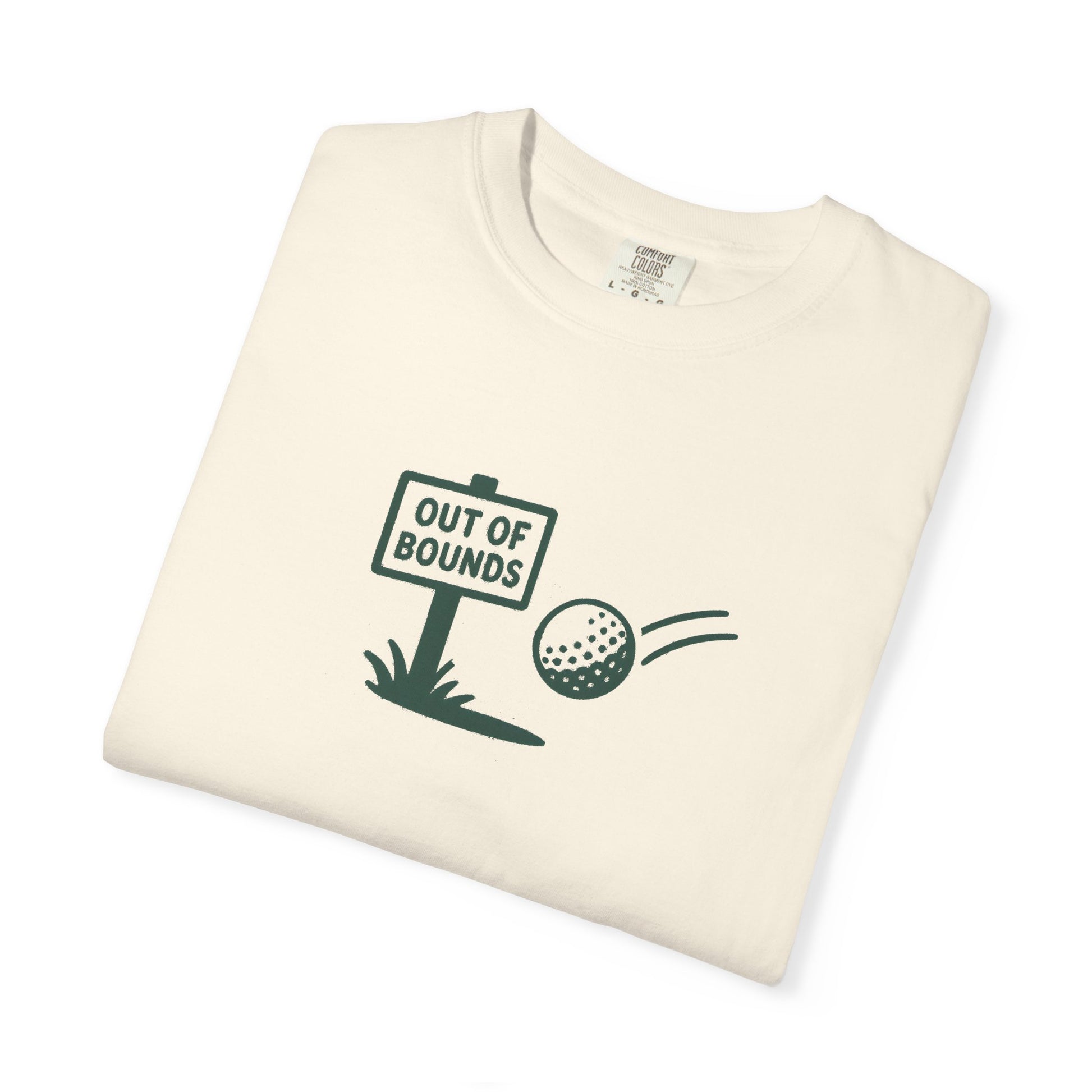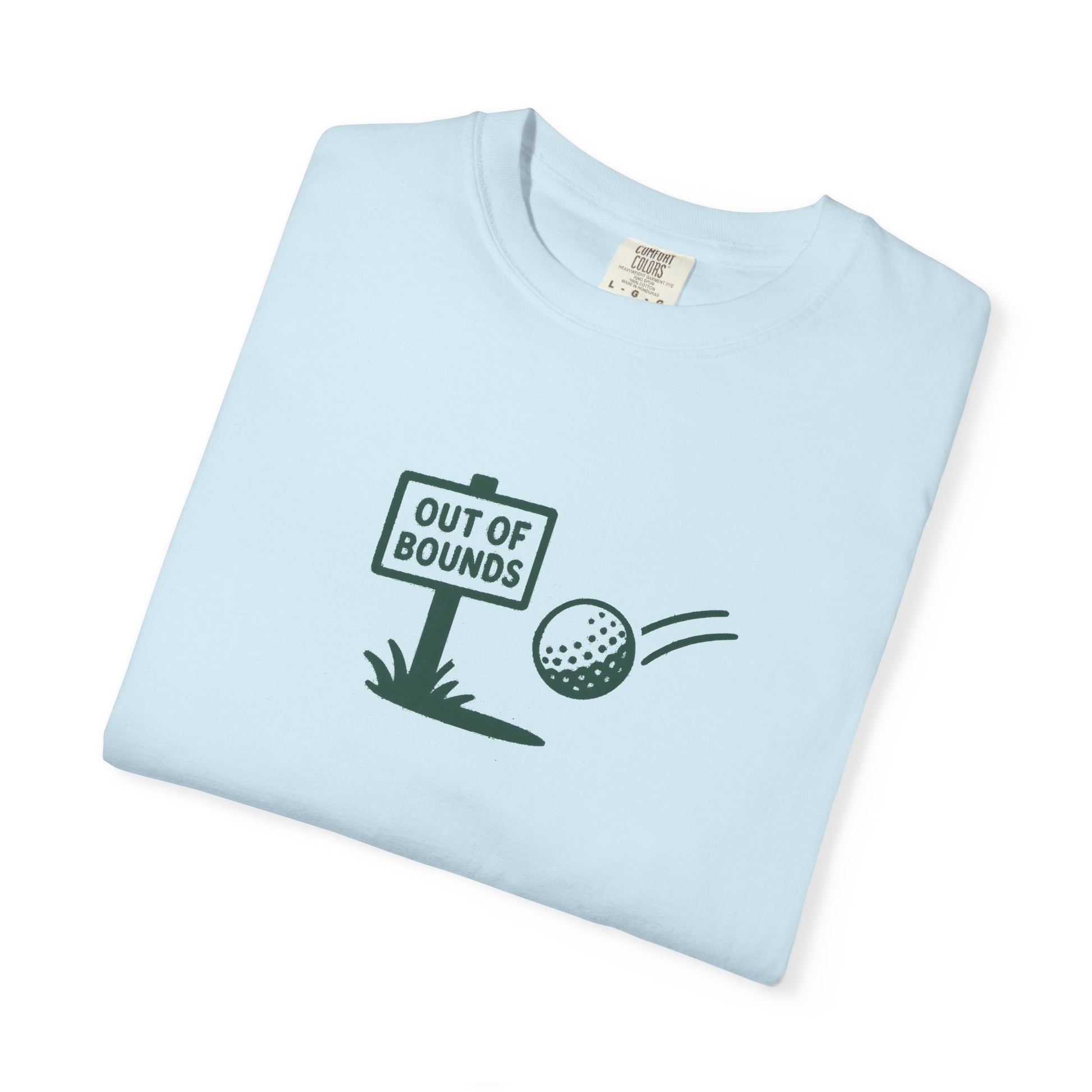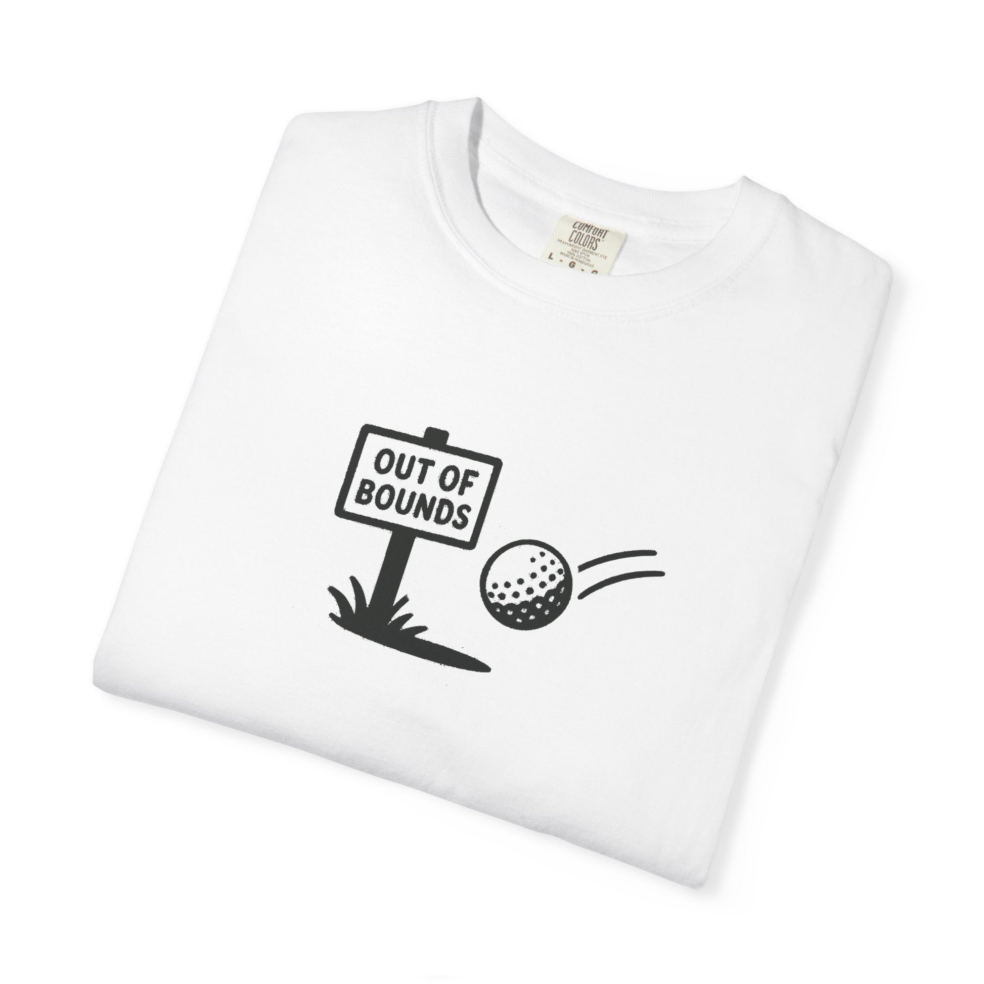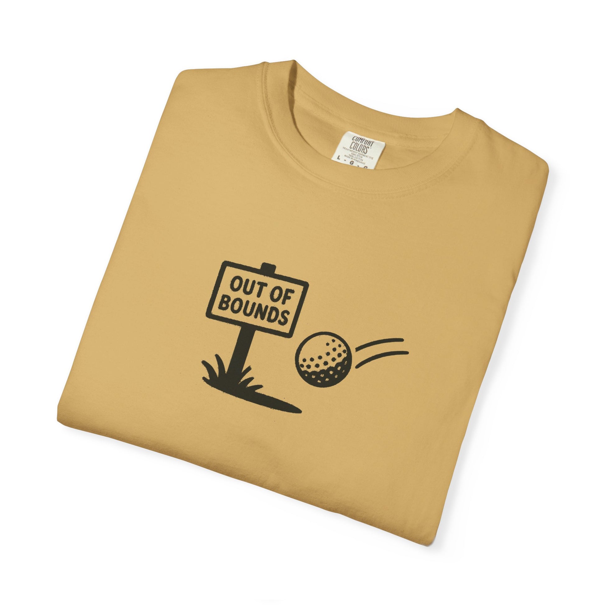 The Out of Bounds golf tee is perfect for players who know the struggle of a wayward shot. Featuring a bold design of a golf ball sailing past the "Out of Bounds" sign, this shirt blends humor with a touch of relatable frustration. Whether you’re a scratch golfer or a weekend hacker, this tee brings laughs to every round. Printed on the high-quality Comfort Colors® 1717 tee, it’s soft, durable, and built for both the course and casual wear.