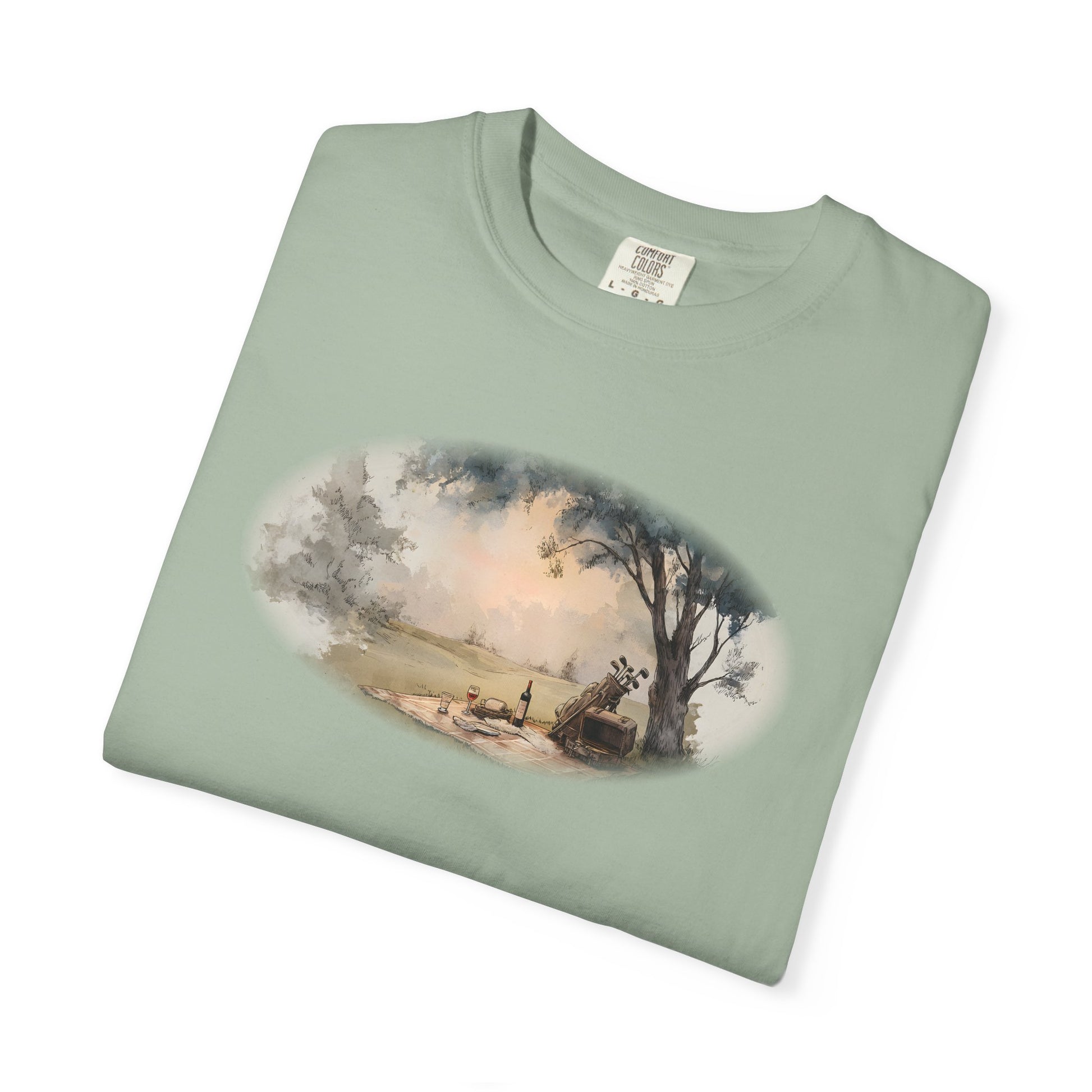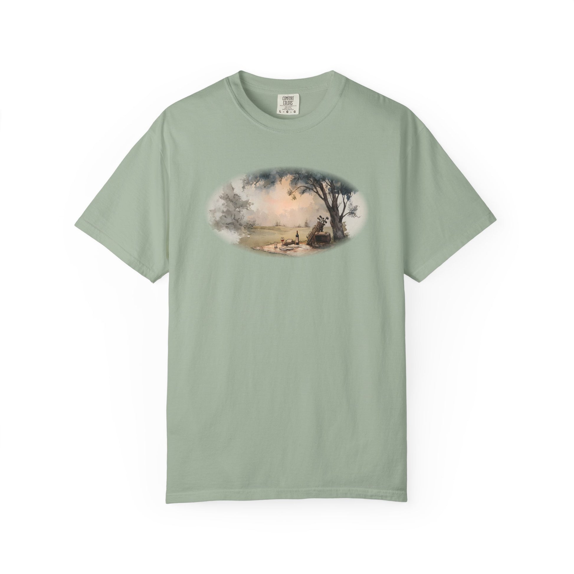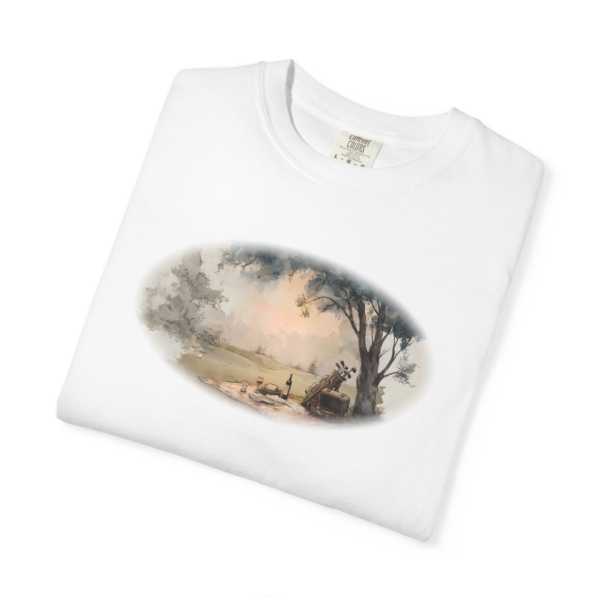 Gentle light, open fields, and a game played at nature’s pace. The Pastoral Round tee brings a timeless charm with its oil-painted design of a tranquil course beneath the trees. A design for golfers who love the game most when it feels like a walk through the countryside.