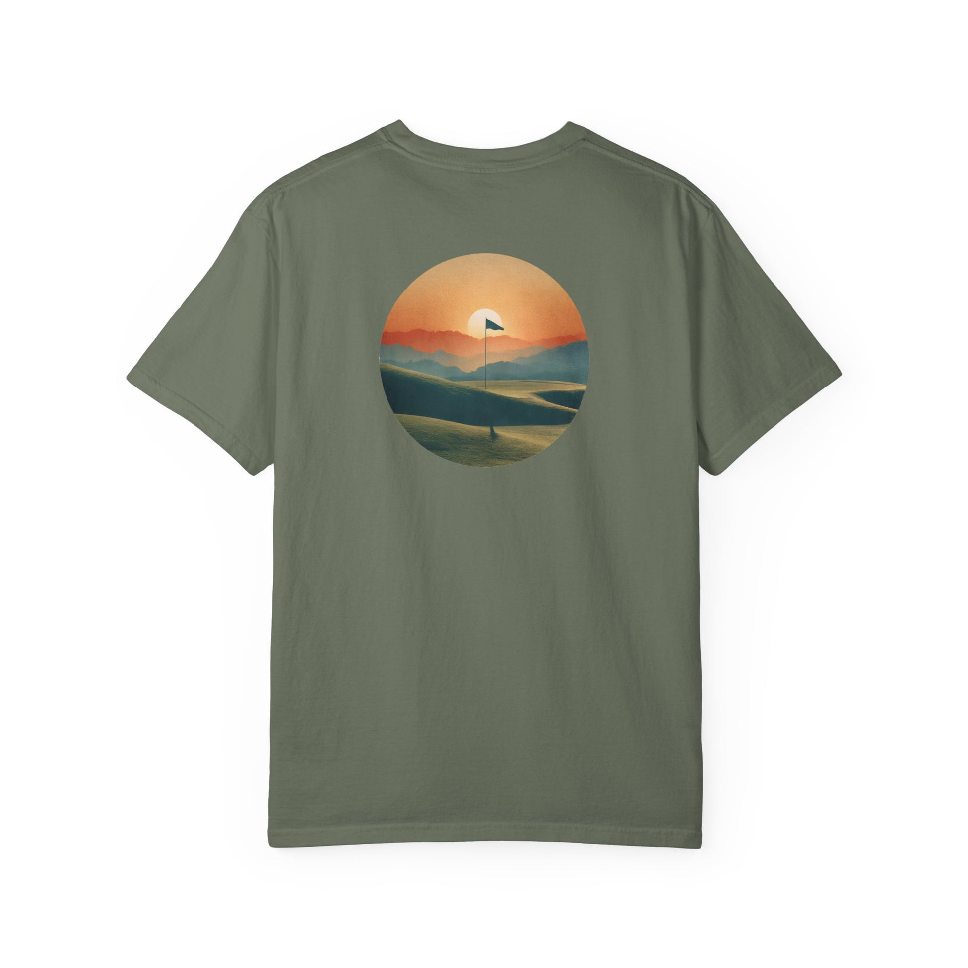 A serene golf green fades into rolling shadows as the sun dips behind the mountains. The minimalist flag silhouette against a warm retro sky creates a calm yet striking finish.