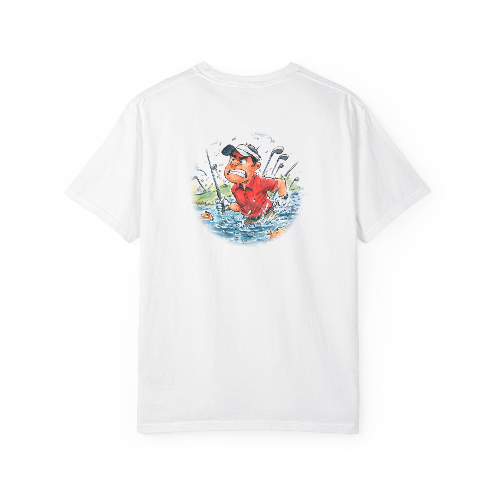 Wading through frustration and fish alike, this golfer shows what happens when the water hazard wins. A hilarious cartoon tee for anyone who’s ever watched their ball—and their temper—sink.