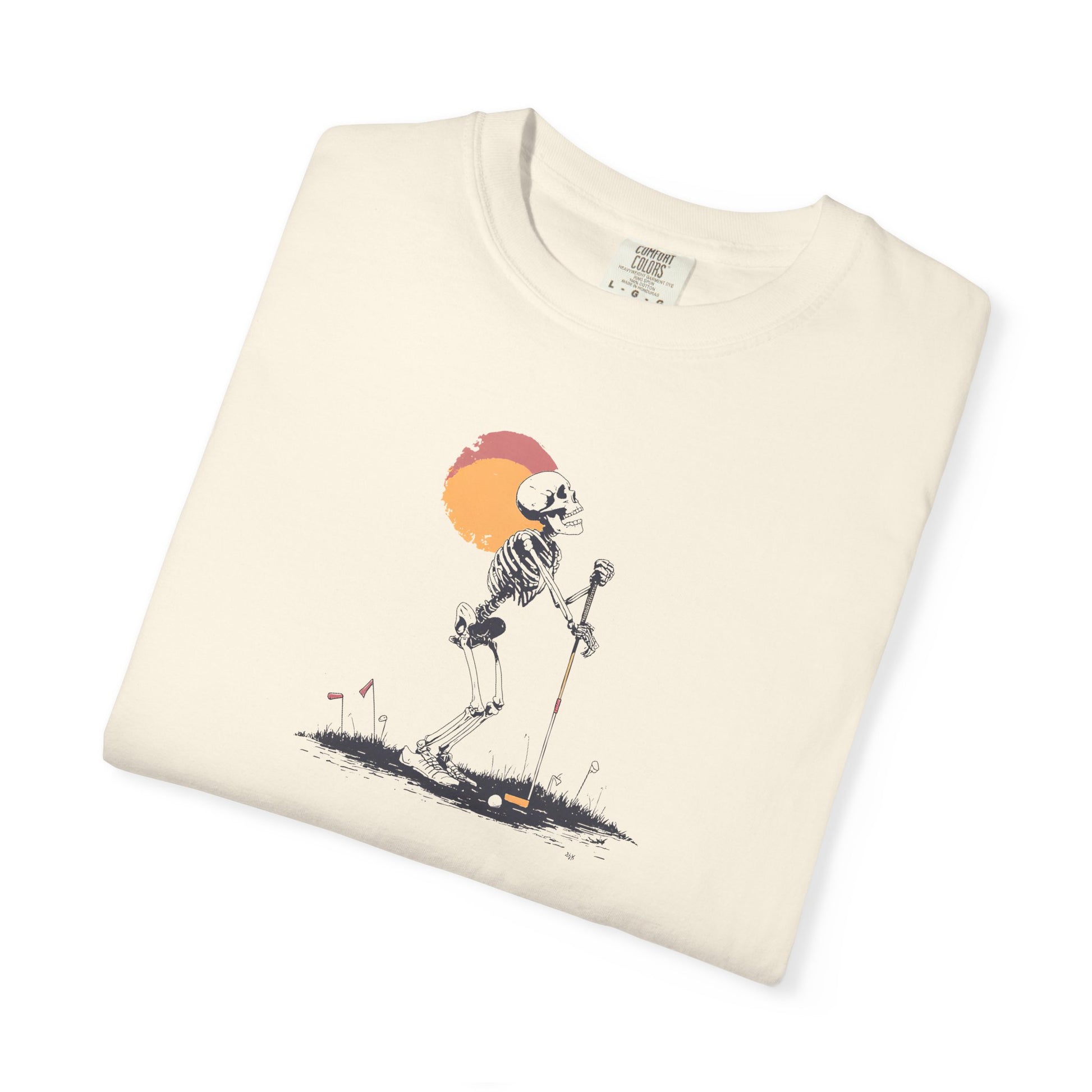 Sink it with style in the Putt to Rest tee. Featuring a skeleton lining up a putt beneath a glowing sunset, this design blends humor and precision for golfers who live for the final stroke.