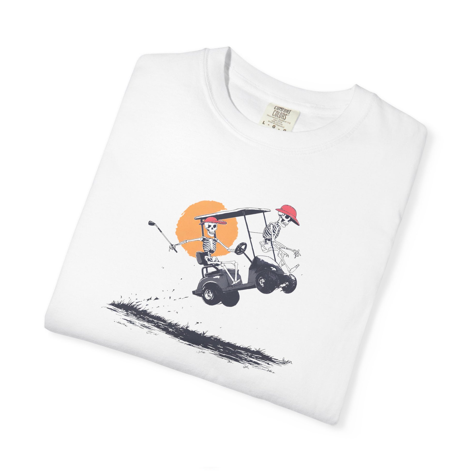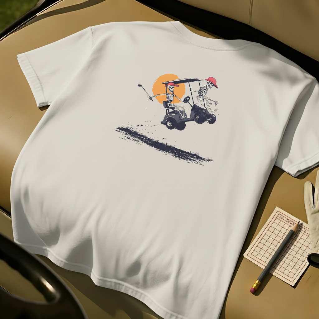 Hit the course with attitude in the Reckless Riders skeleton tee. Featuring skeletons launching their golf cart mid-air against a sunset backdrop, this design blends humor and edge for golfers who love living fast and playing loose.