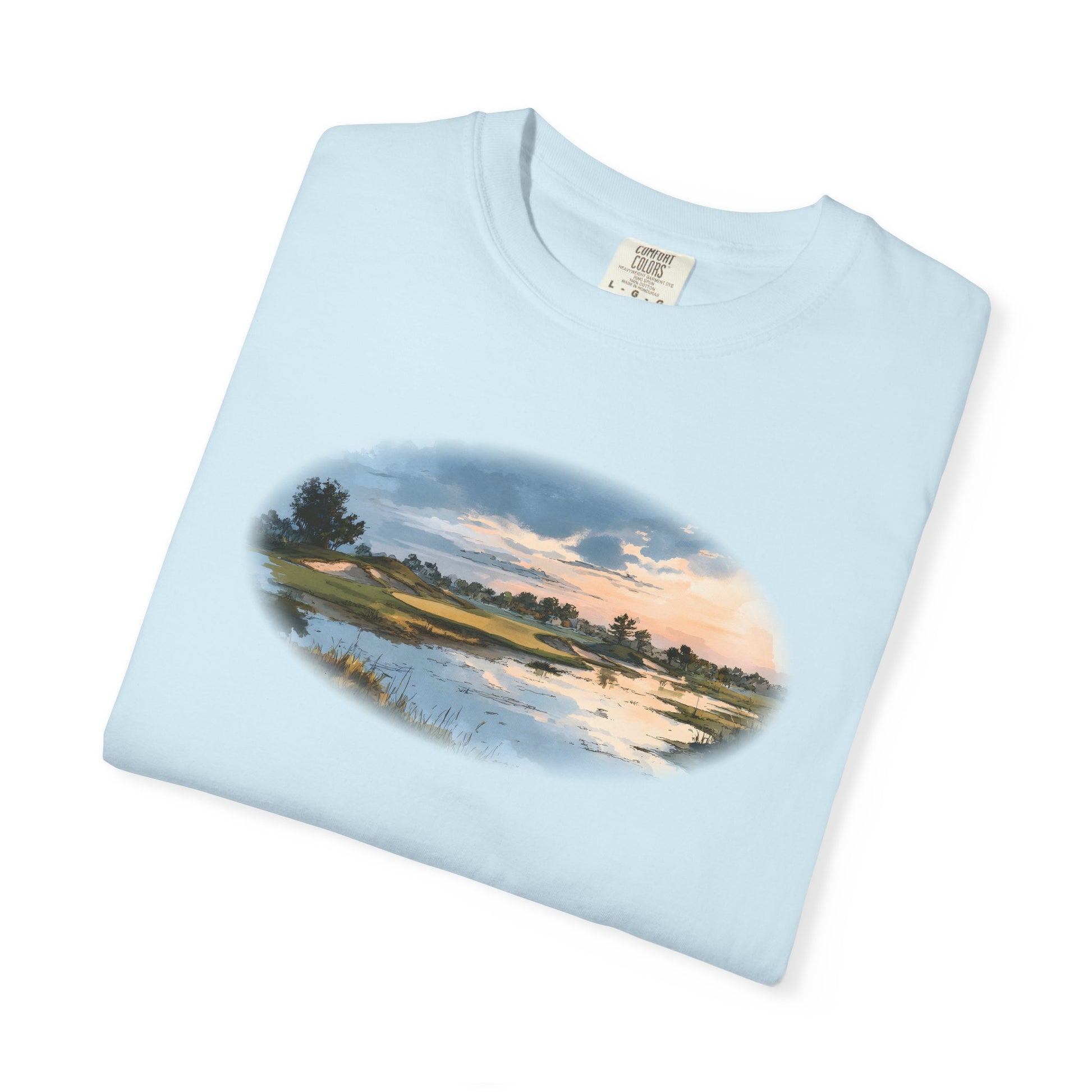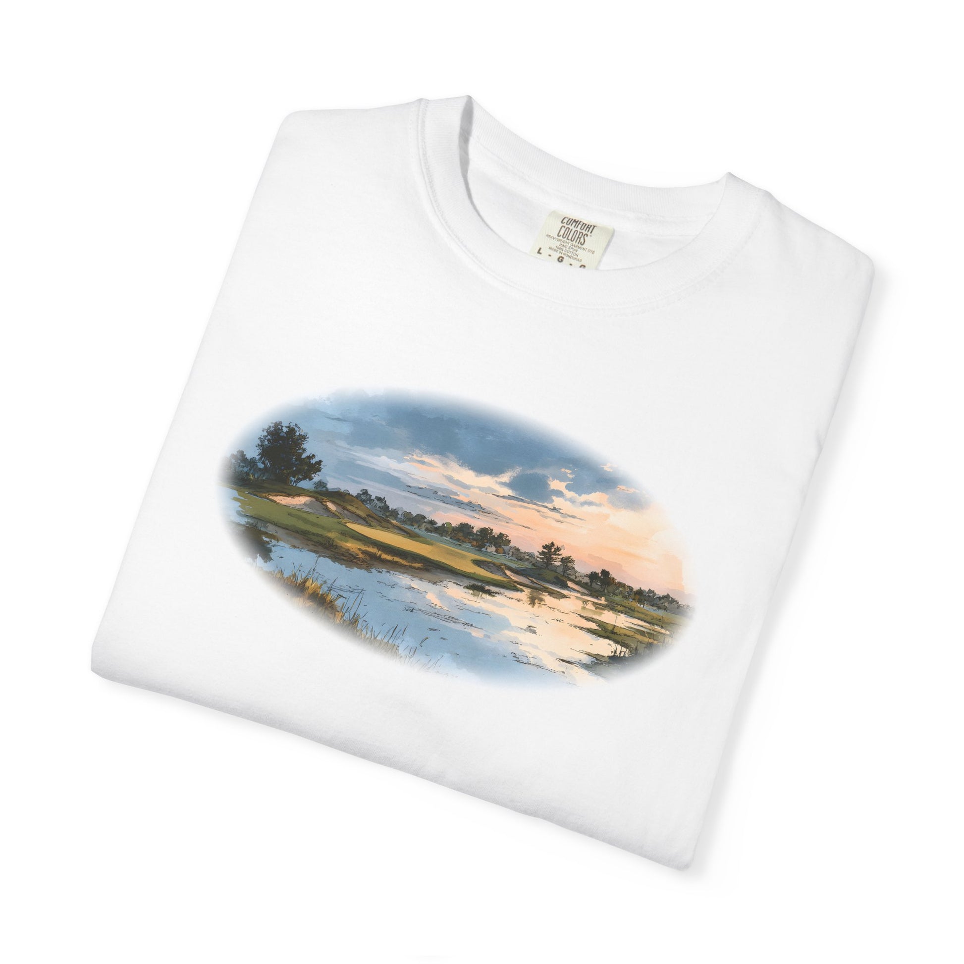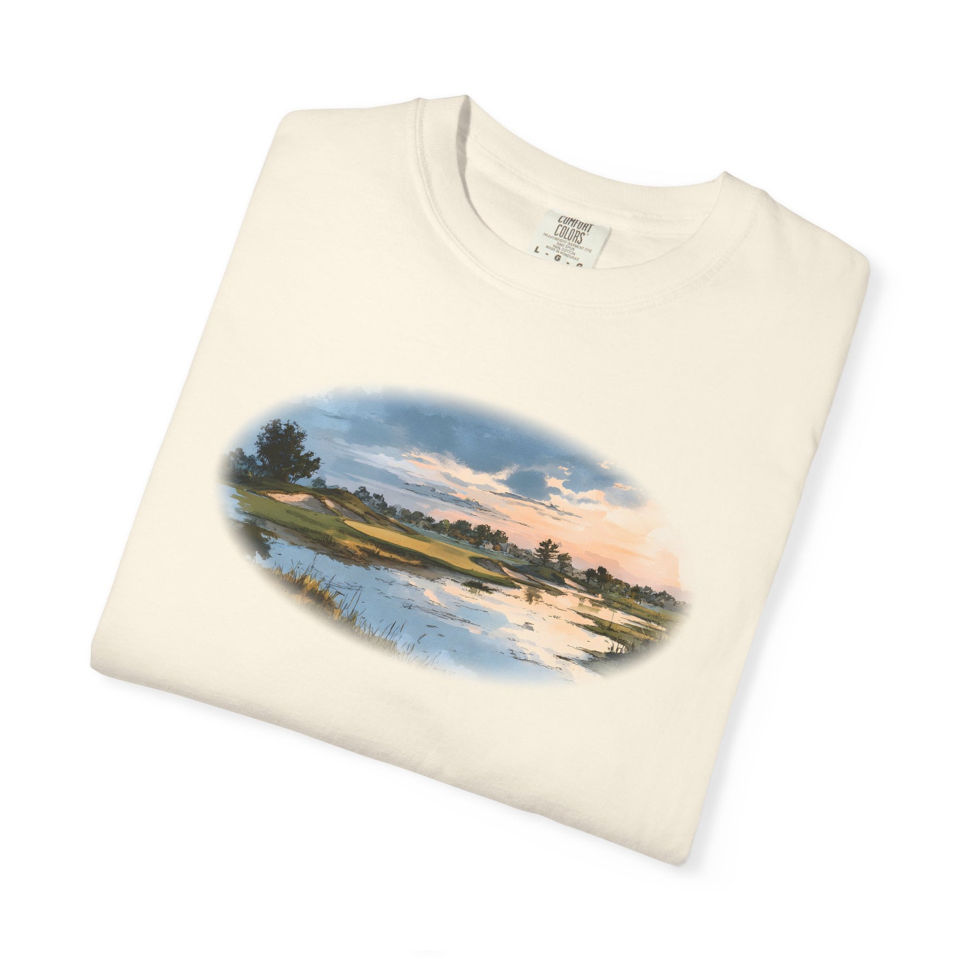 The stillness of water meets the fading glow of sunset in Reflections at Dusk. This design captures a serene golf landscape where the course mirrors the sky, painted in warm, calming tones. Perfect for players who savor the quiet beauty found between swings.