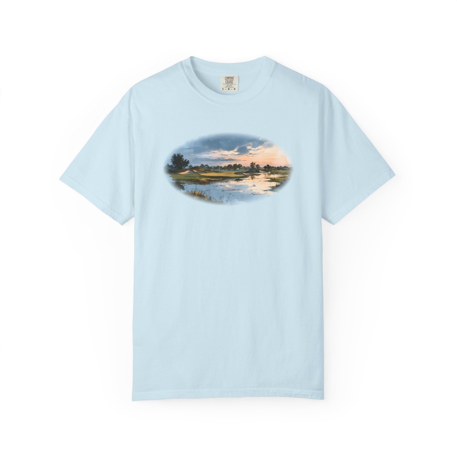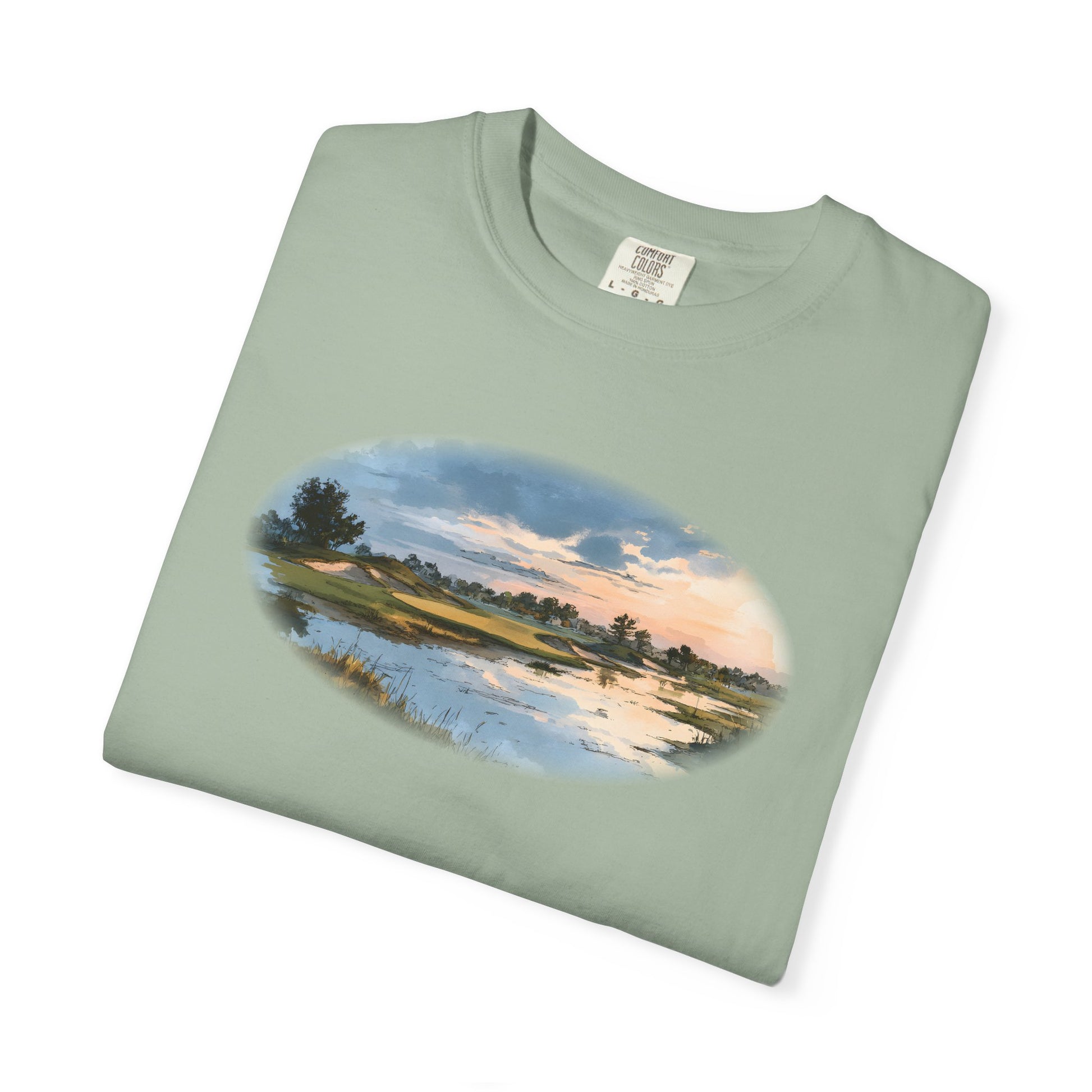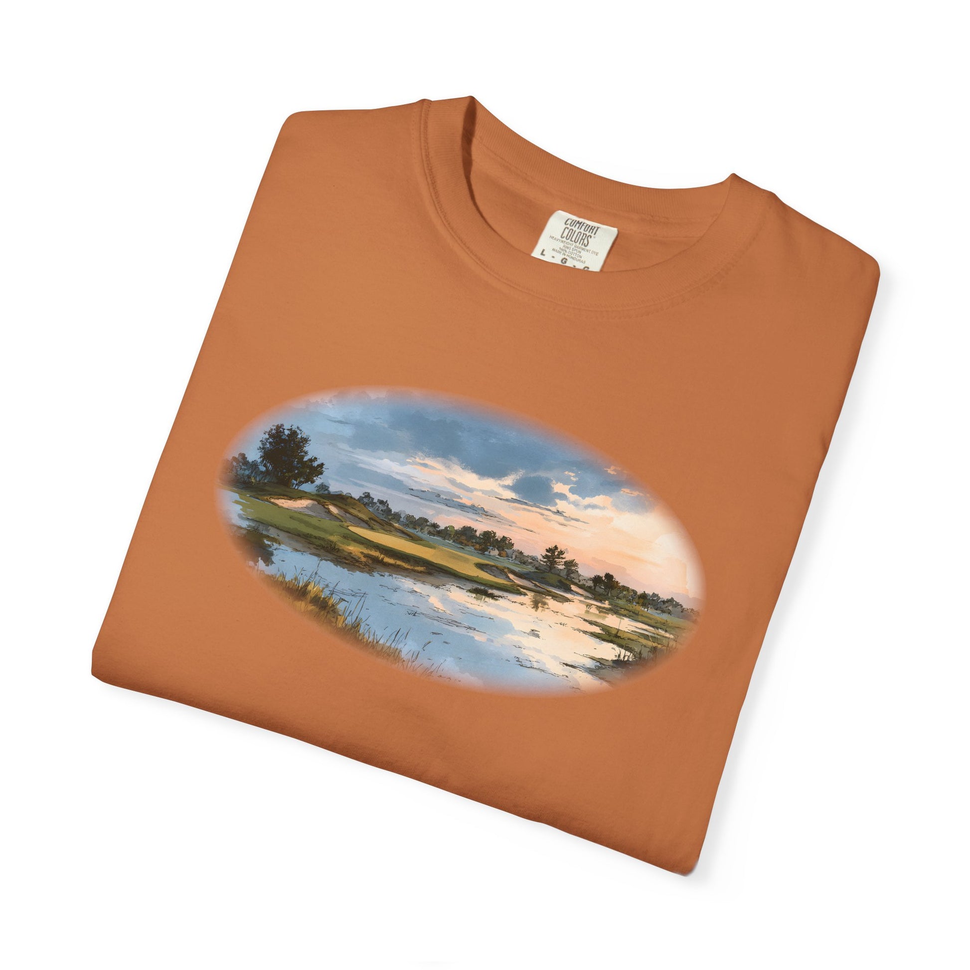 The stillness of water meets the fading glow of sunset in Reflections at Dusk. This design captures a serene golf landscape where the course mirrors the sky, painted in warm, calming tones. Perfect for players who savor the quiet beauty found between swings.