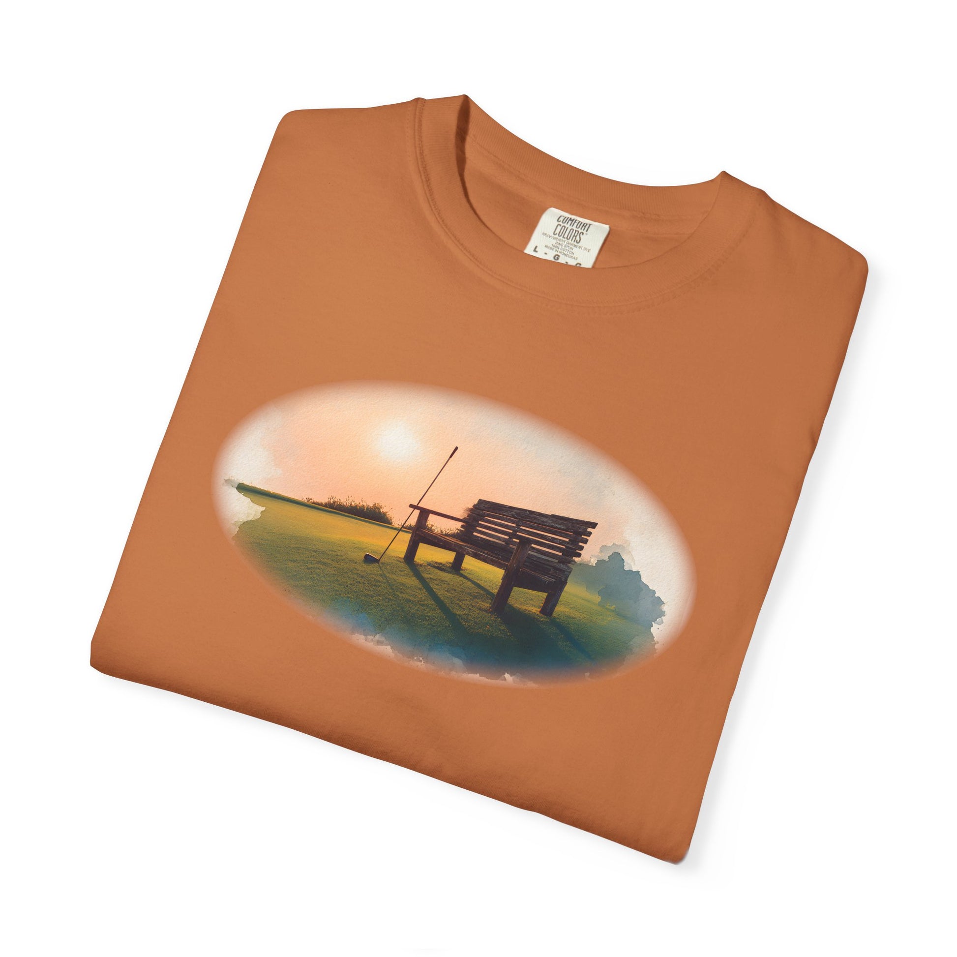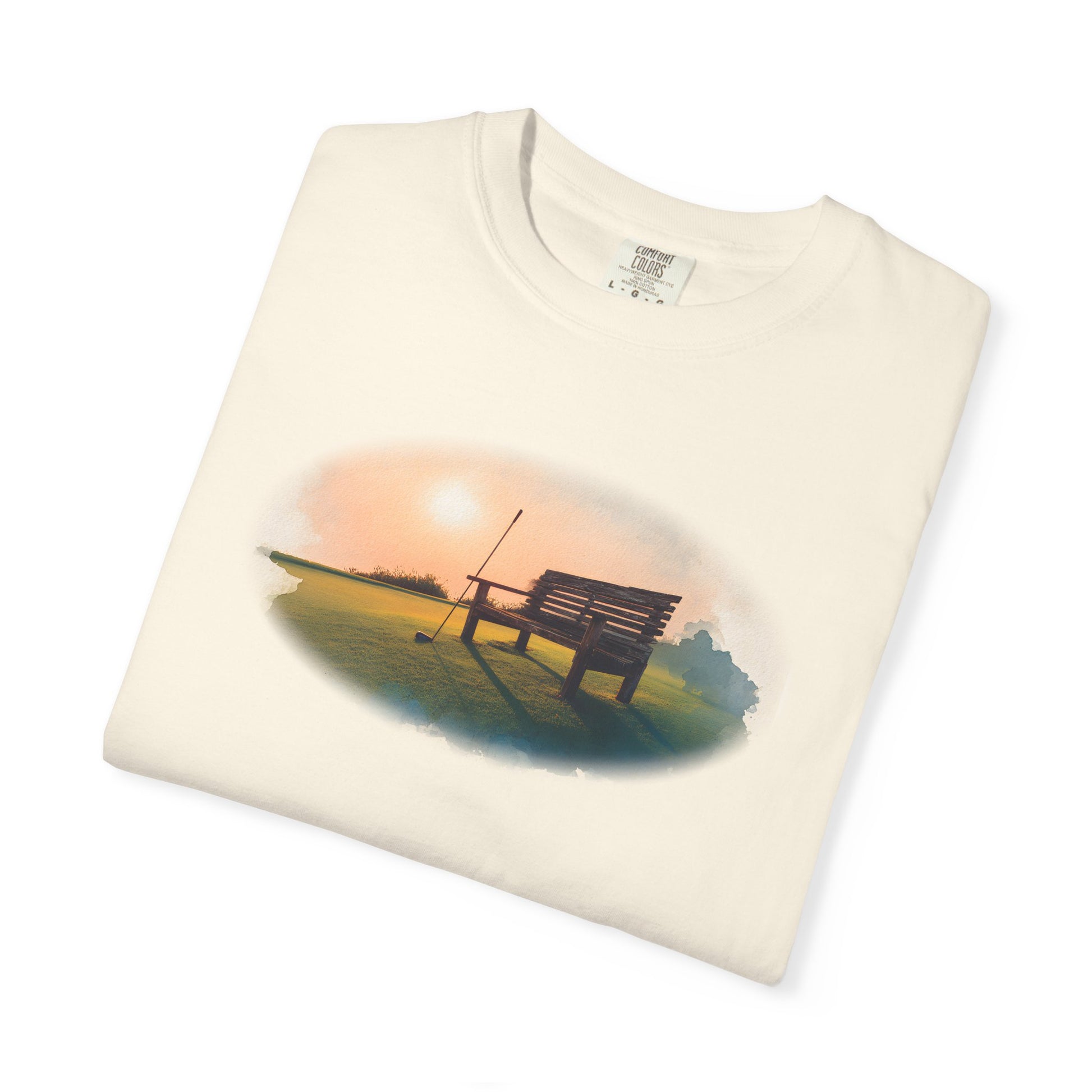 A quiet bench, a lone club, and the sun dipping low — the Rest Between Rounds tee captures golf’s most reflective moments. Painted in warm, fading light, this oil-inspired design is a reminder that sometimes the pause is just as meaningful as the play.