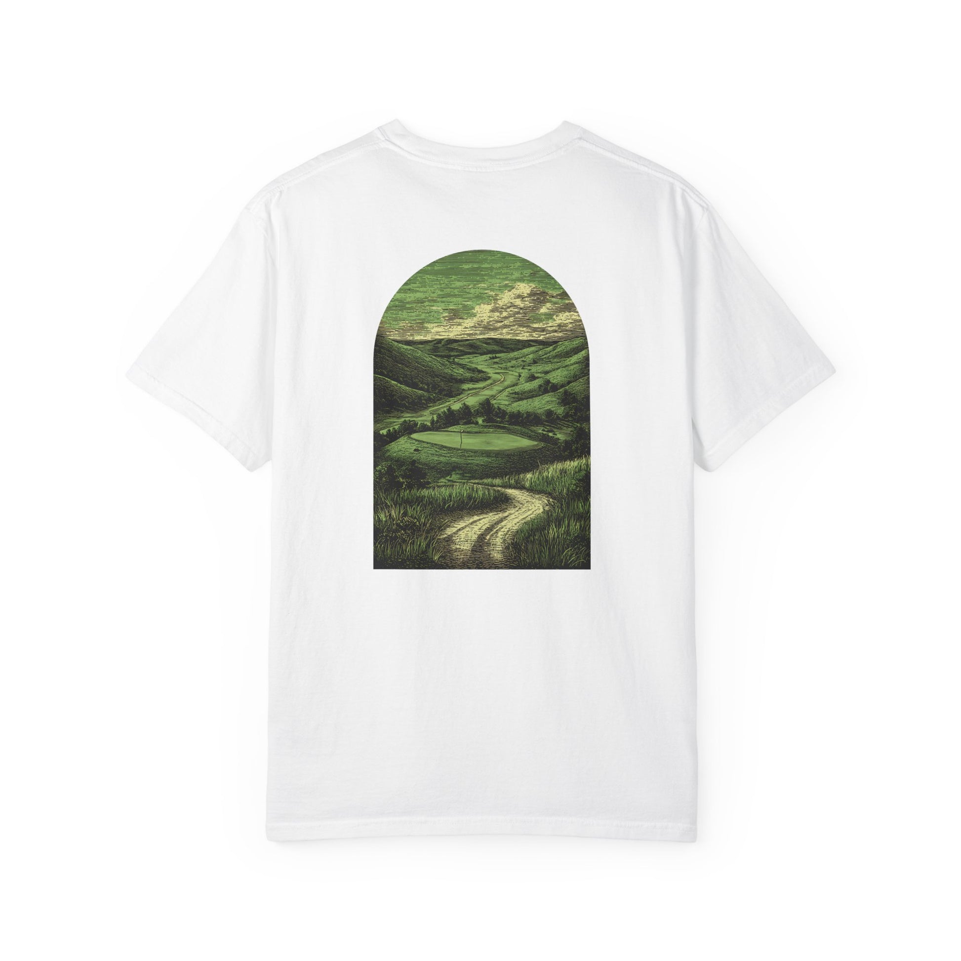 The Rolling Descent tee showcases a winding fairway that meanders through a lush valley. Perfect for golfers who appreciate the game’s most scenic journeys, framed in hand-drawn detail.