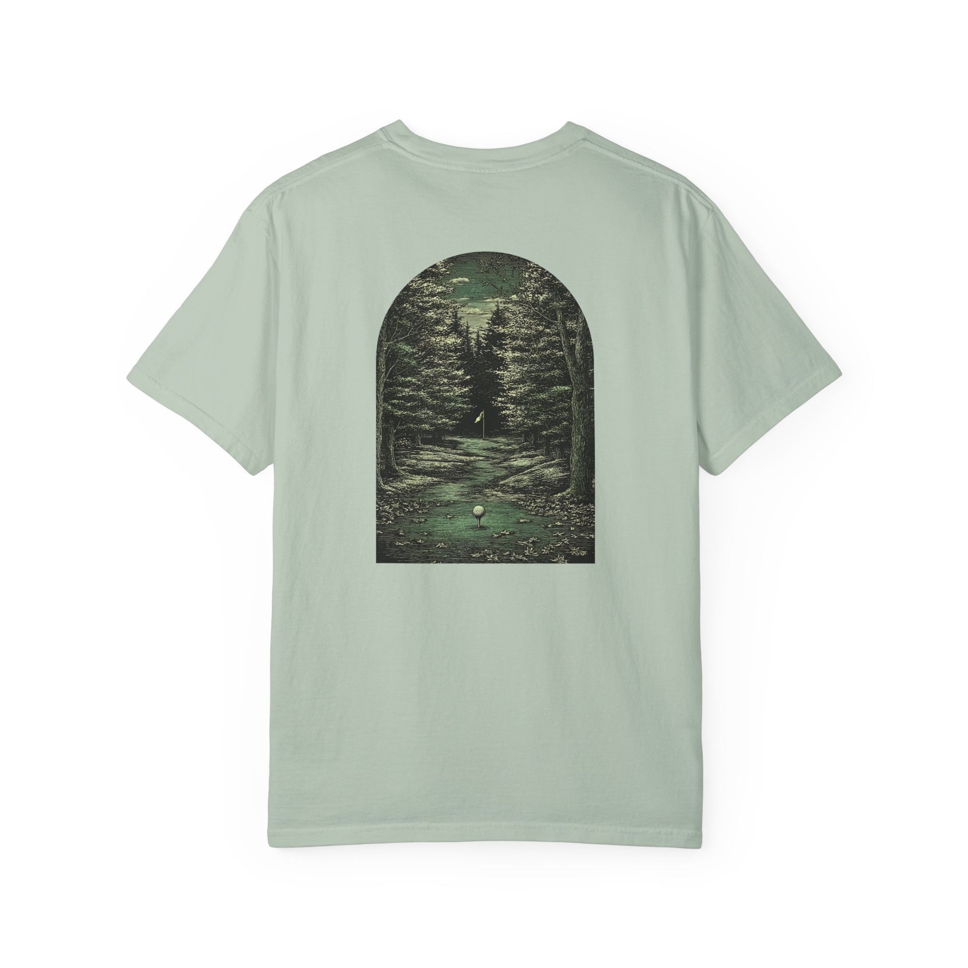 Moody and atmospheric, the Shadow Grove tee features a dark woodland path where the flag waits just beyond. A bold design for golfers who embrace the mystery of the game.