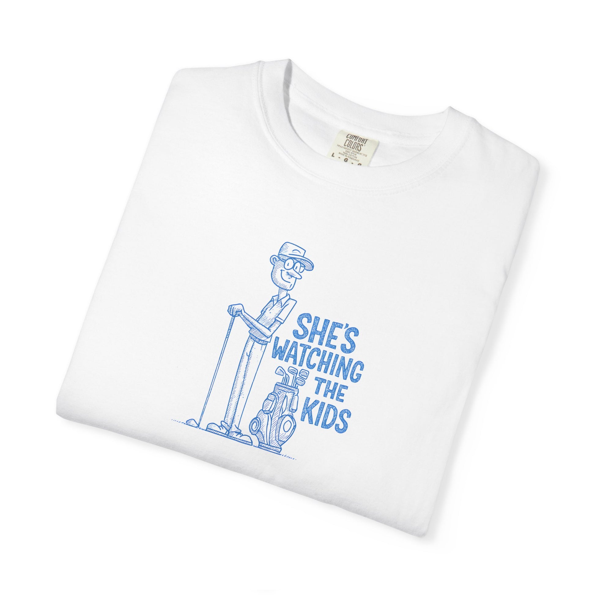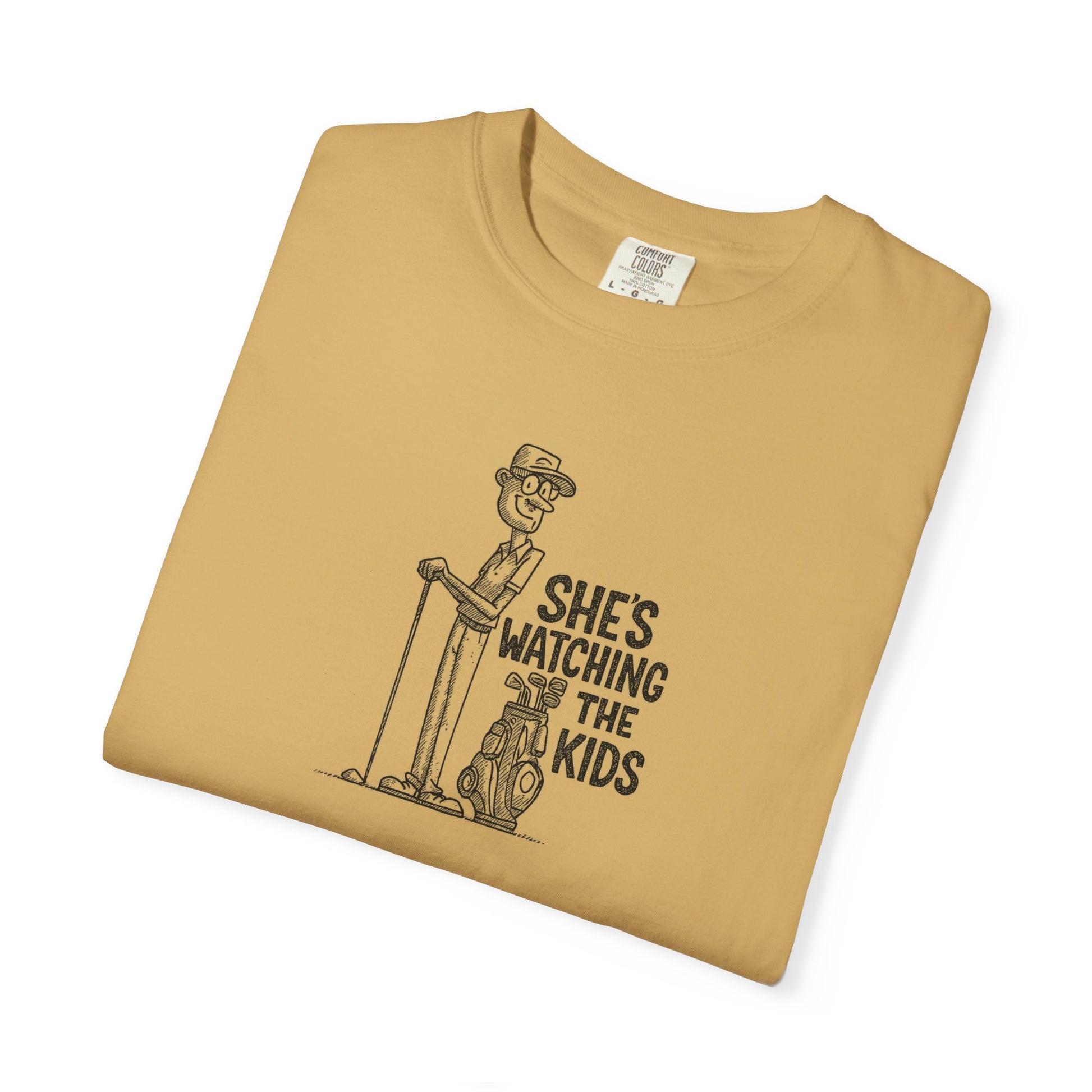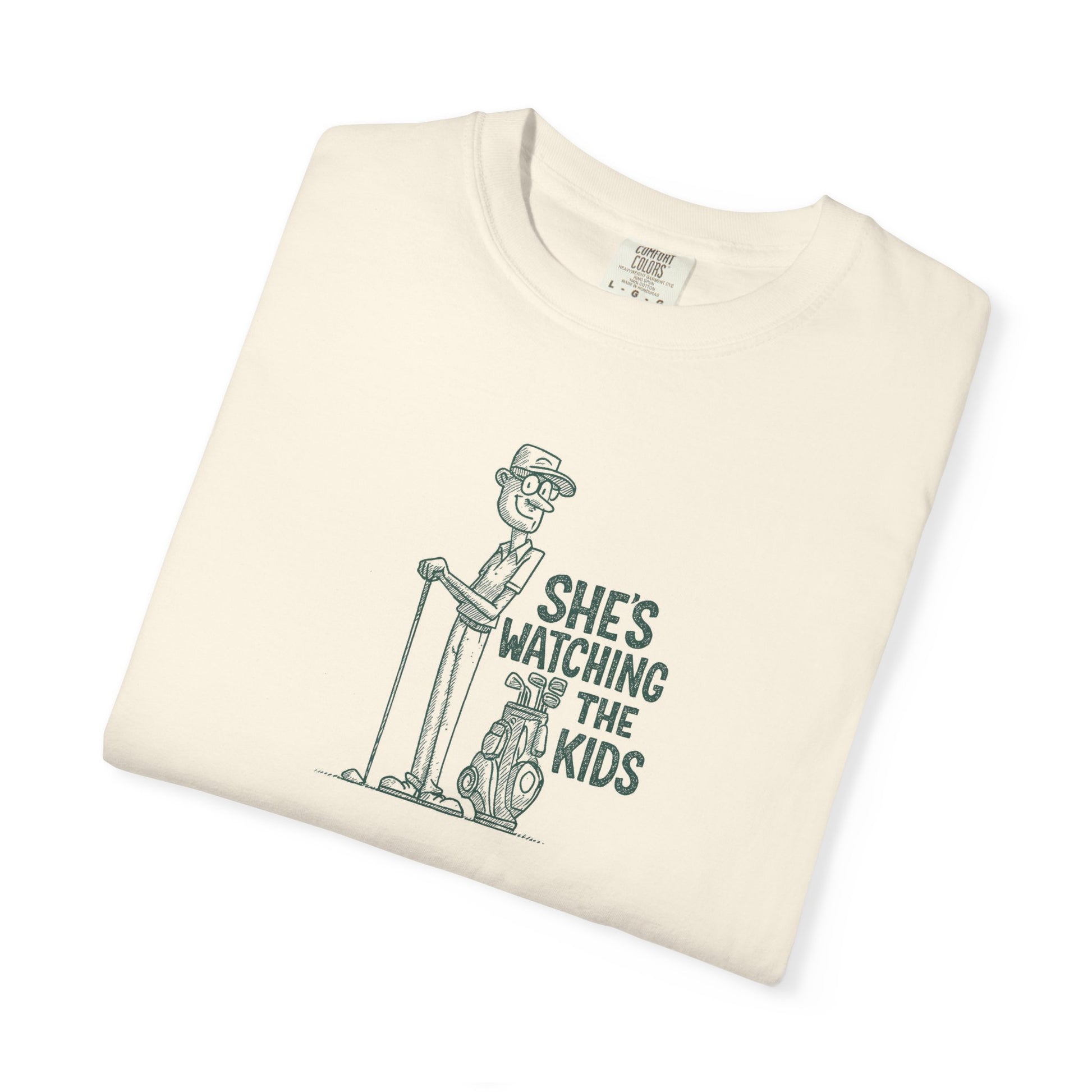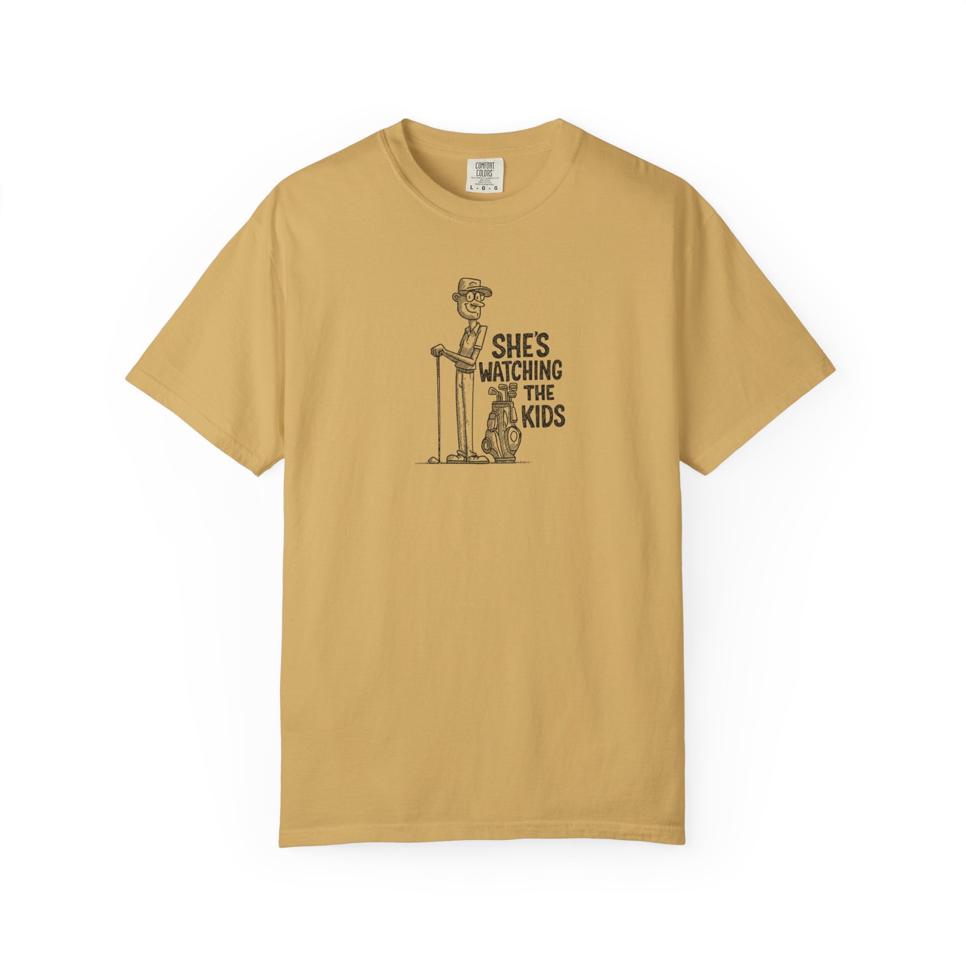 Golf time is dad time. The She’s Watching the Kids tee is a tongue-in-cheek excuse every golfer has thought of, pairing a lighthearted sketch with classic golf humor. Perfect for dads who sneak away to the course with a grin and a wink.
