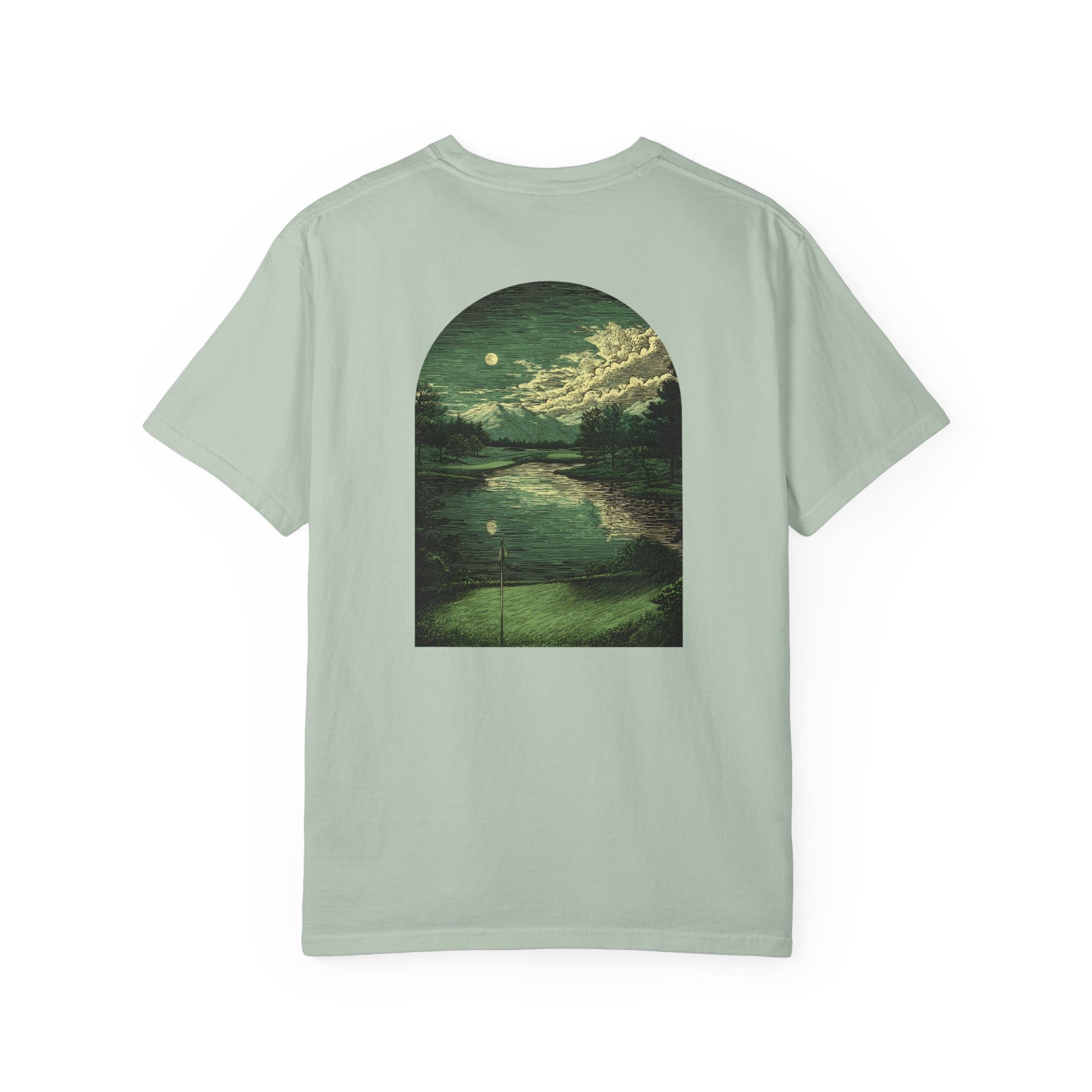 With the course bathed in moonlight and clouds drifting above, the Starlight Fairway tee offers a dreamy look at golf’s most peaceful setting. A vintage-inspired design for players who love the game beyond the daylight hours.
