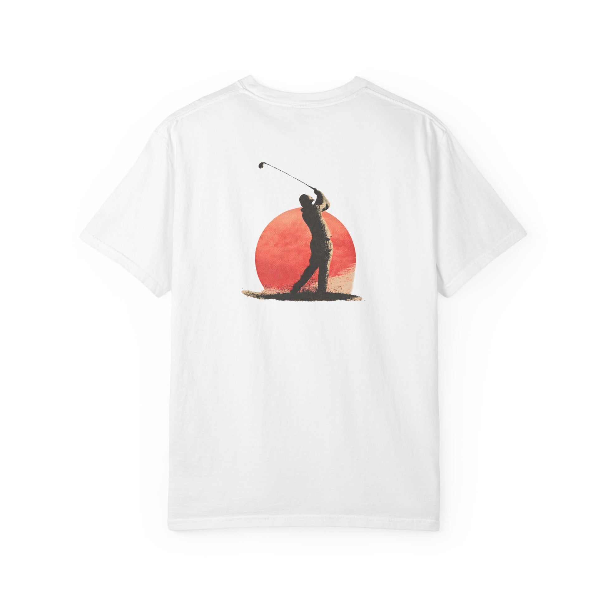 A timeless silhouette of a golfer mid-swing against a glowing retro sun. Perfect for those who love the game’s rhythm and its golden-hour magic.