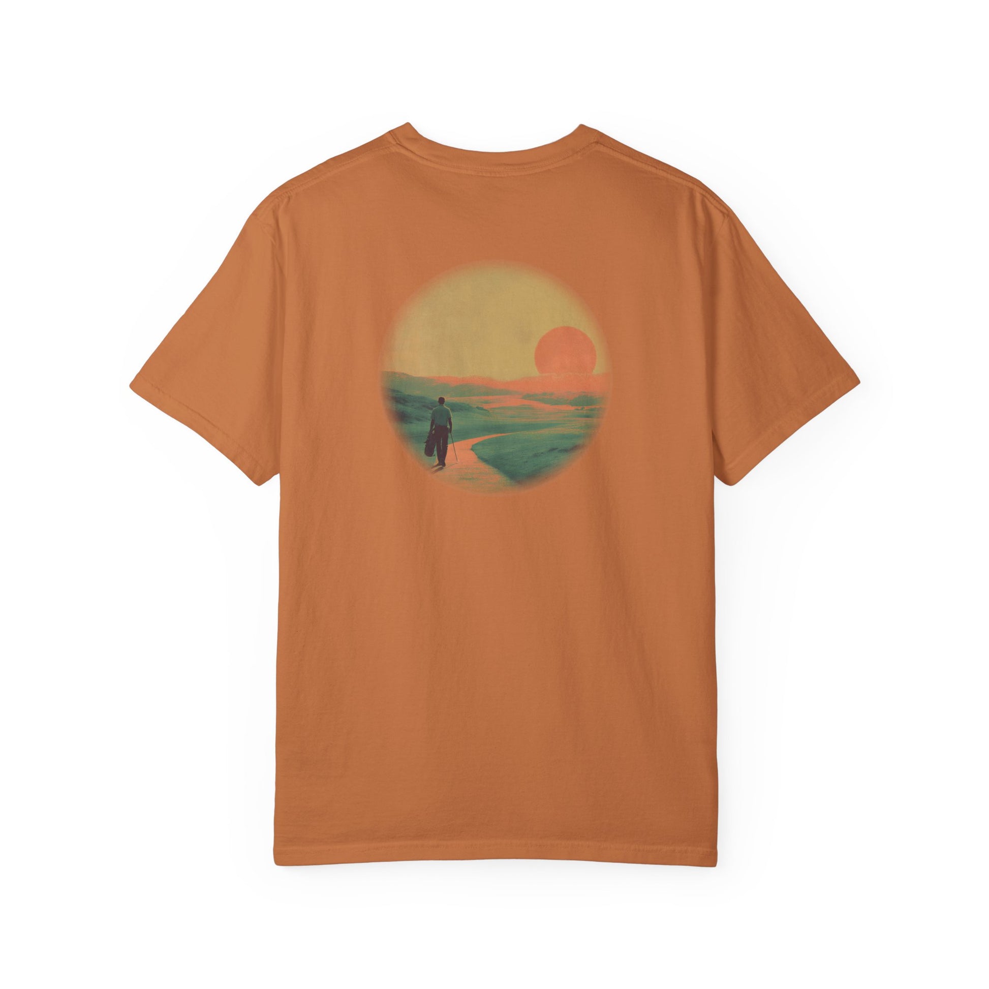A golfer walks the winding fairway beneath a glowing sun, blending calm and grit in a timeless scene. A vintage-inspired design that speaks to the quiet beauty of the game.