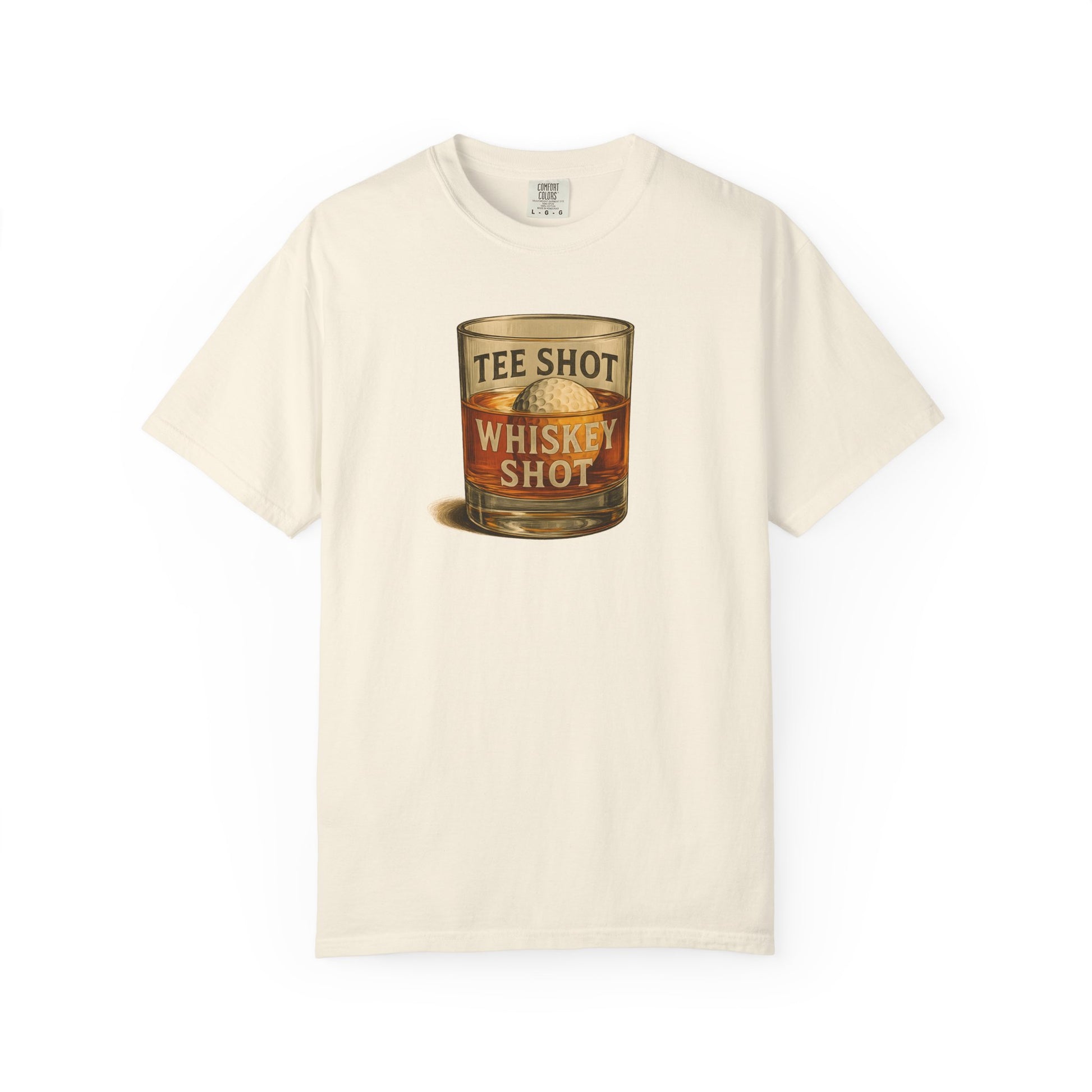 Double up on the good stuff. The Tee Shot Whiskey Shot tee blends golf and whiskey into one perfect round, featuring a vintage glass design with a golf ball twist. Ideal for players who know the only thing better than hitting the fairway is raising a glass after.