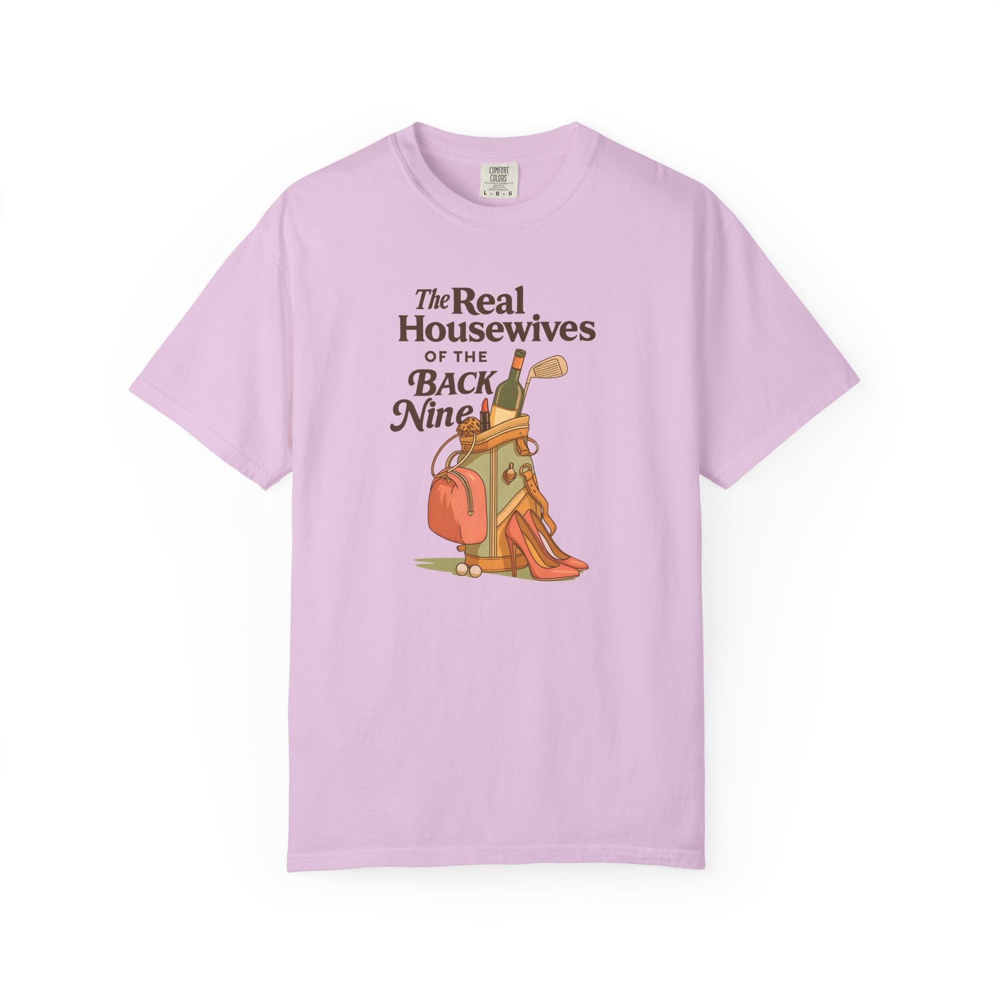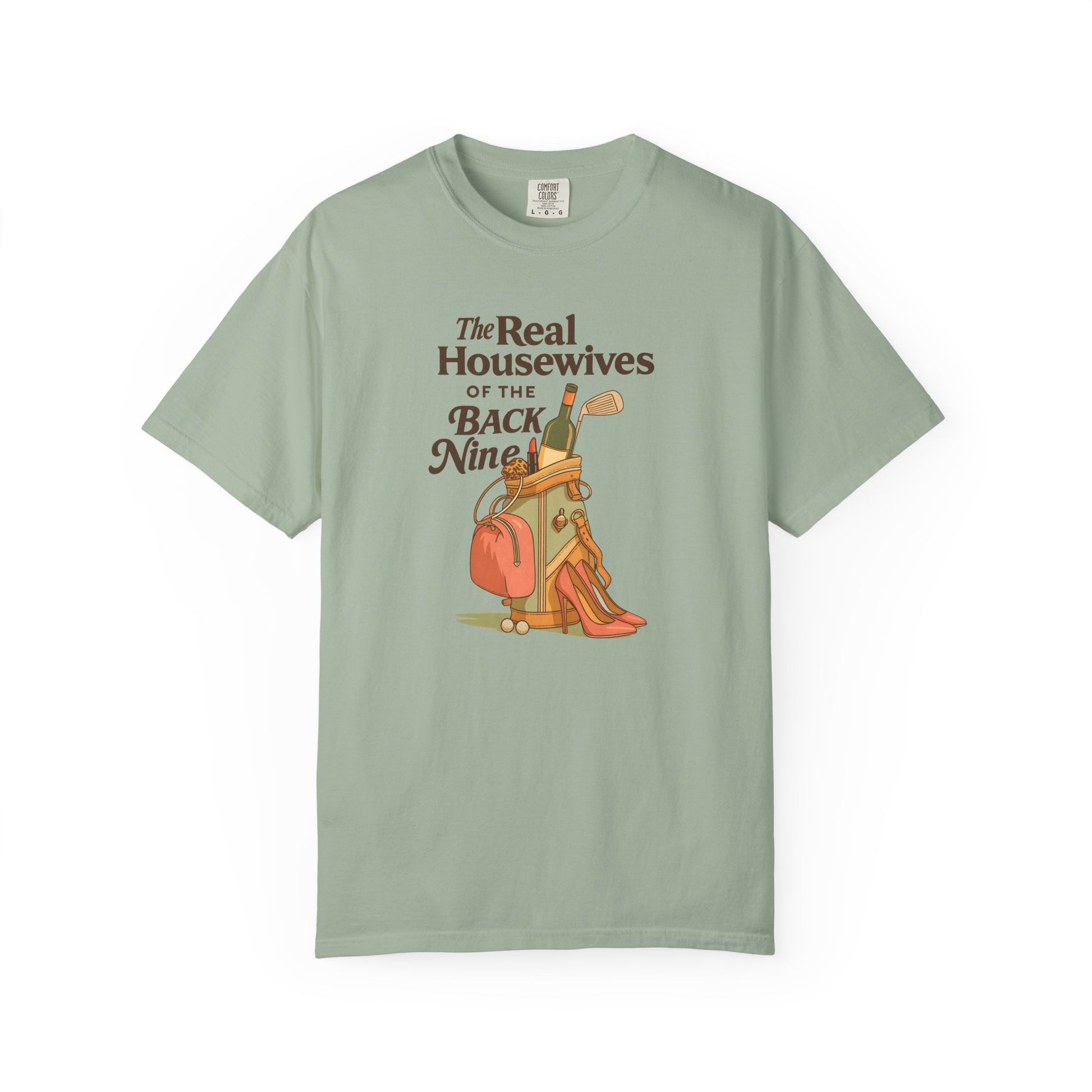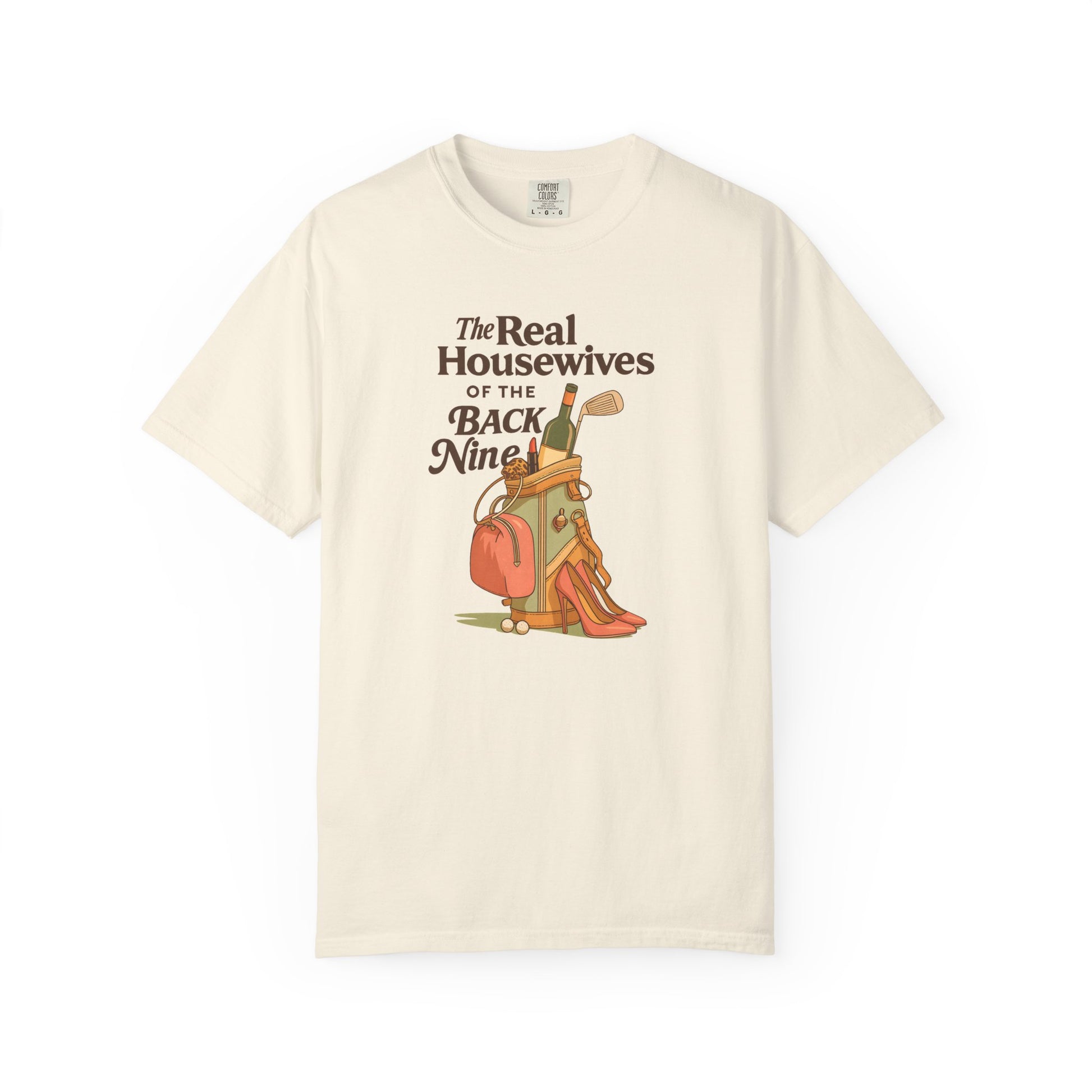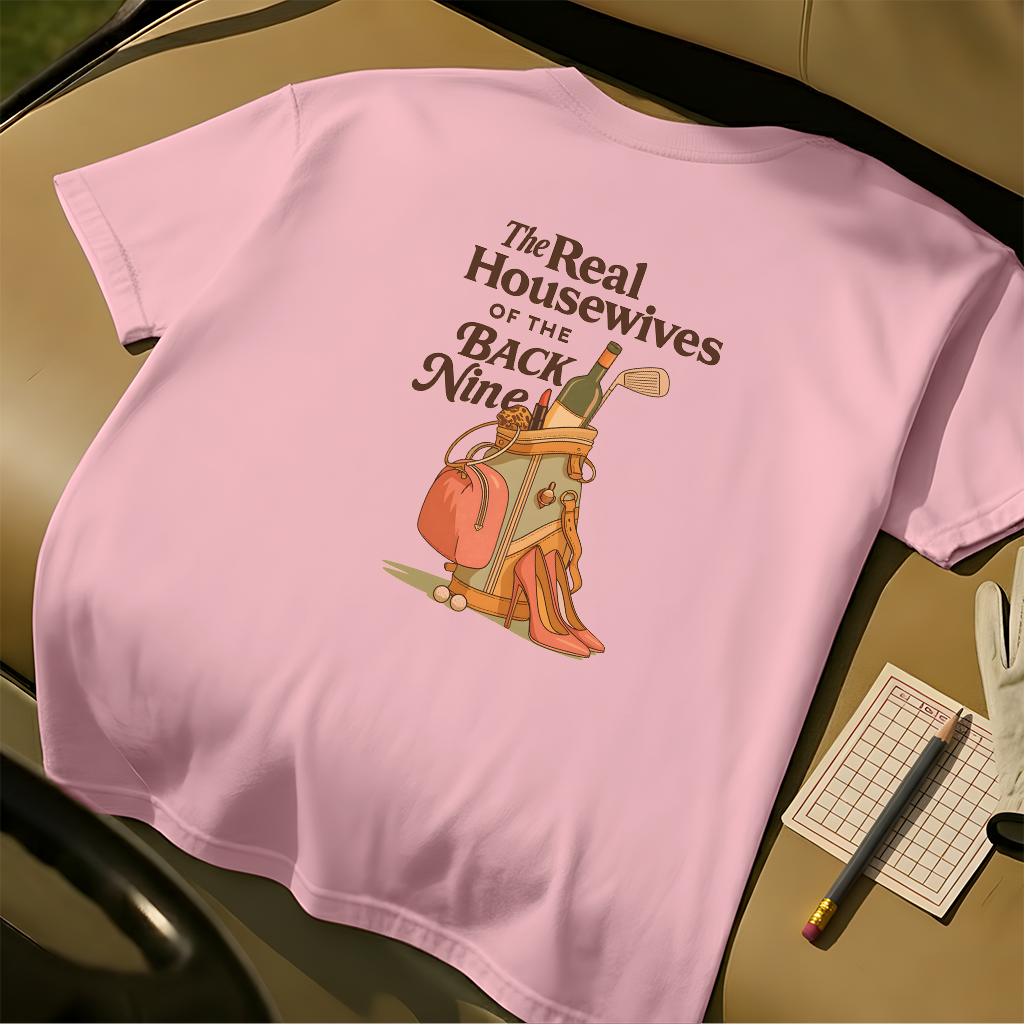 Because the back nine isn’t just about golf — it’s about style, wine, and a little sass. The Real Housewives of the Back Nine tee blends humor with retro-inspired design, featuring heels, lipstick, and a golf bag packed for more than just pars. Perfect for golfers who know that looking good is half the game.
