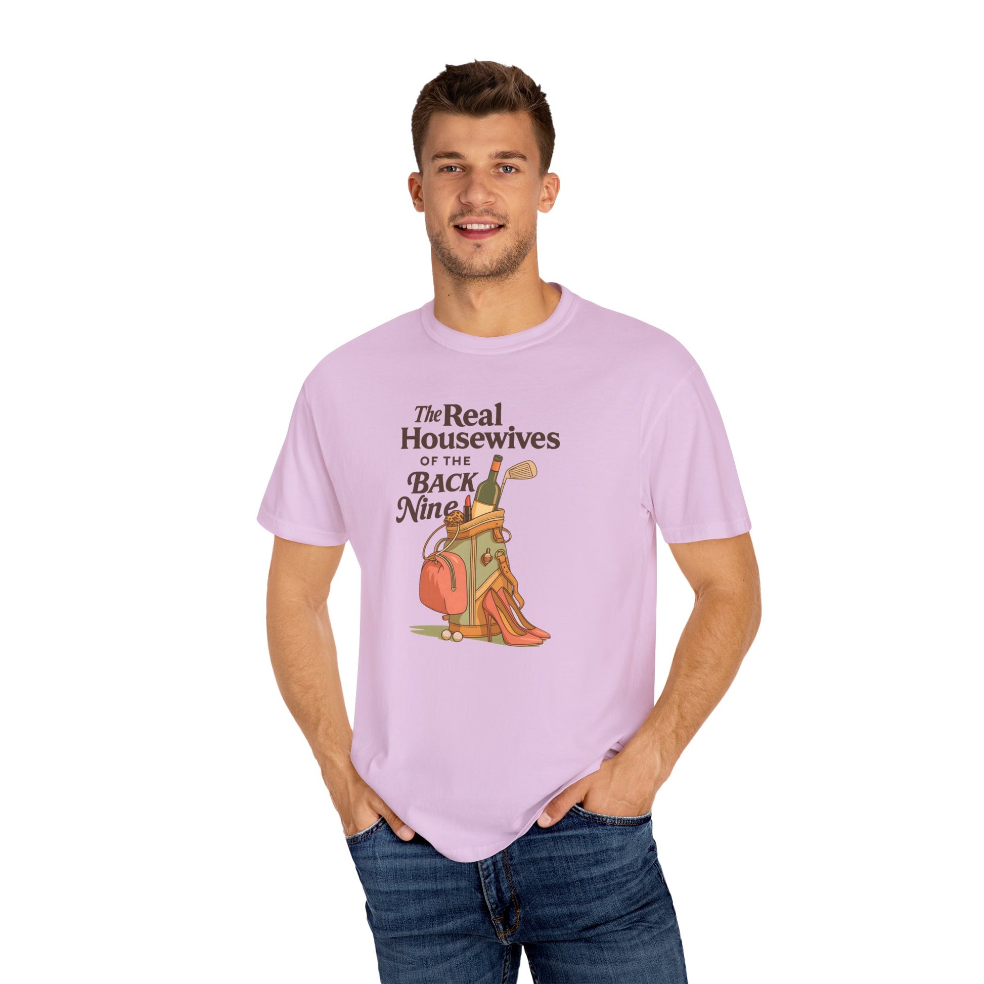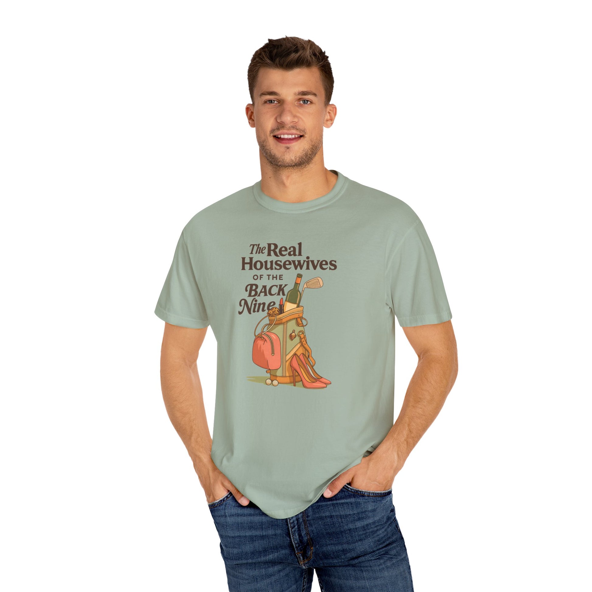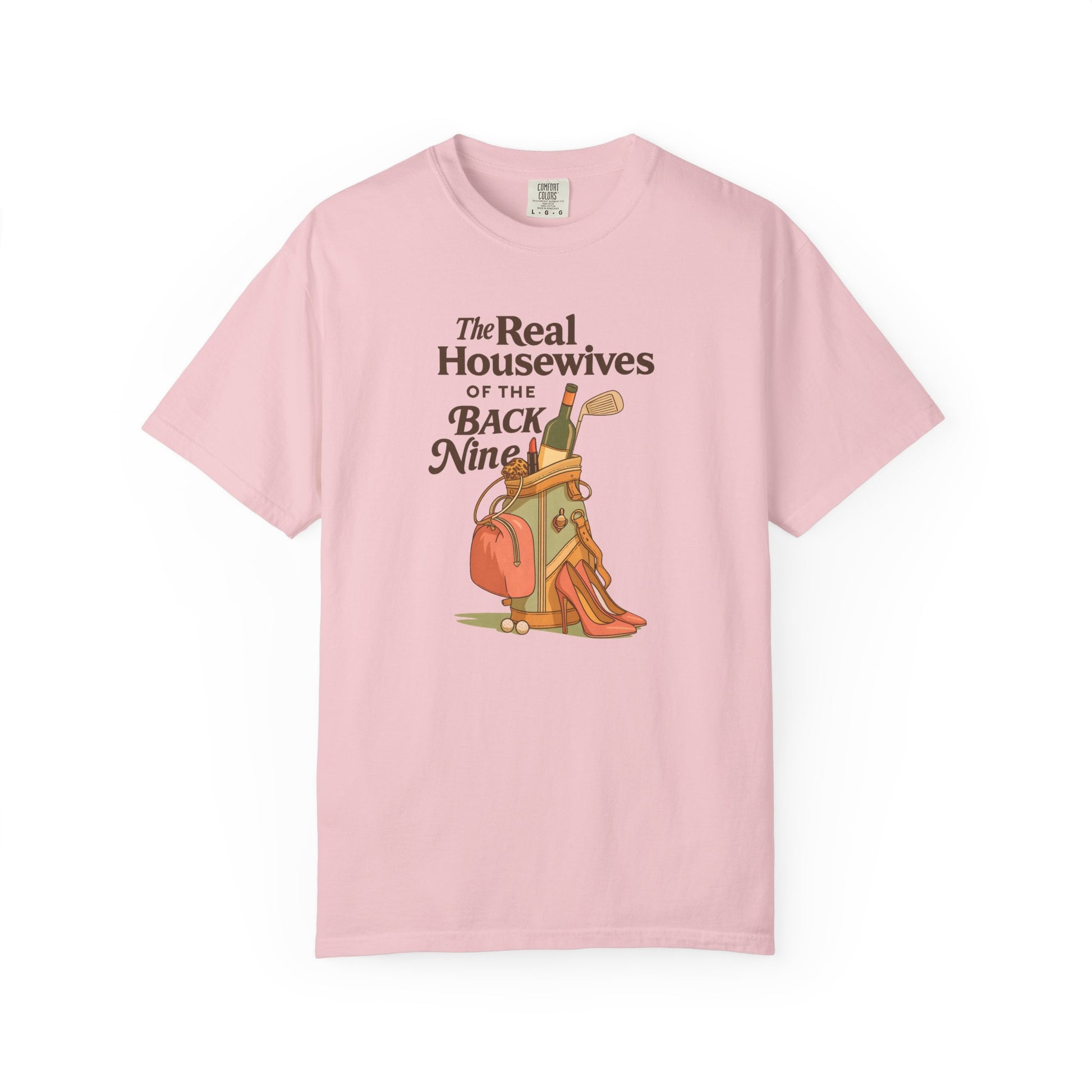 Because the back nine isn’t just about golf — it’s about style, wine, and a little sass. The Real Housewives of the Back Nine tee blends humor with retro-inspired design, featuring heels, lipstick, and a golf bag packed for more than just pars. Perfect for golfers who know that looking good is half the game.