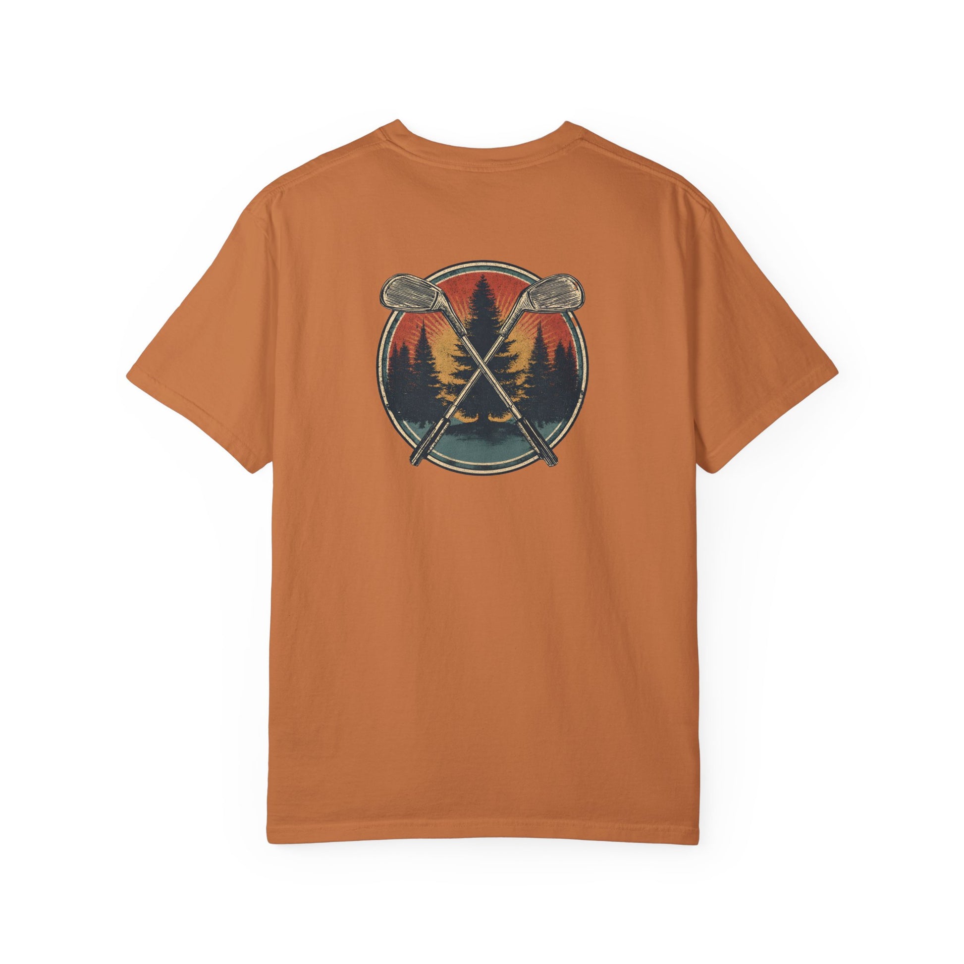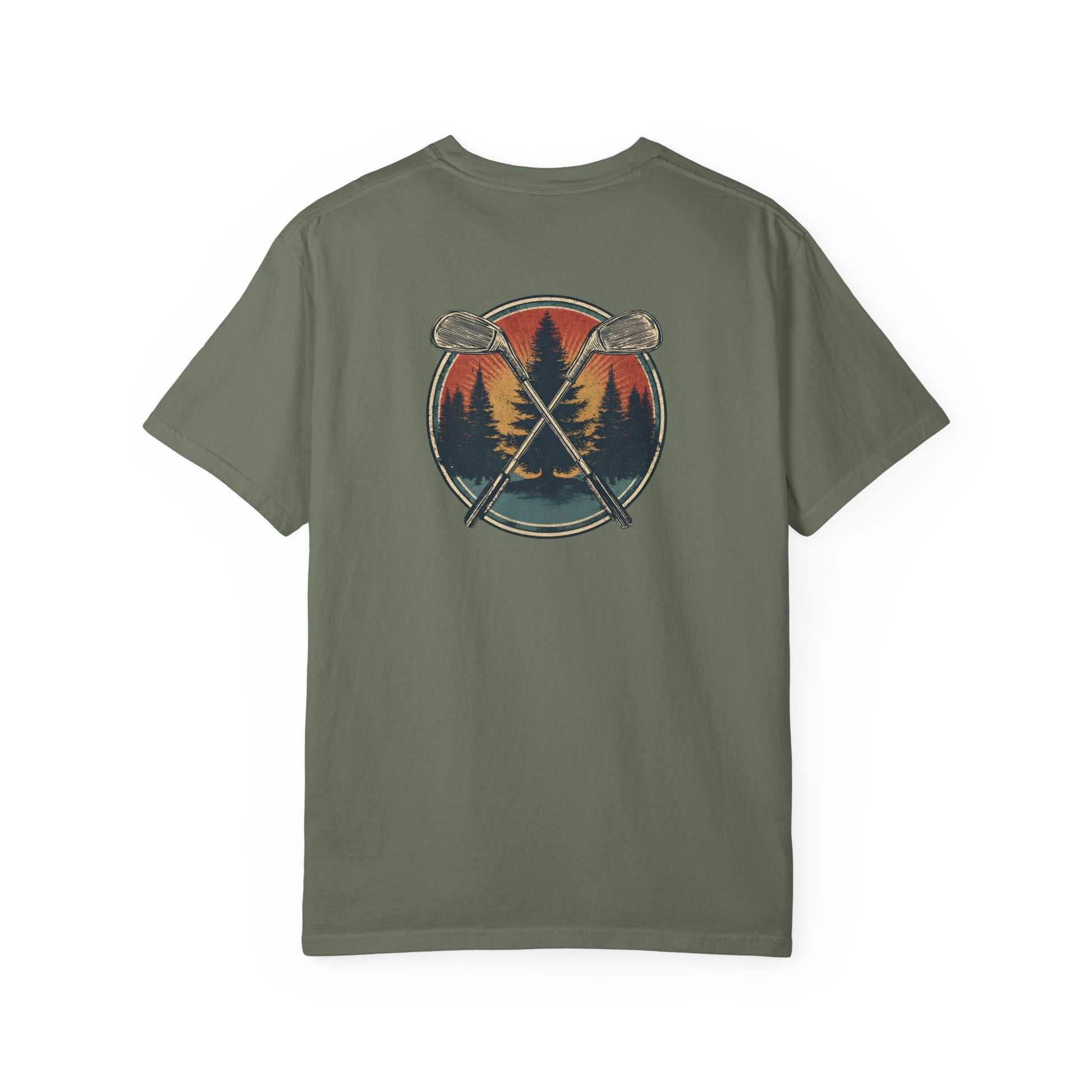 This vintage-inspired design combines crossed irons with a bold forest backdrop, blending the spirit of the outdoors with the game of golf. A rugged yet stylish tee for golfers who feel at home both on the fairway and in nature.
