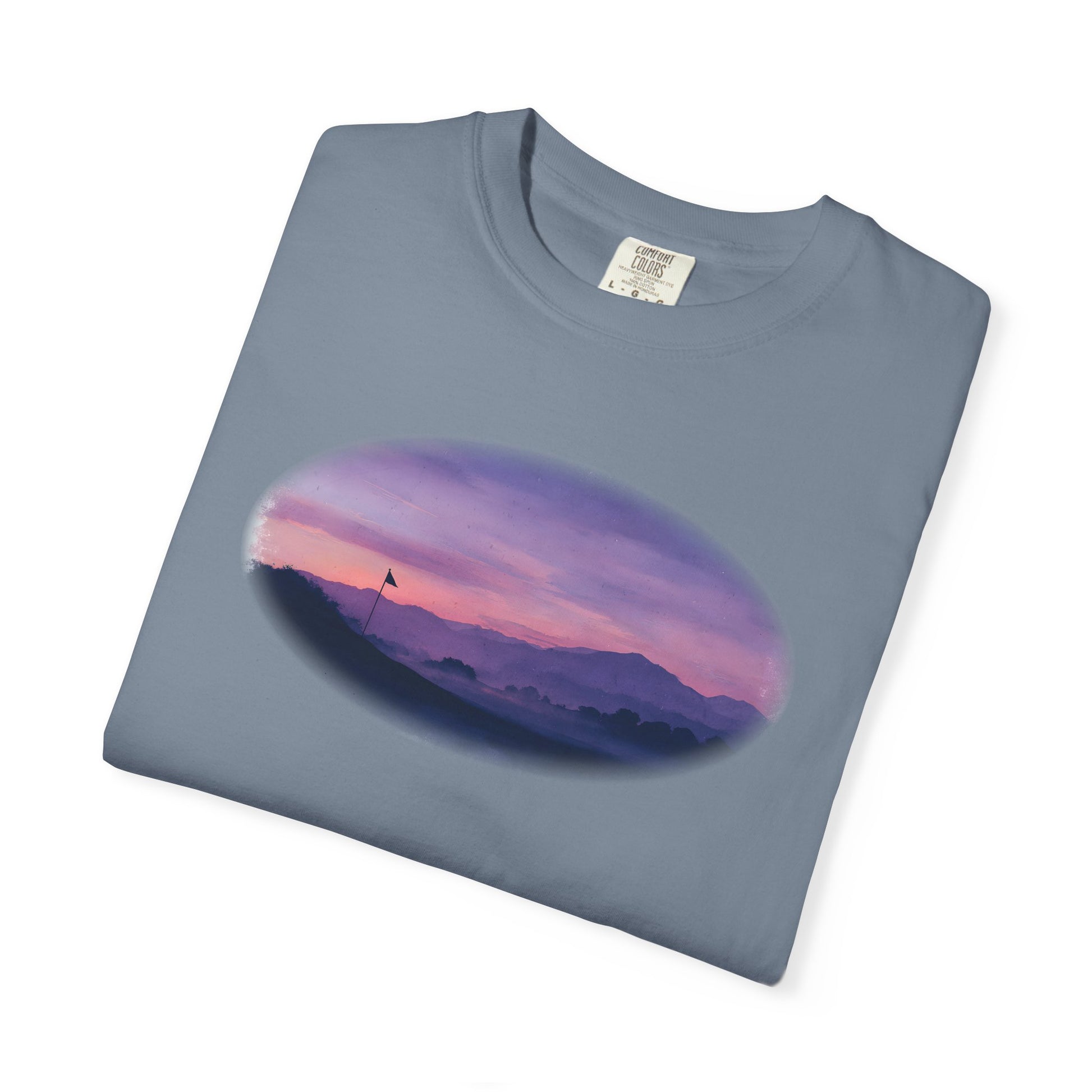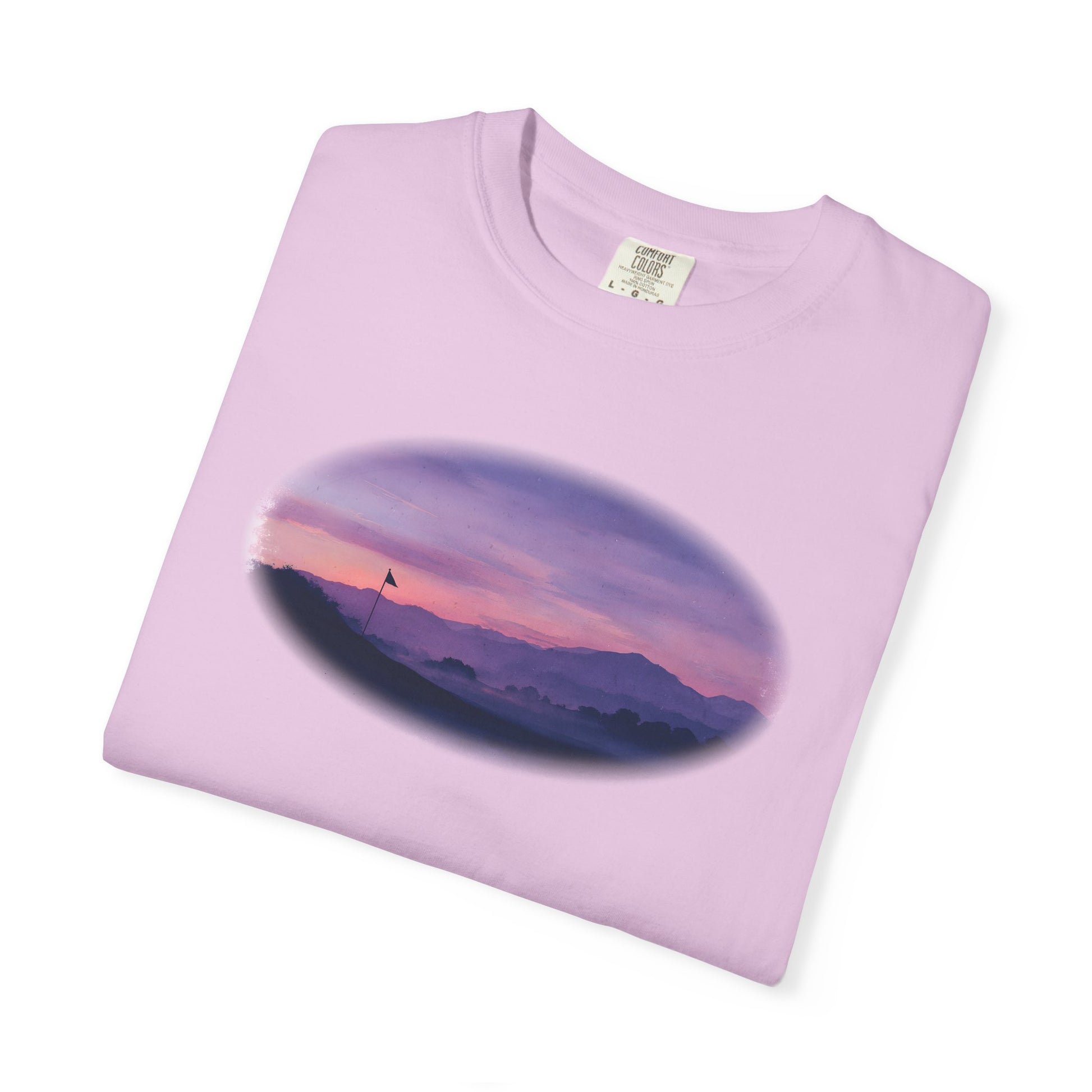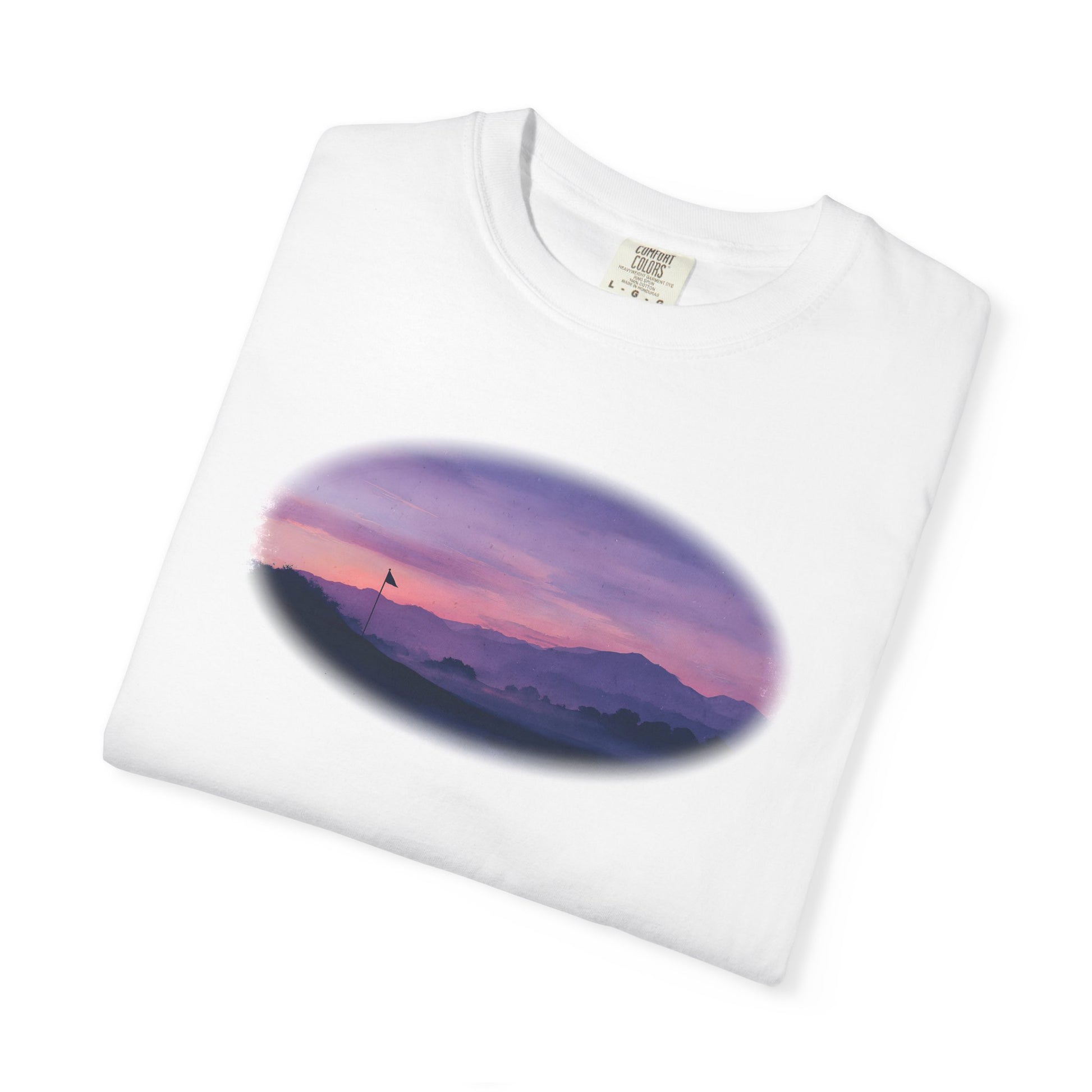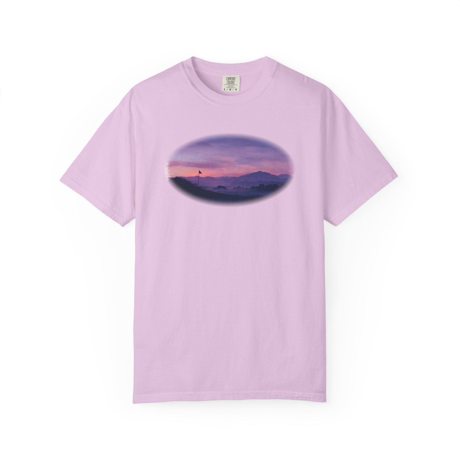 Bathed in soft purples and fading light, the Twilight Fairway tee captures the quiet magic of golf at day’s end. With a silhouetted flag against misty hills and a glowing sky, this oil-painted design is a serene reminder that some of the best rounds happen after sunset.