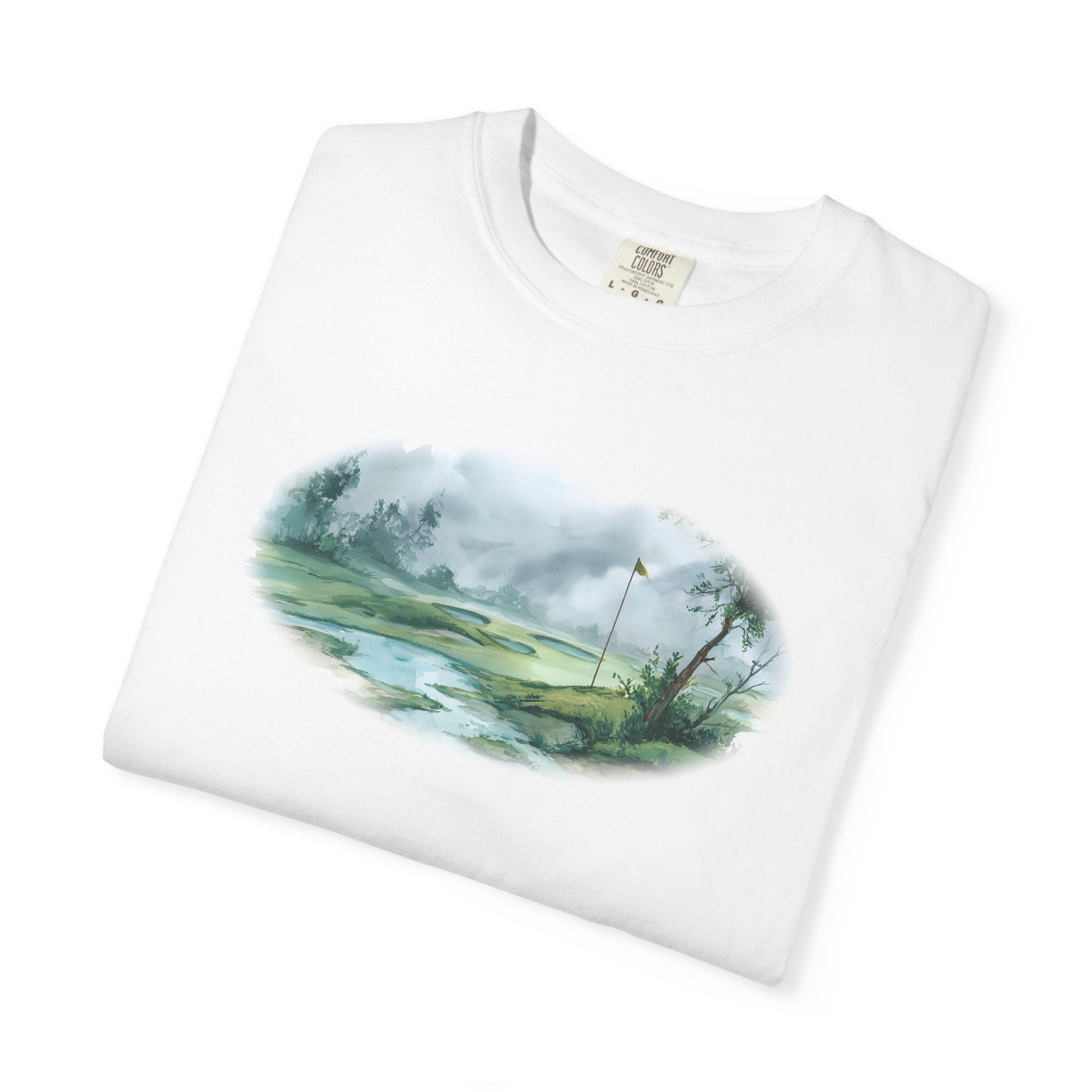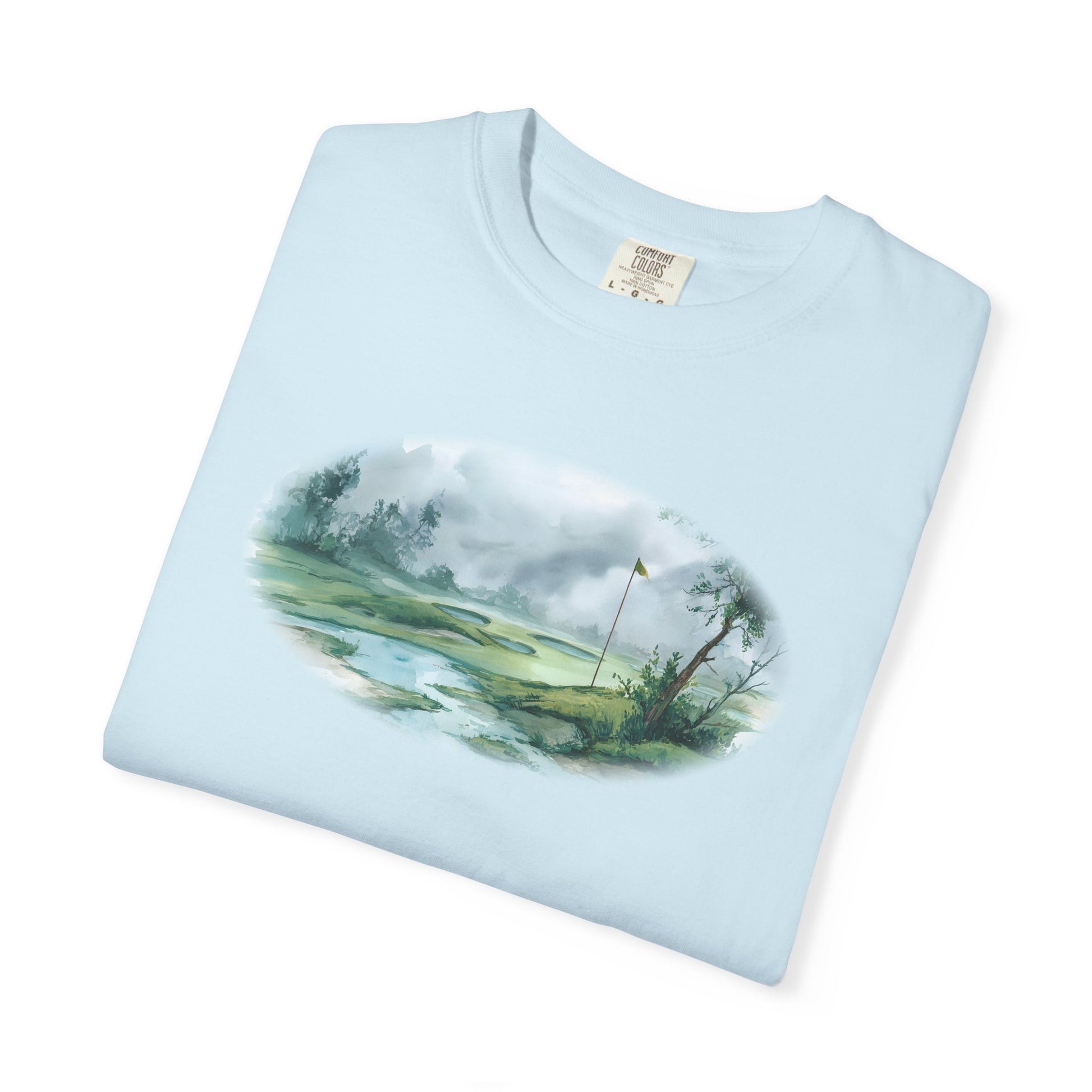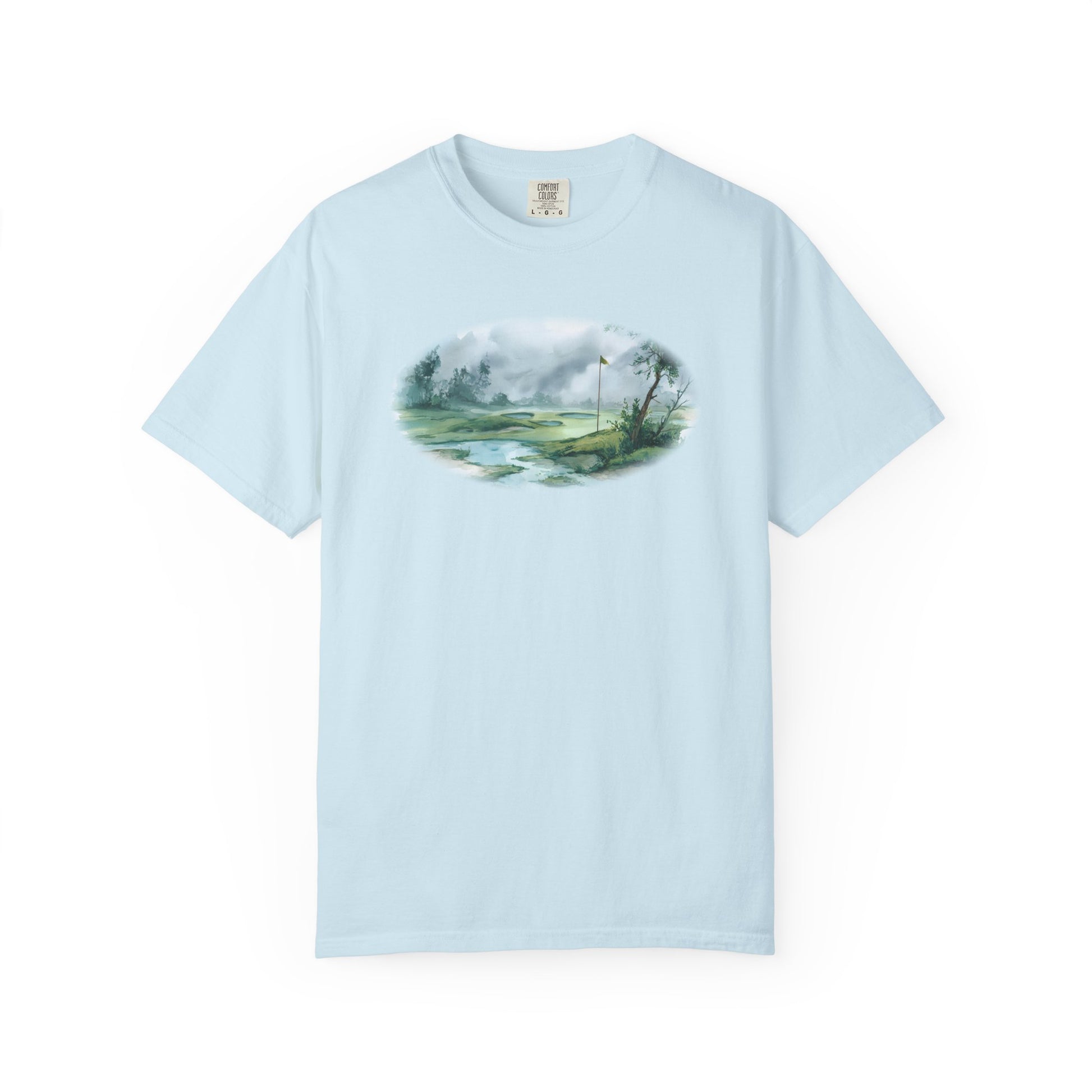Soft mist, winding waters, and a flag standing tall through the haze. The Whispering Marsh tee captures the quiet beauty of golf played on nature’s edge. With its oil-painted tones of blue and green, this design is a reminder that every course has its own story to tell.